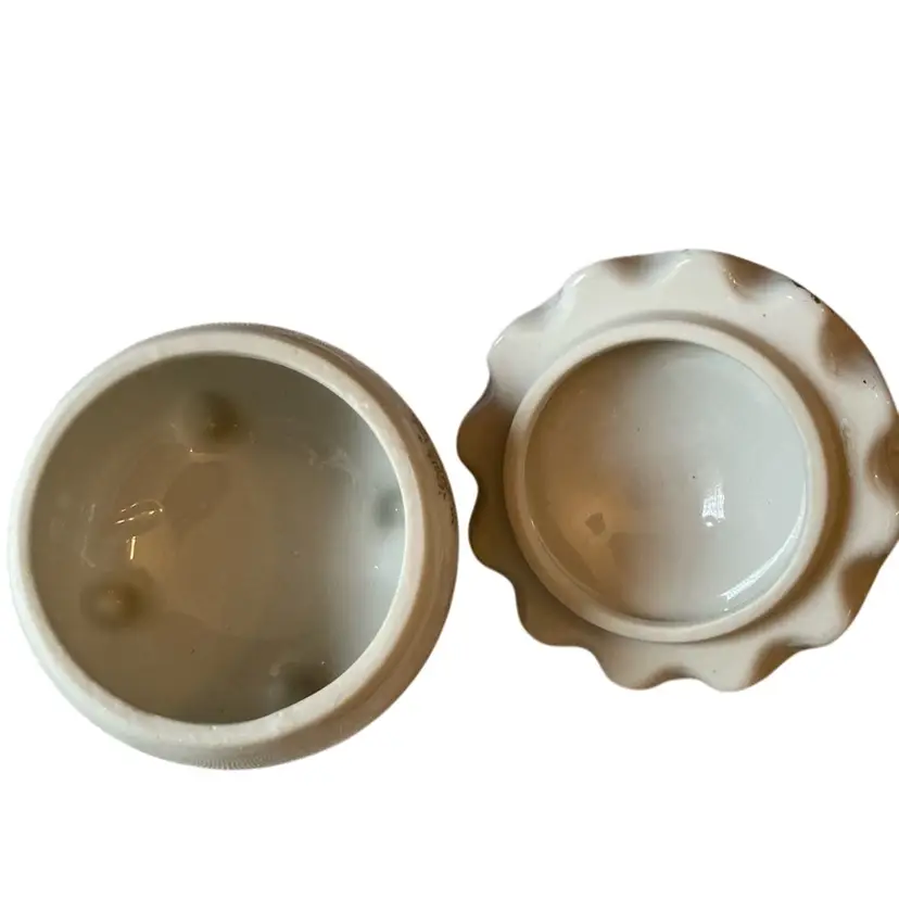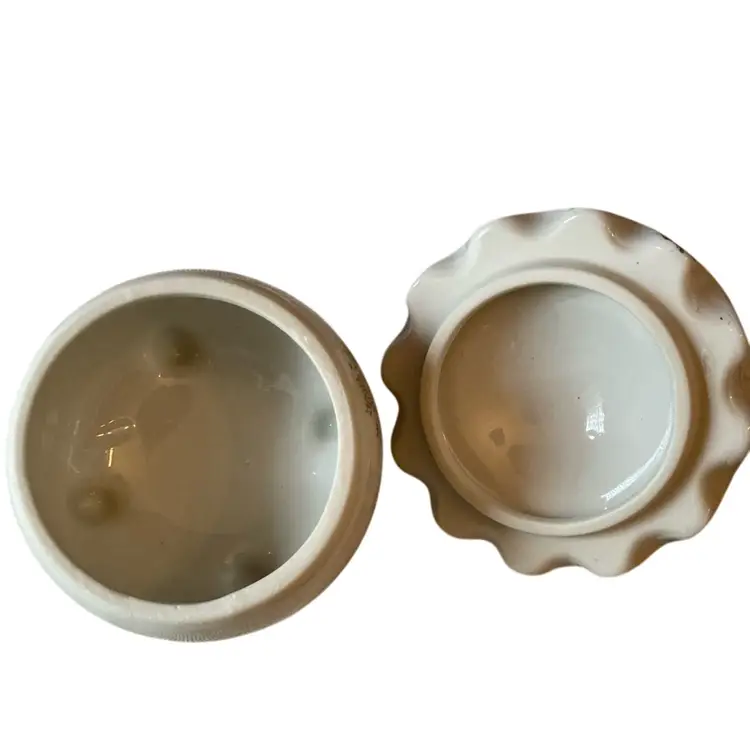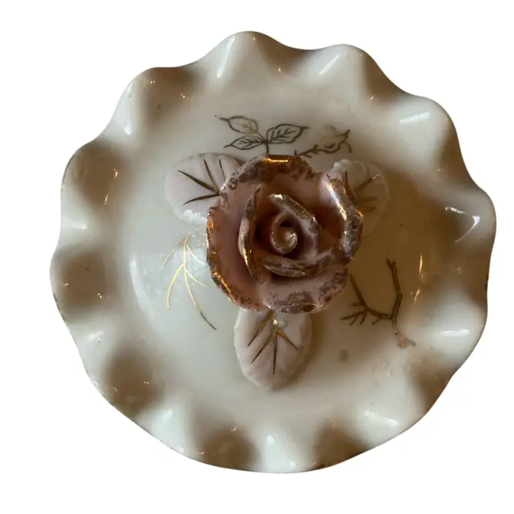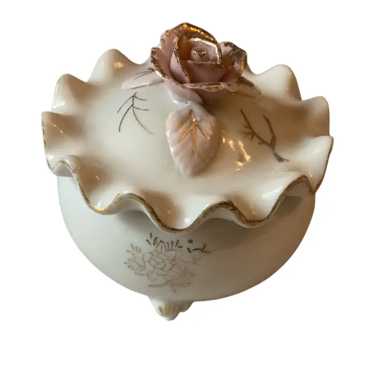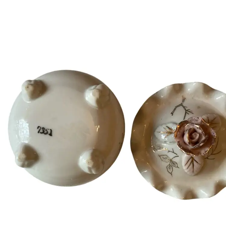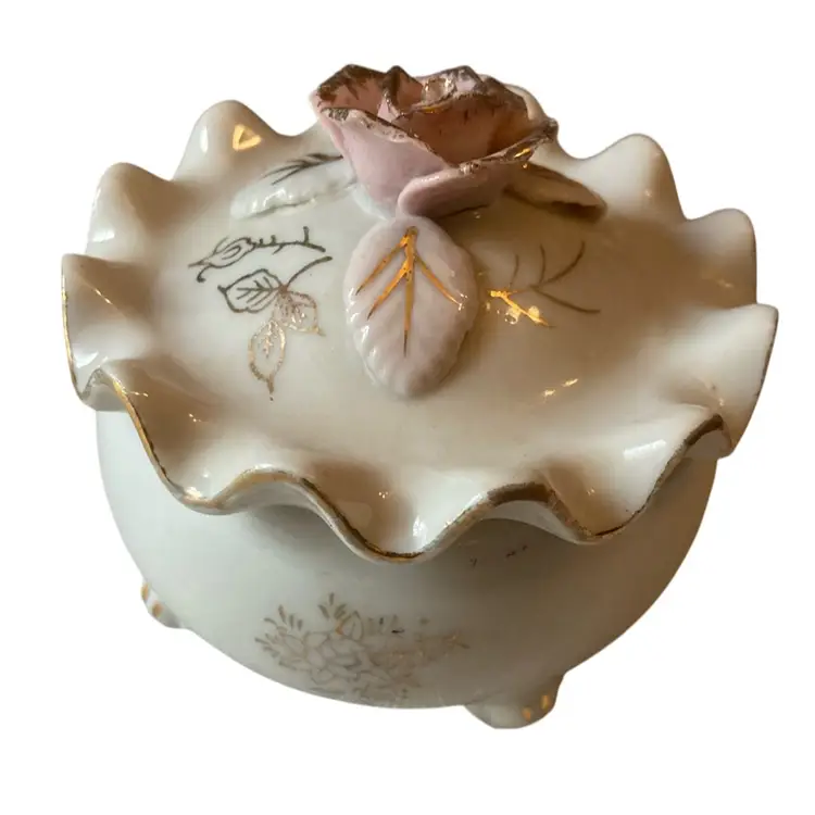 2.5” wide and 2.5” tall. White trinket box with pink and gold embellishments. No cracks or chips.
