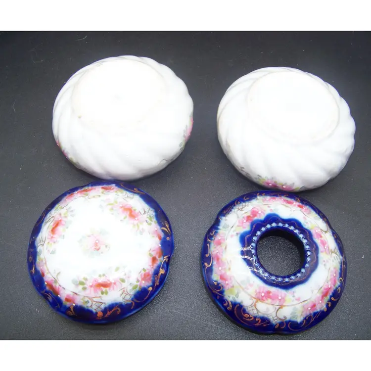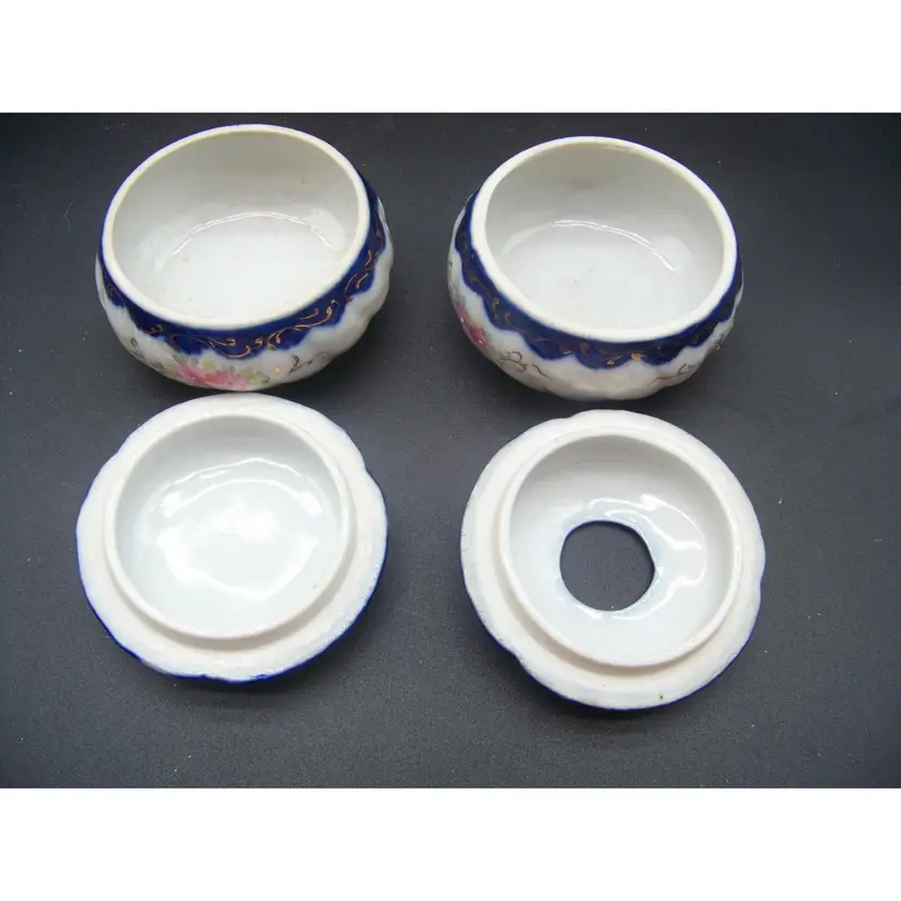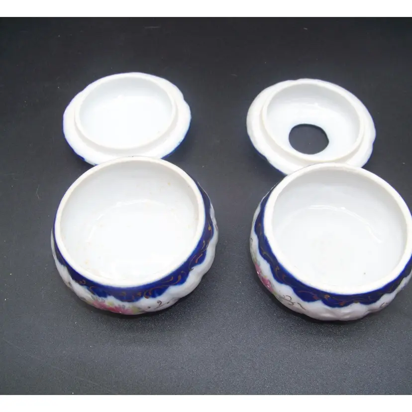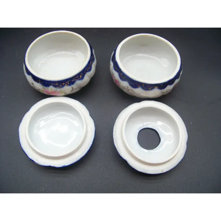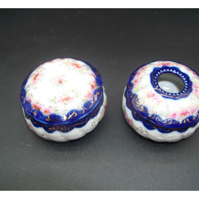 Lovely set of porcelain trinket box and hair receiver. They are white with blue and gold trim with pink roses. They are 2" tall and 3" diameter. No chips or cracks.