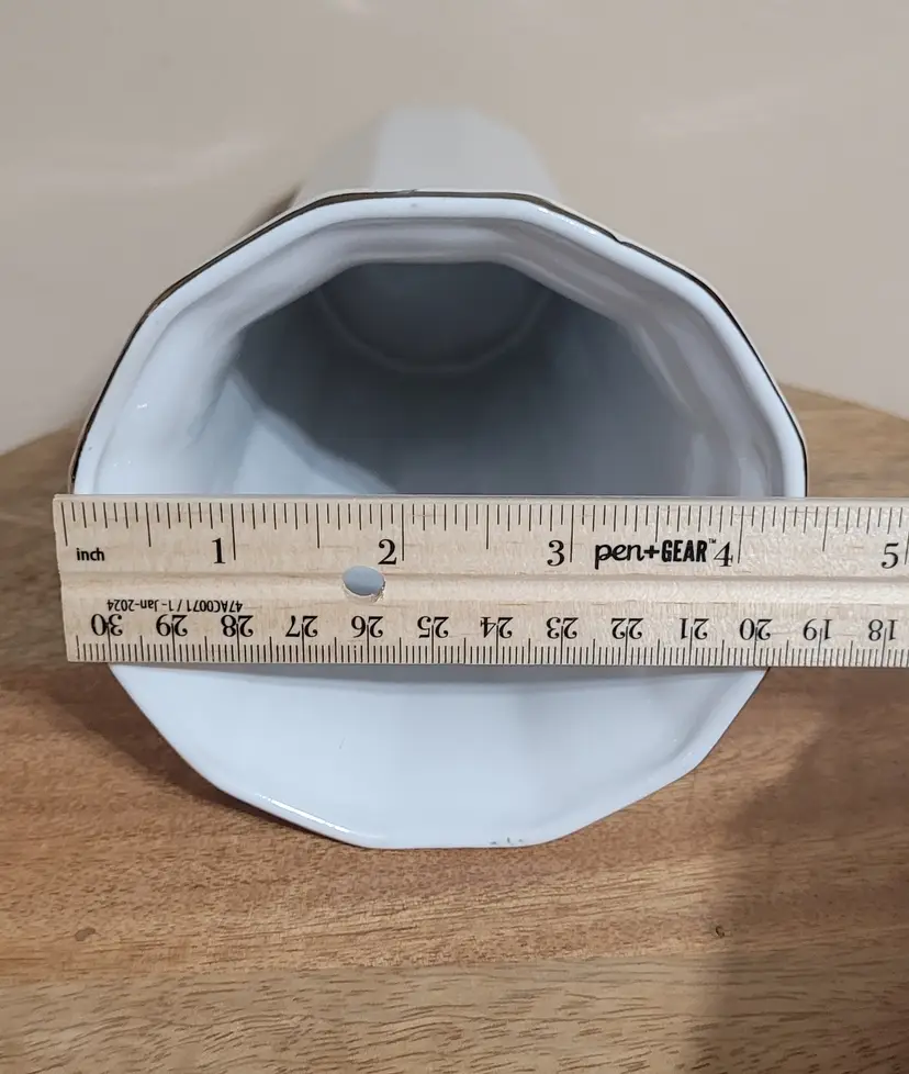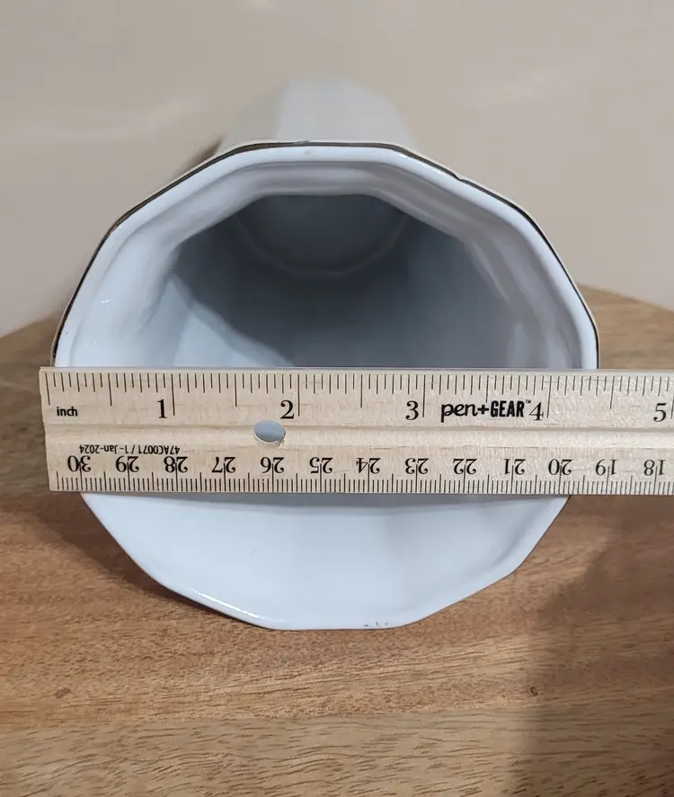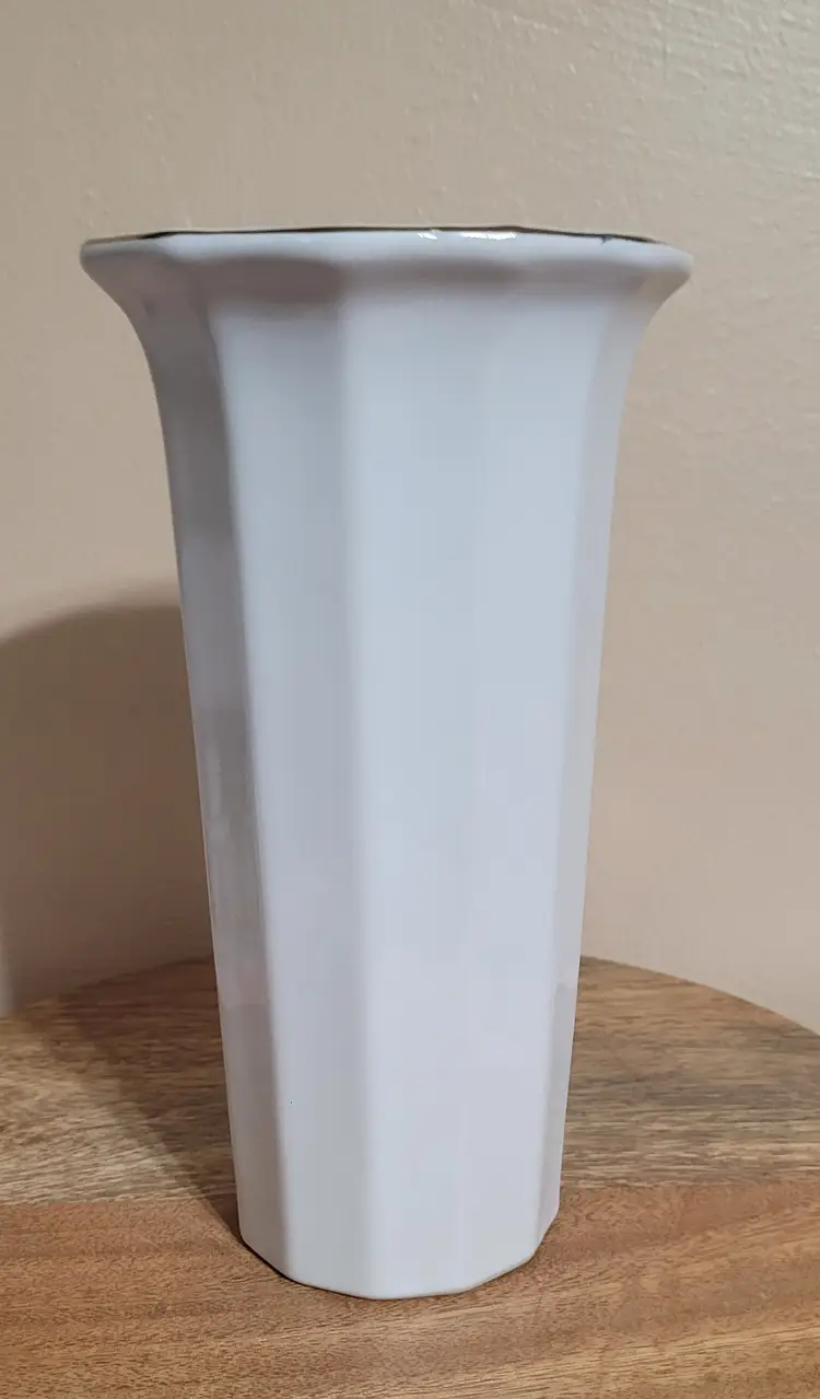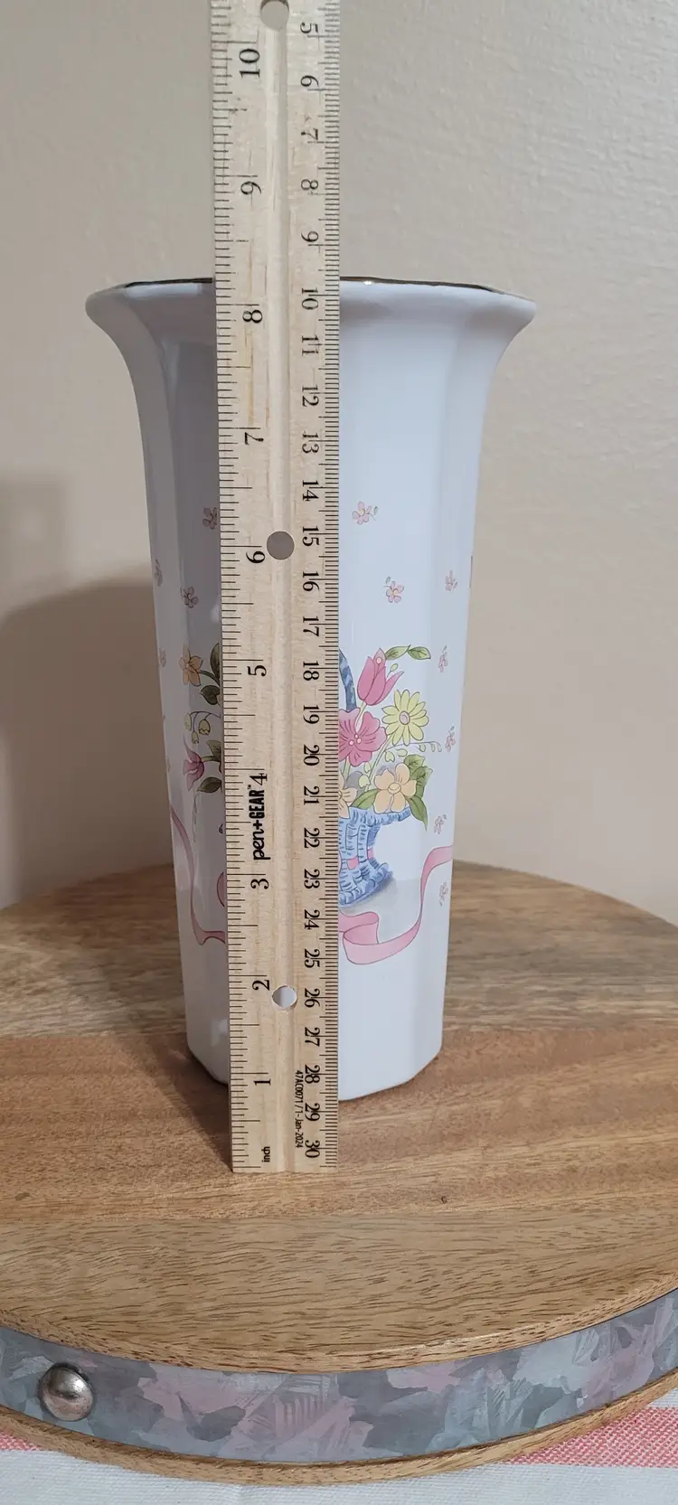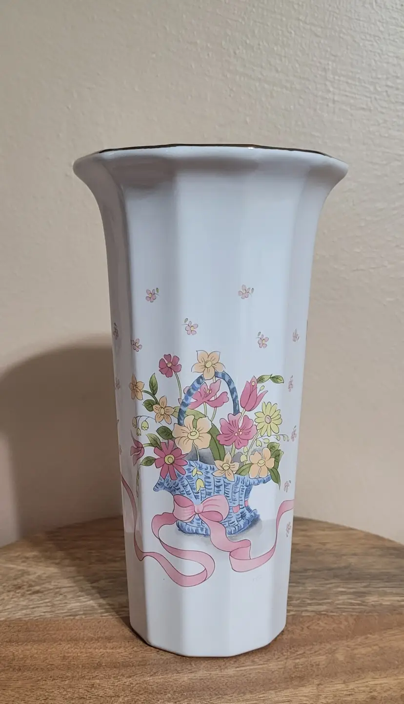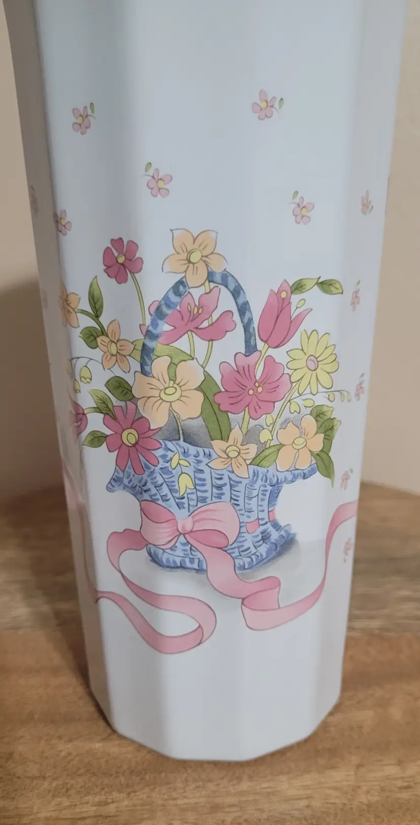 This vintage porcelain vase features a beautiful white multi-colored floral basket pattern, making it a charming decorative collectible for any room. Standing at 8 inches tall, this heptagon-shaped vase is perfect for all occasions and adds an elegant touch to any space. Manufactured in Japan in 1992, this vase is easy to clean with a damp cloth and is a unique addition to any collection.