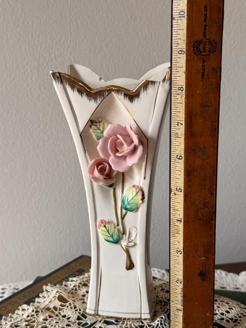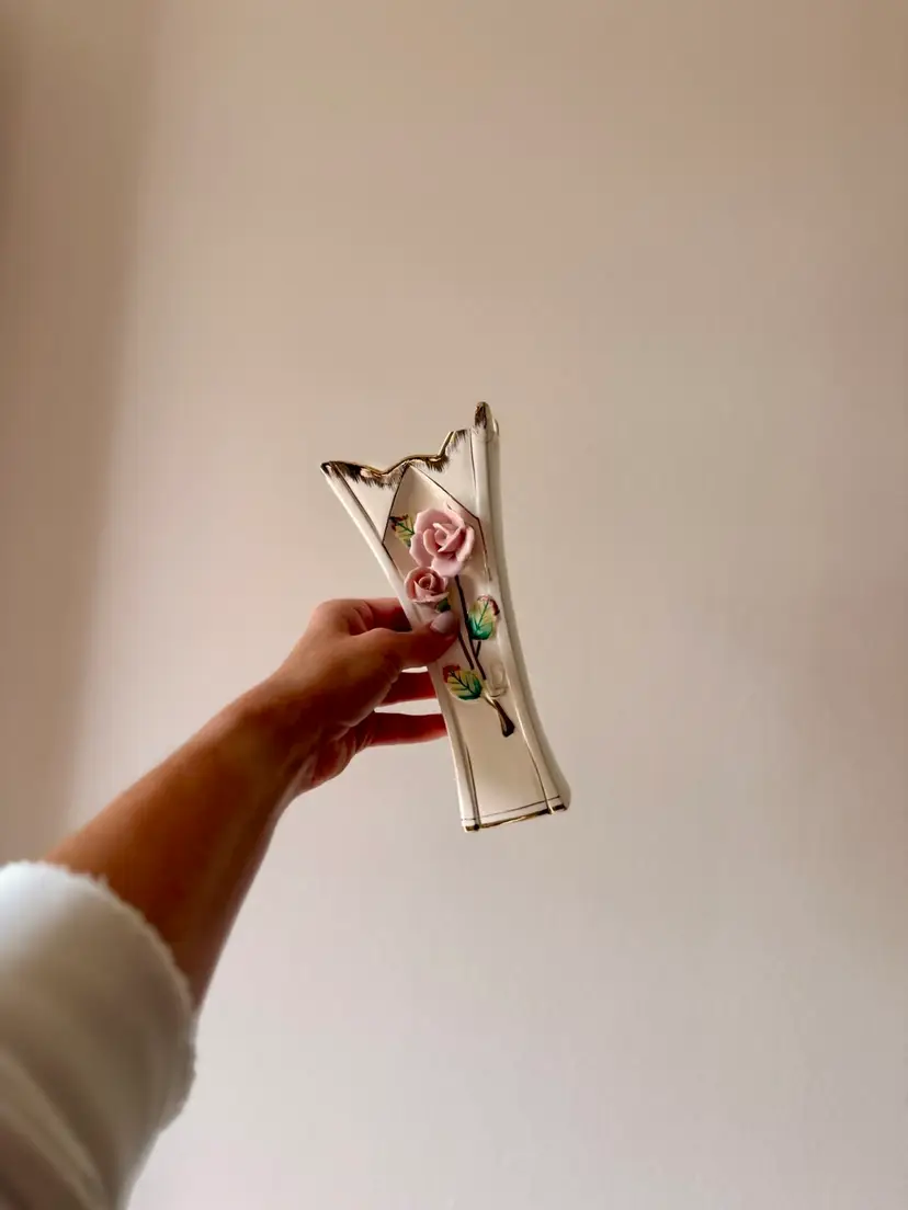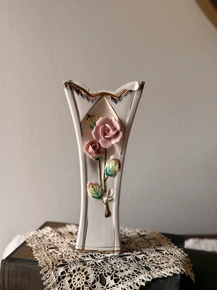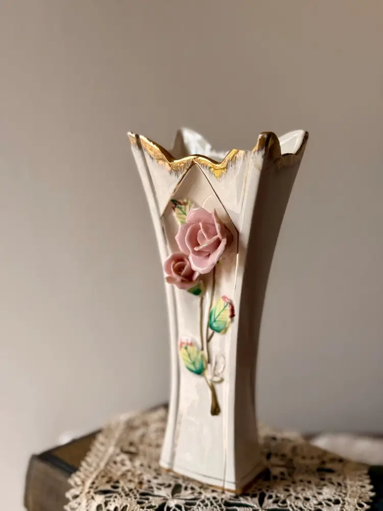 Lovely vintage porcelain vase with a romantic shabby chic look. This piece features soft pink applied roses, gold trim, and an elegant flared shape. It still displays beautifully, especially in a cottage, vanity, or guest room setting.