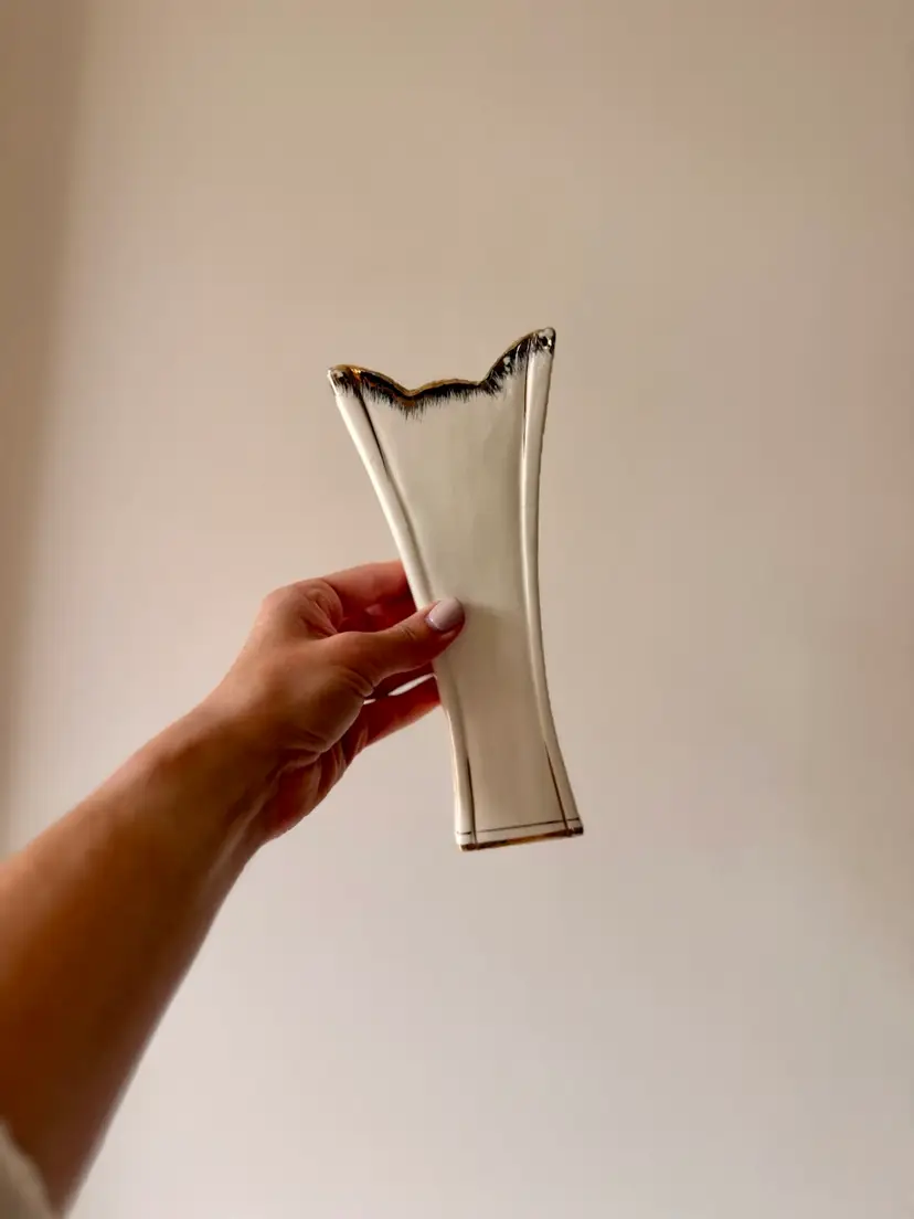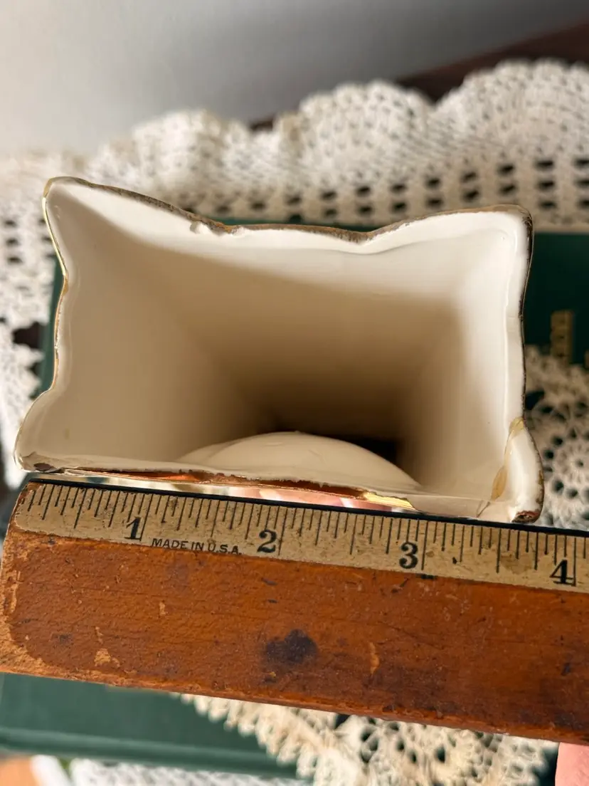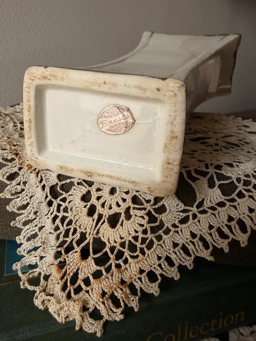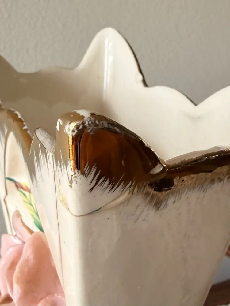 Lovely vintage porcelain vase with a romantic shabby chic look. This piece features soft pink applied roses, gold trim, and an elegant flared shape. It still displays beautifully, especially in a cottage, vanity, or guest room setting.