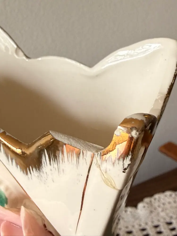Condition: vintage condition with visible wear. There is loss to the gold trim and some cracking/crazing and old damage/repair near the rim, so please review all photos closely. Priced accordingly for display.