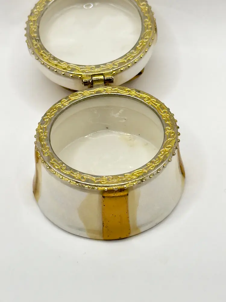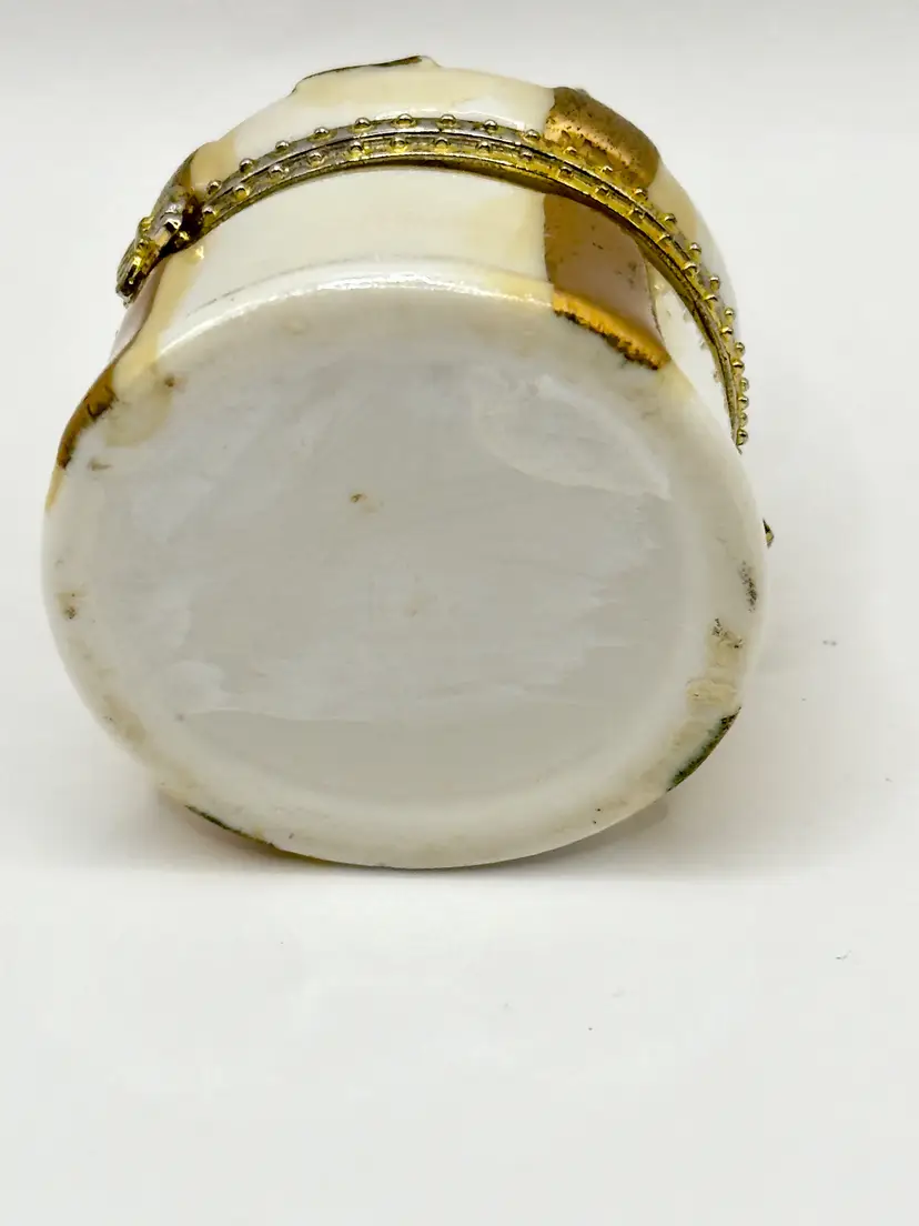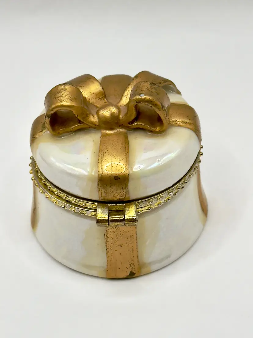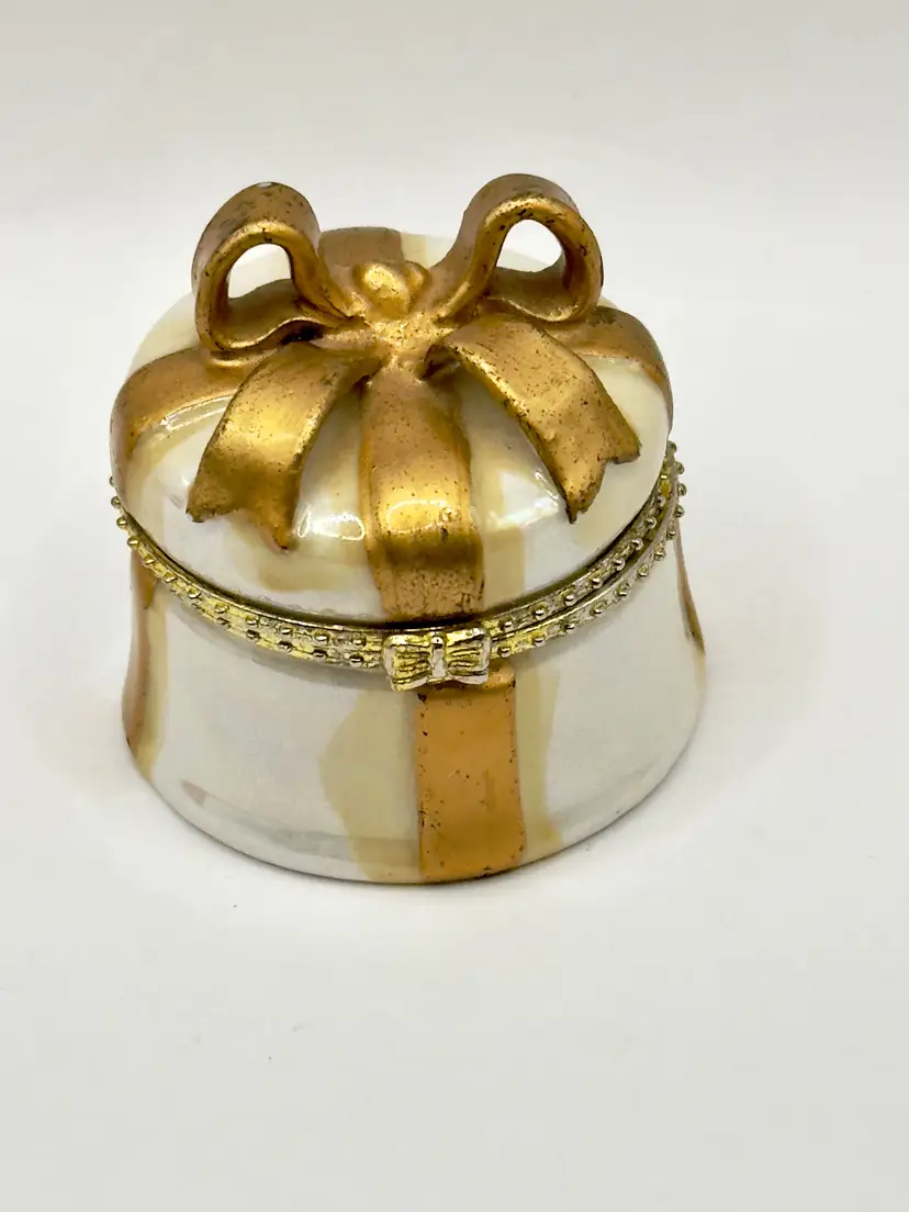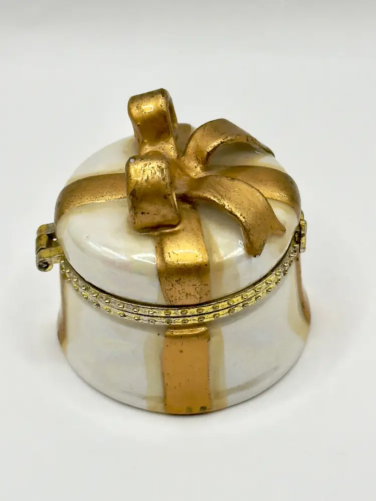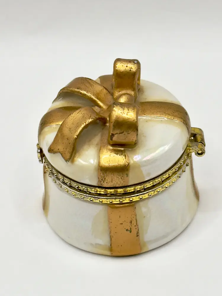 This charming vintage trinket box is designed to look like a beautifully wrapped gift box, complete with a gold bow on top. Perfect for storing small treasures or as a decorative piece. No chips or cracks. Measures 2x2 inches. Weighs 2oz.