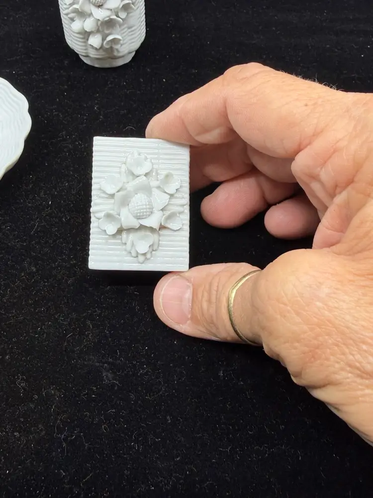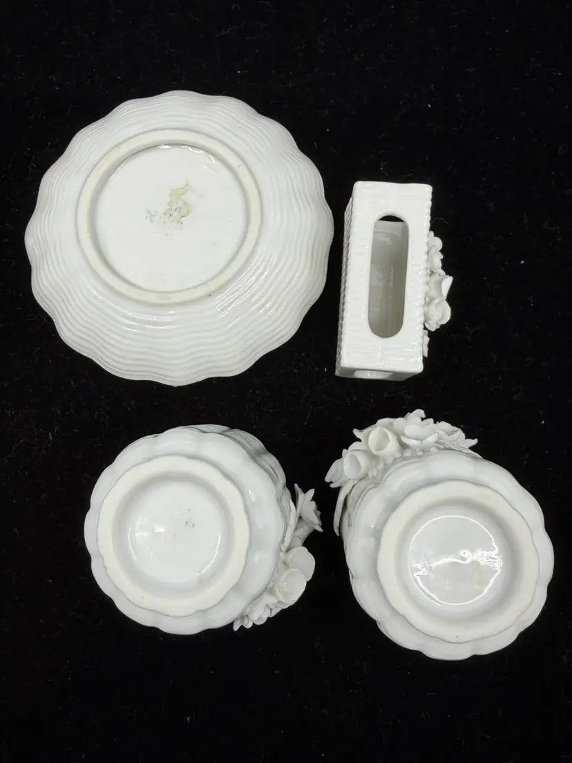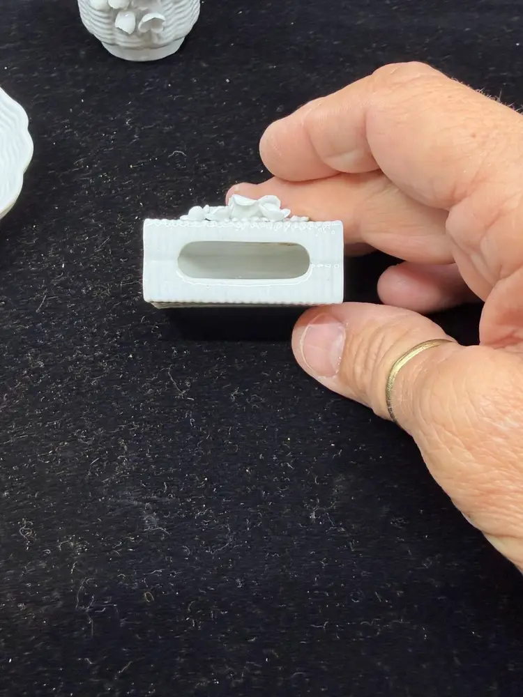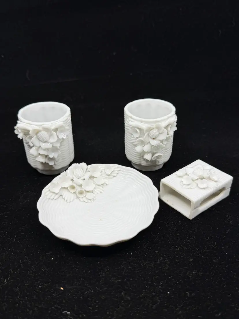 Good vintage condition. Dish-3.5”. Match holder- 1.25 x 1.75”. Cigarette holder- 1.5 x2.25”