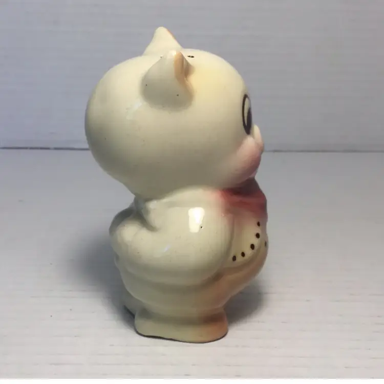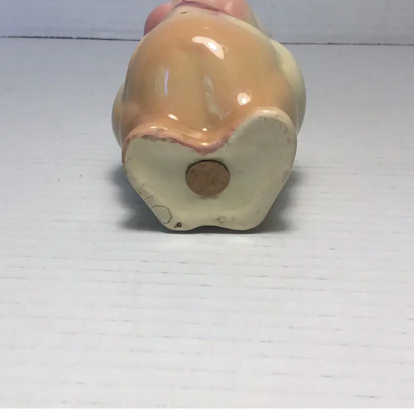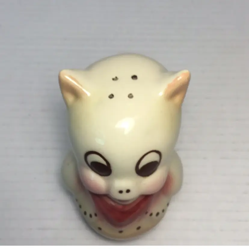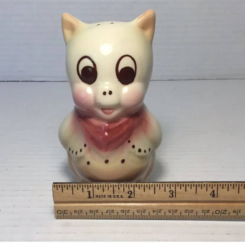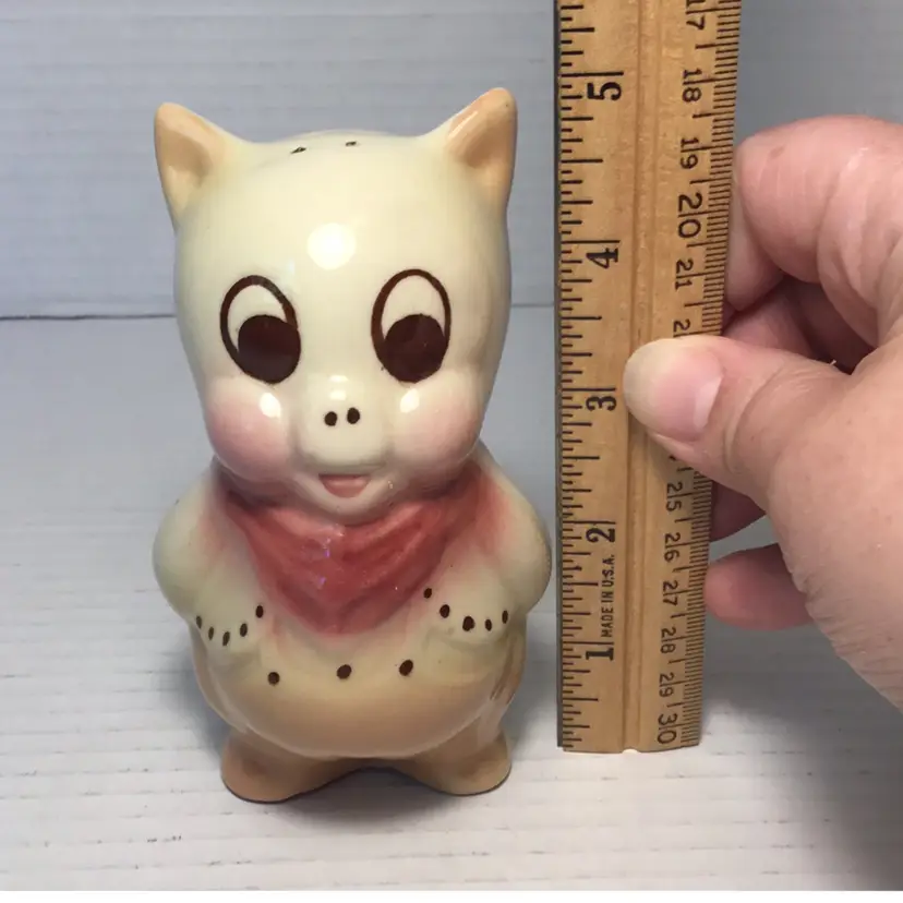 This is a super cute PorkyPig cowboy shaker . He measures about 5” tall and 2.5” wide. He’s in good condition with no chips or cracks and still has the cork, looks like he had a small repair on the bottom edge at one time. Please see pictures for details.