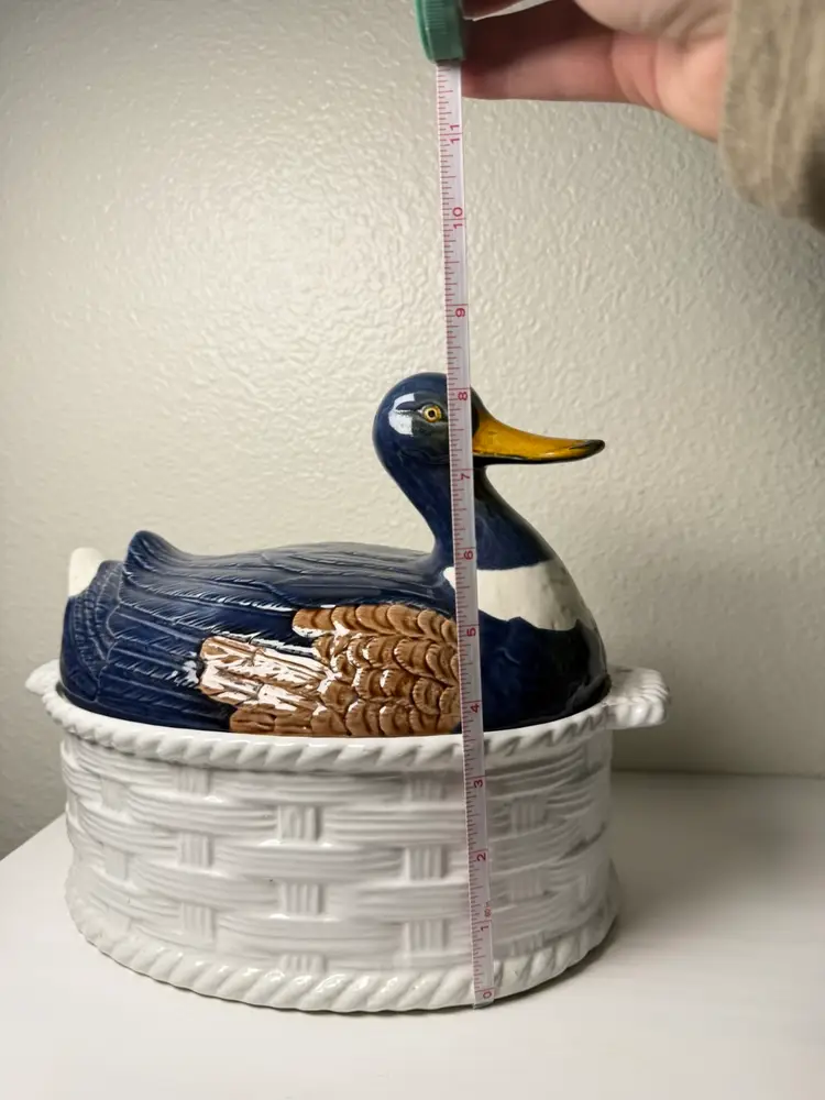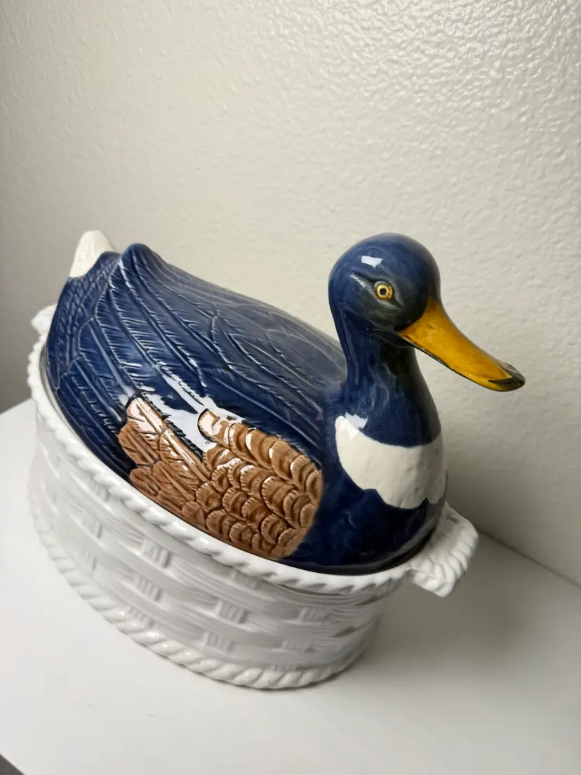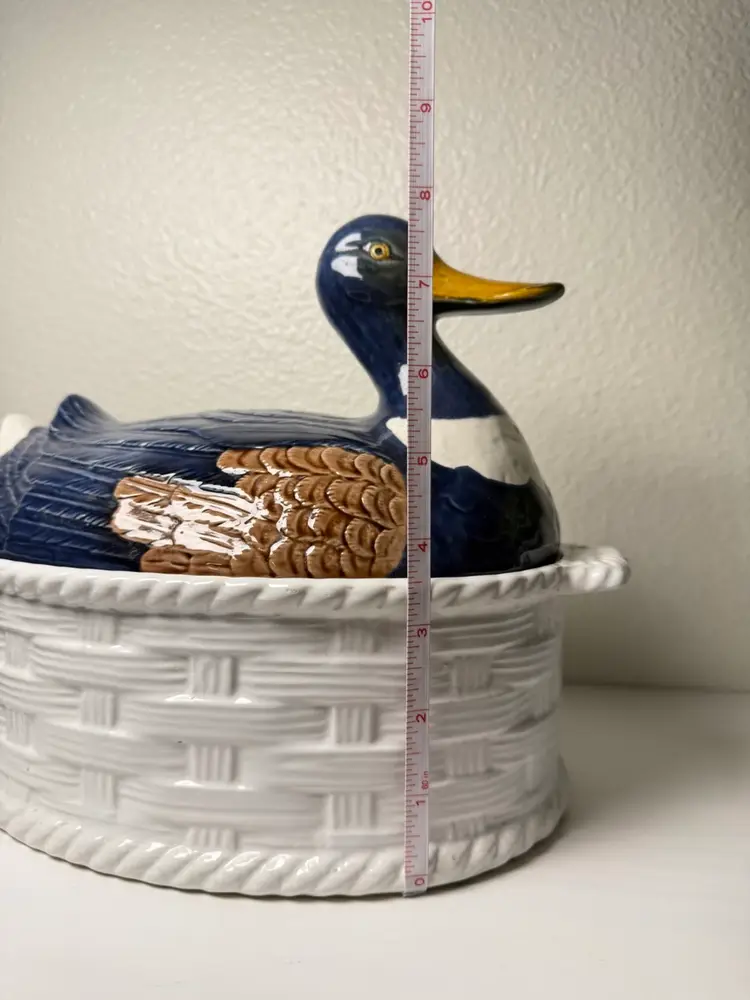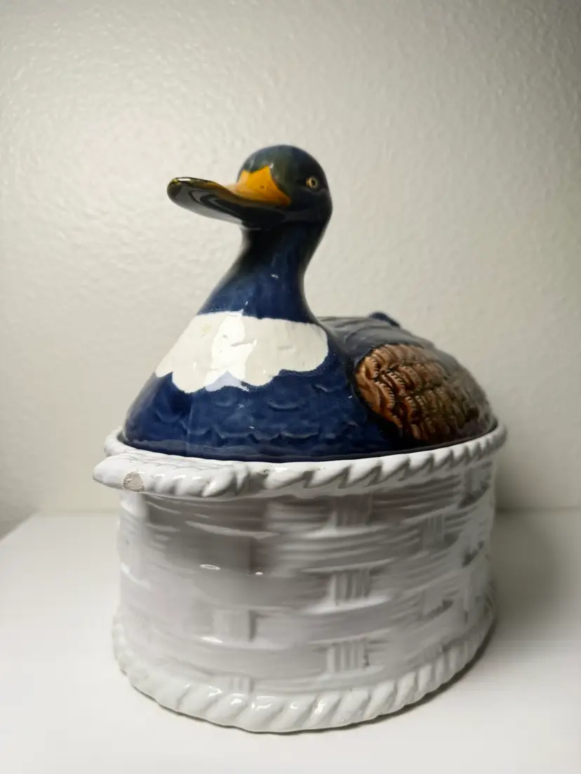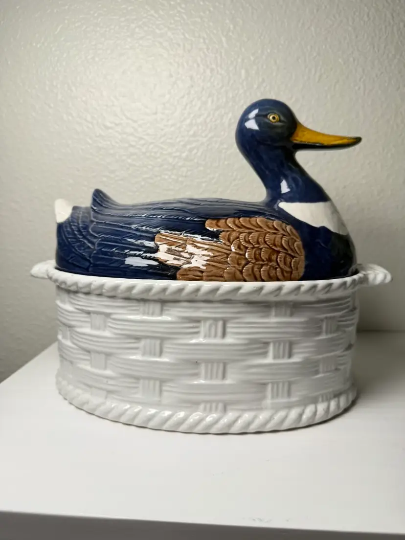 Vintage Portugal Mallard Duck Tureen Covered Ceramic Dish Basket Weave 11"