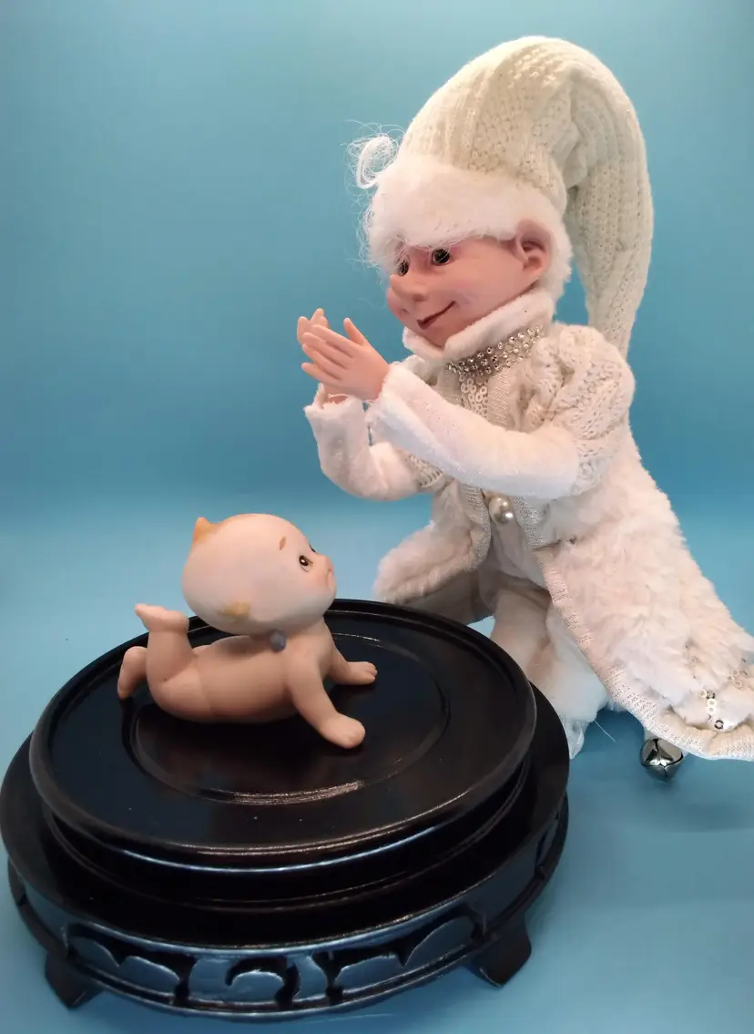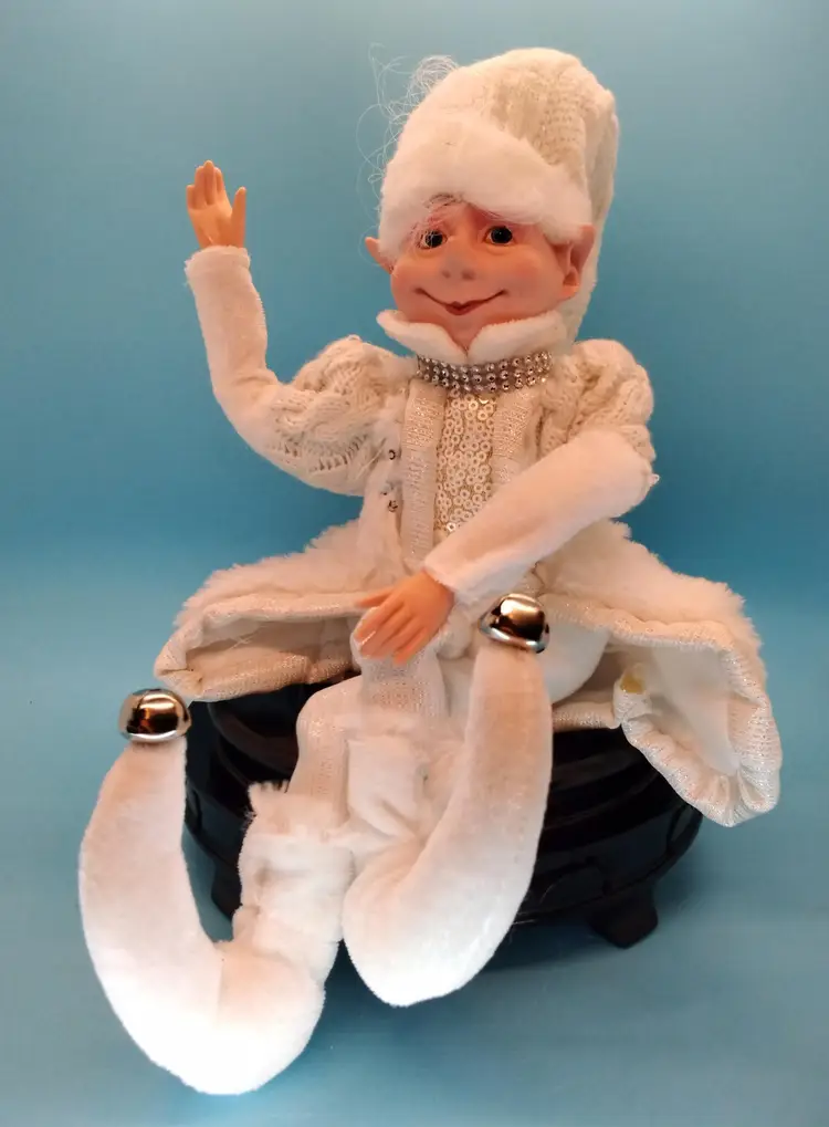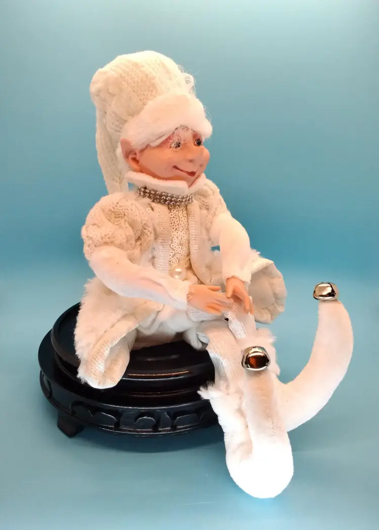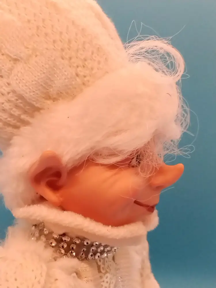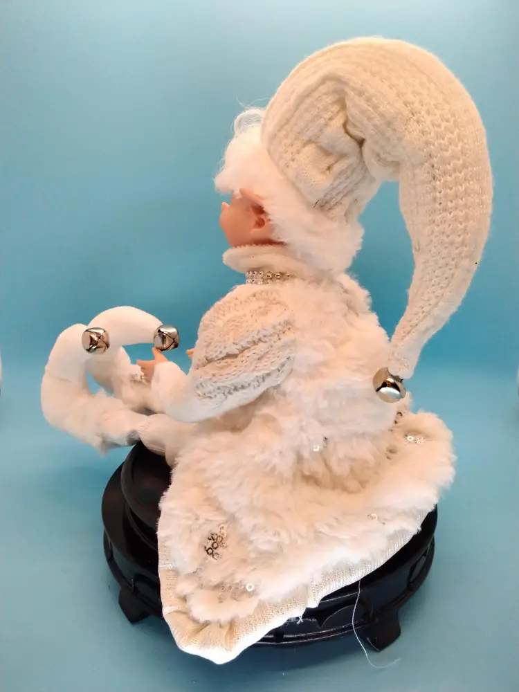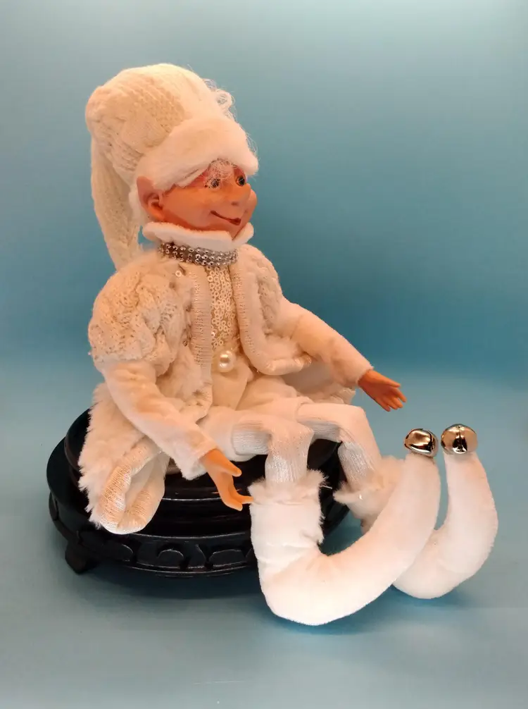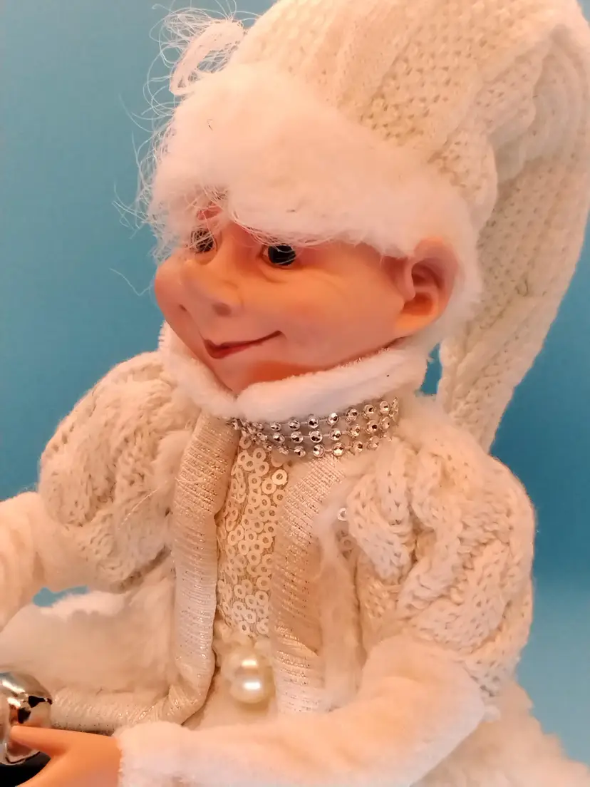 This charming vintage jester elf doll features posable limbs, a whimsical design with a cozy knit hat and sparkling embellishments. Perfect for adding a touch of playful elegance to your holiday decor or doll collection. He is 14inches from headn to toe, with posable limbs.