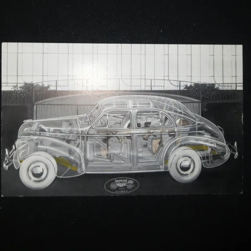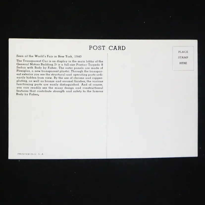This postcard features the Transparent Car, a full size Torpedo 8 with body by Fisher.