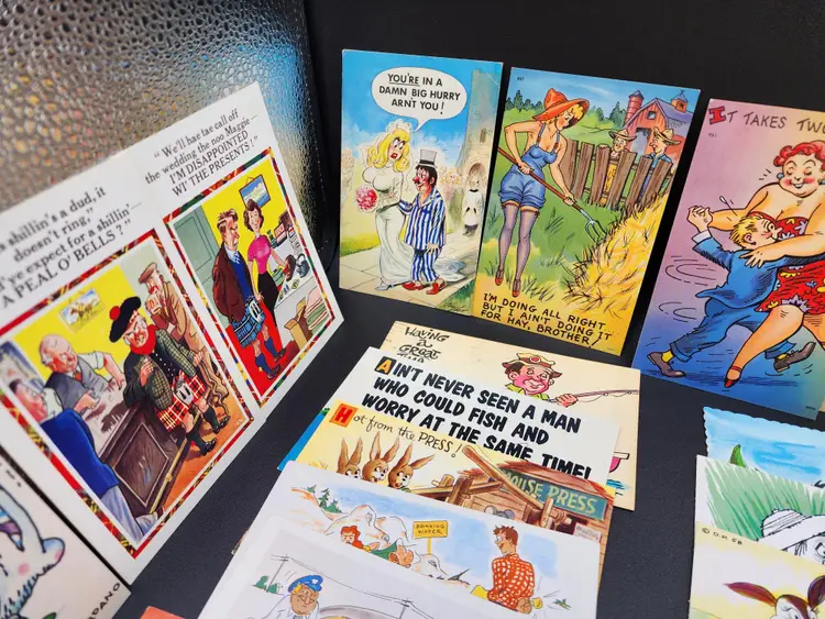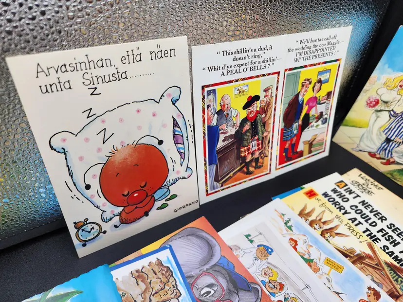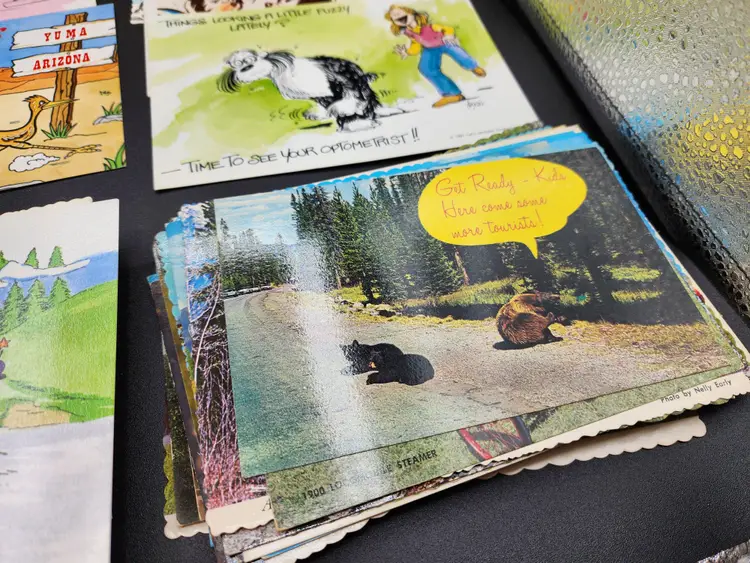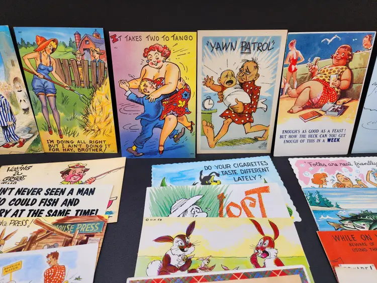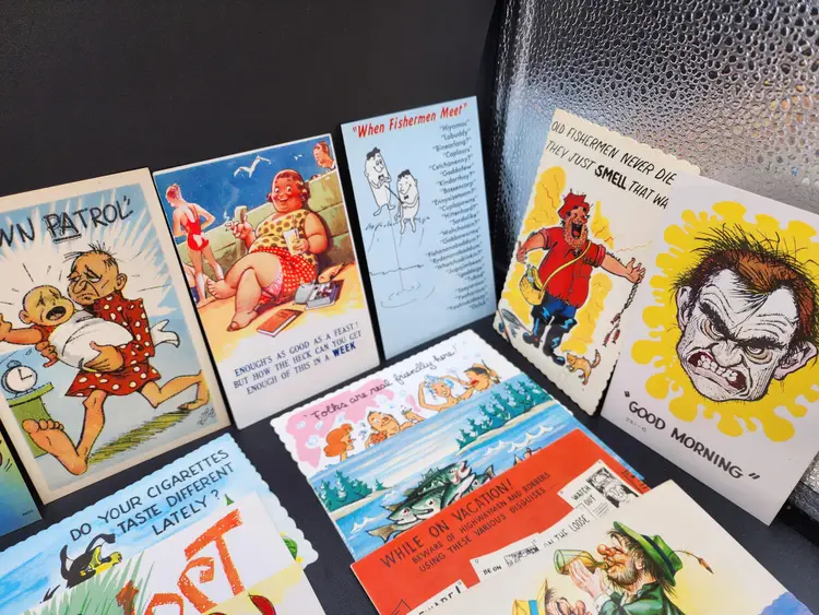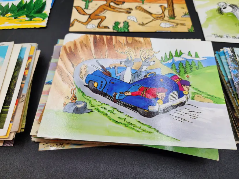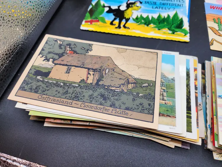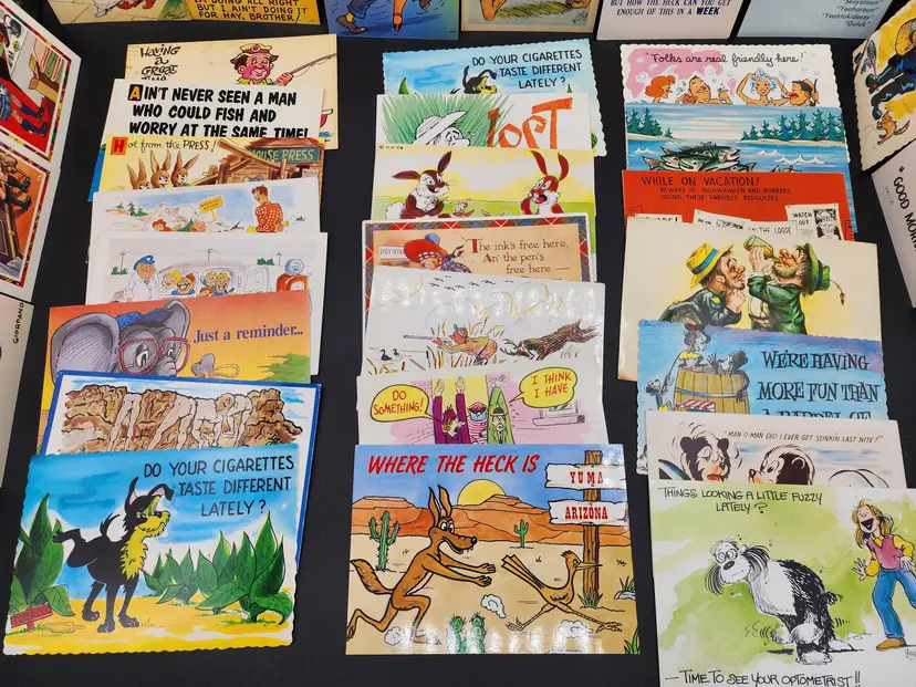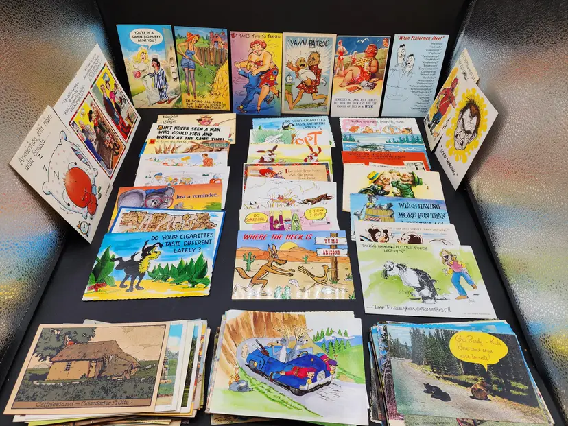 A variety of vintage postcards, most are unused. Humor, photos, vintage California, Arizona and ND. Lots of variety in good condition for resale.