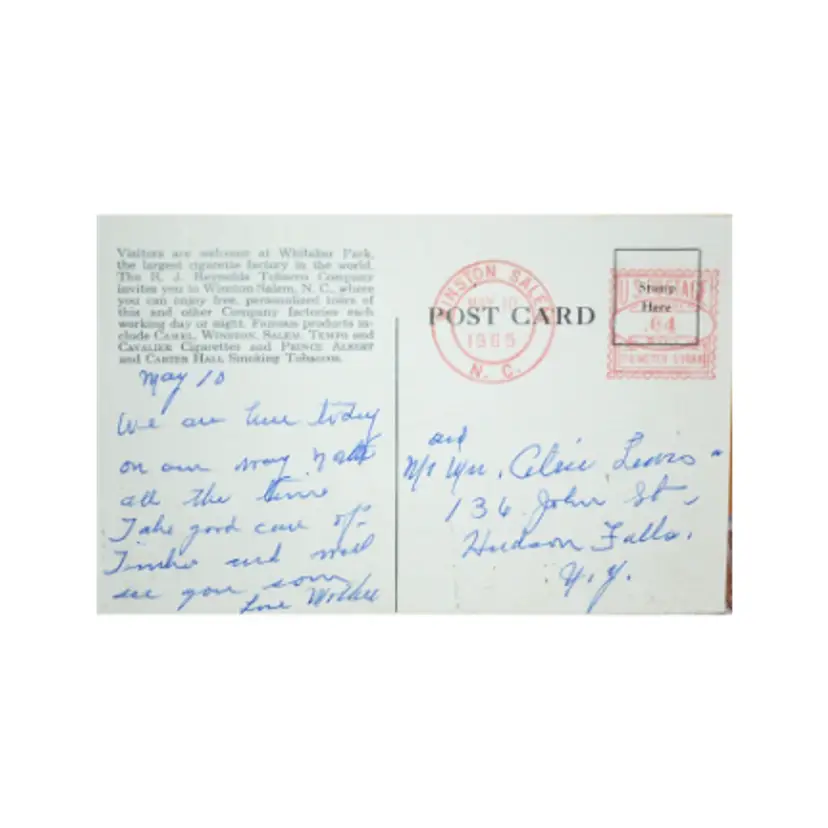 Postcard is of Whitaker Park, largest cigarette factory in the world, RJ Reynolds Company in Winston Salem North Carolina.