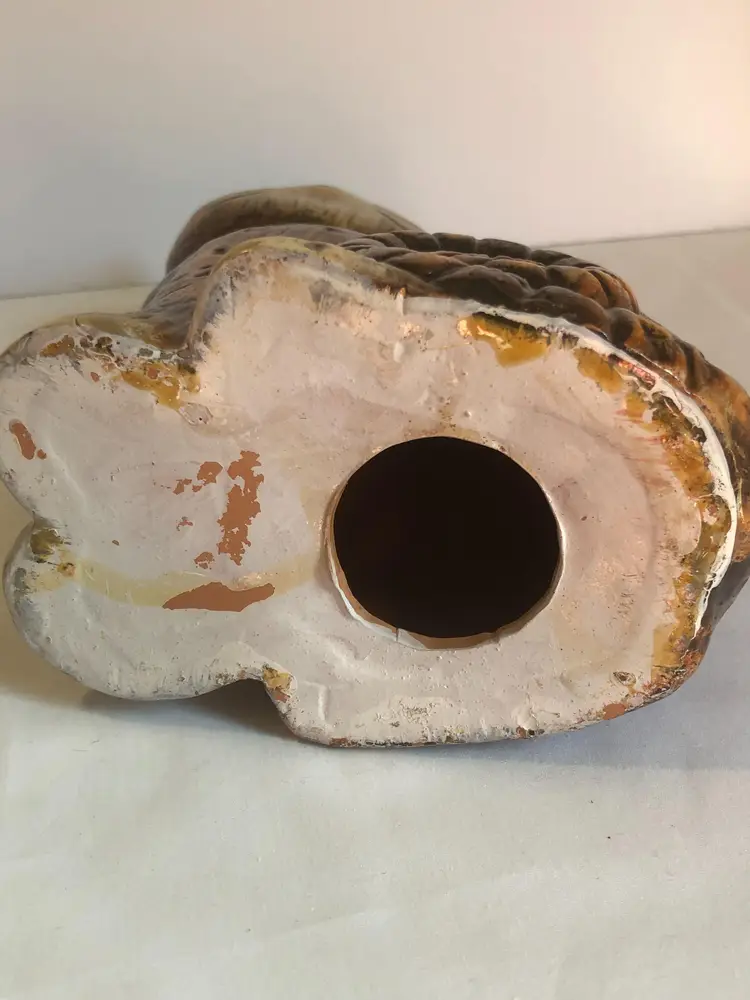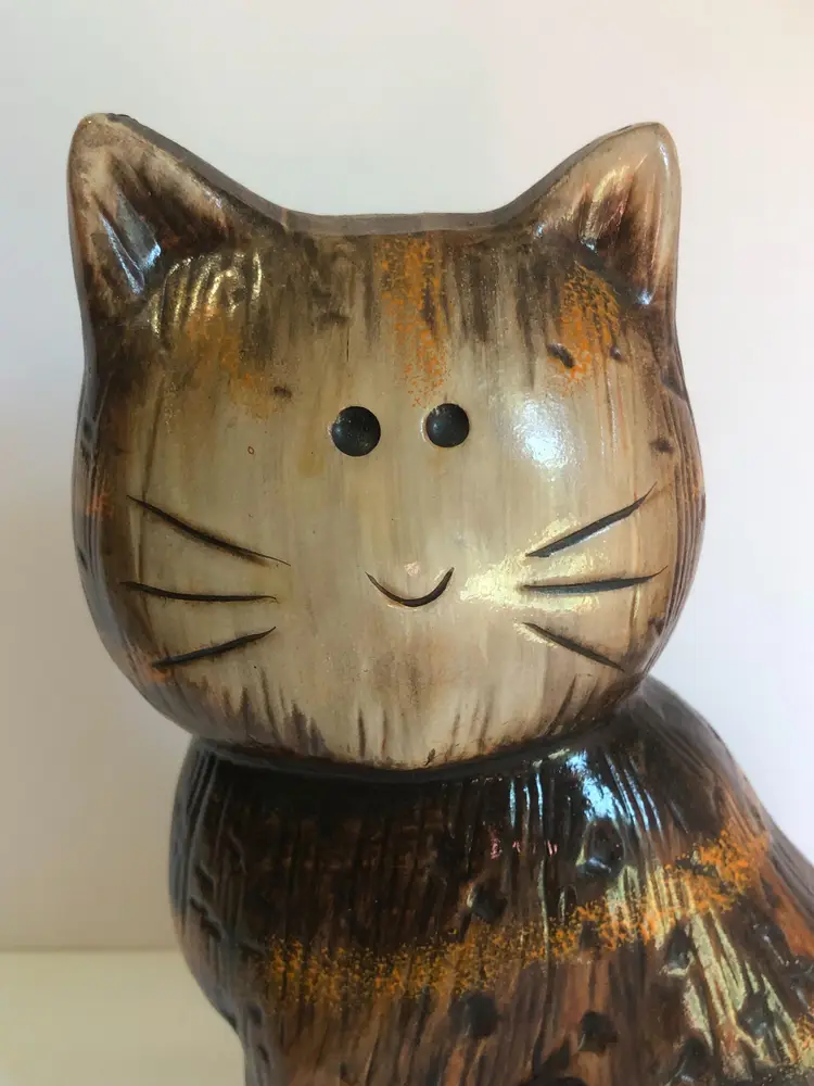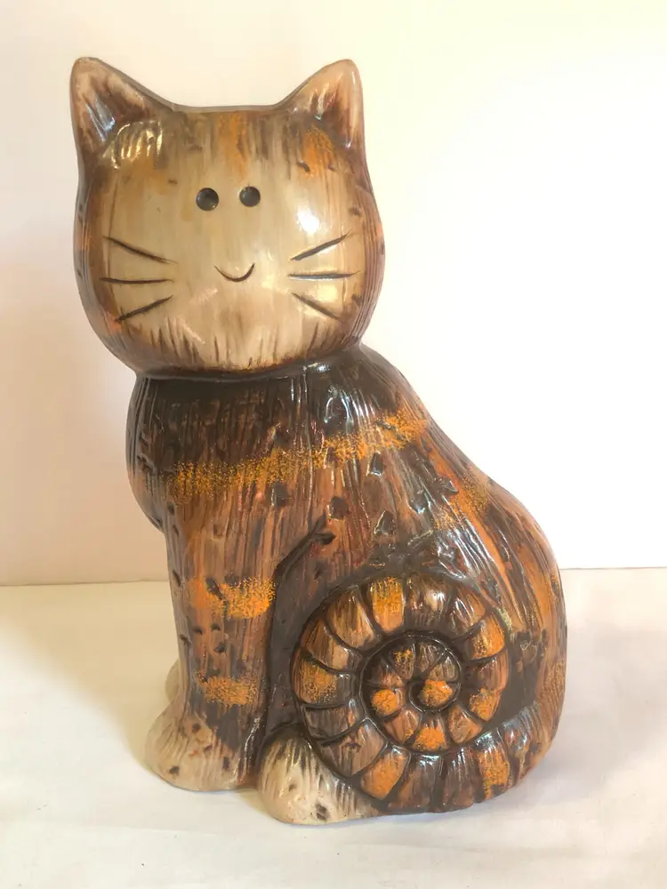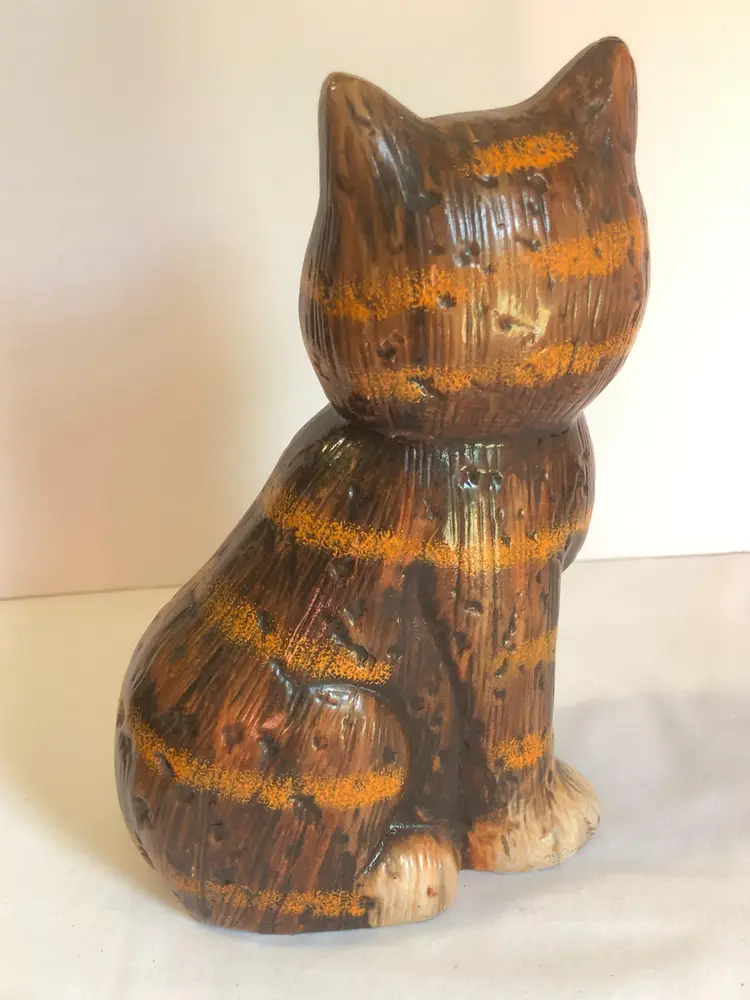 Vintage 8.25" tall Pottery Cat Ceramic Brown Orange Stripe Tabby Kitty 1970s Vibe Redware. Cat lover. Appears to be red clay under glaze. Unmarked. Great condition. No chips, no cracks. Spiral tail.