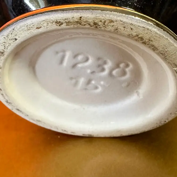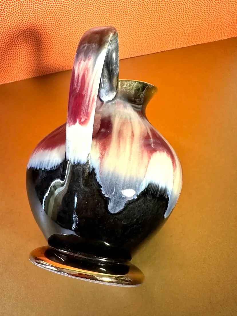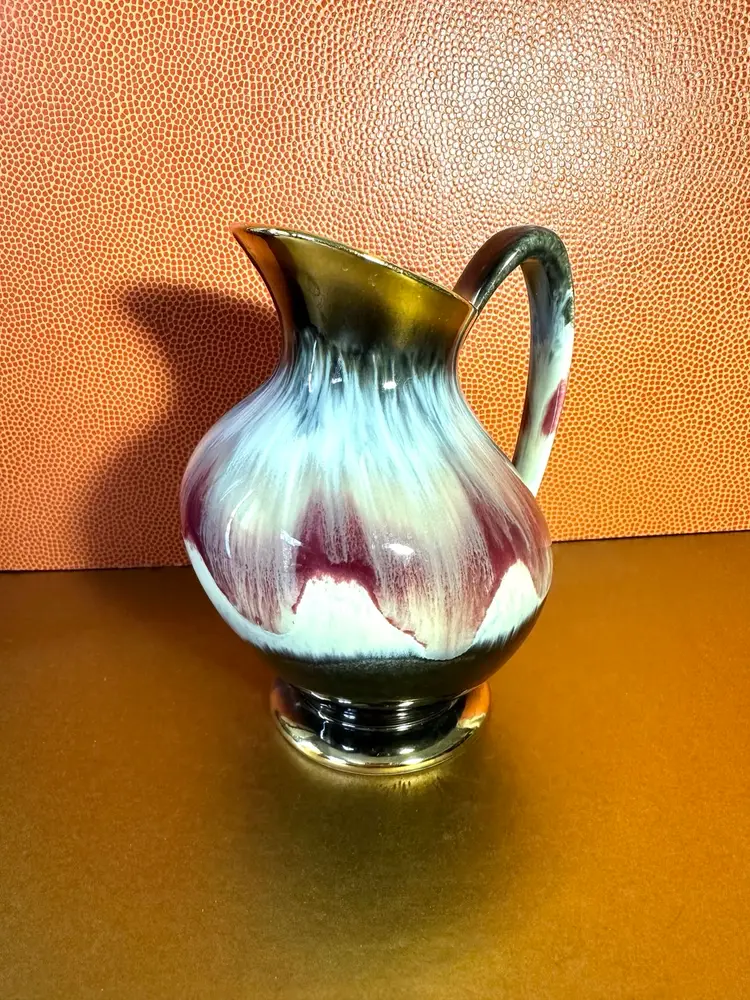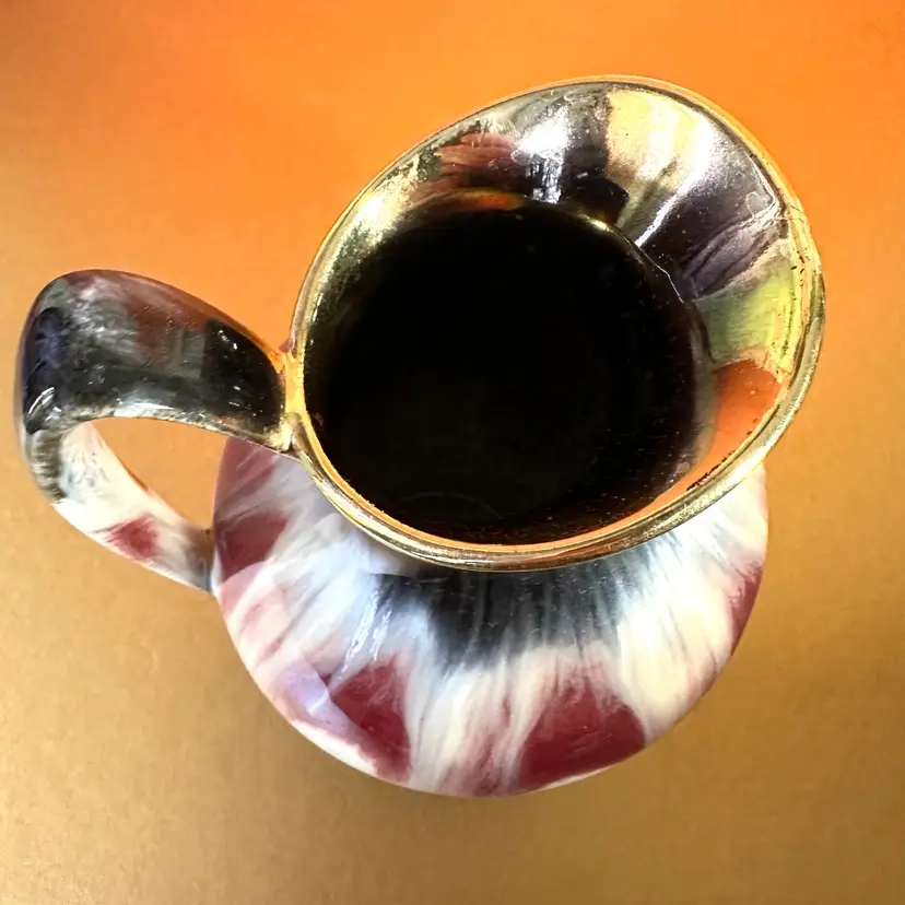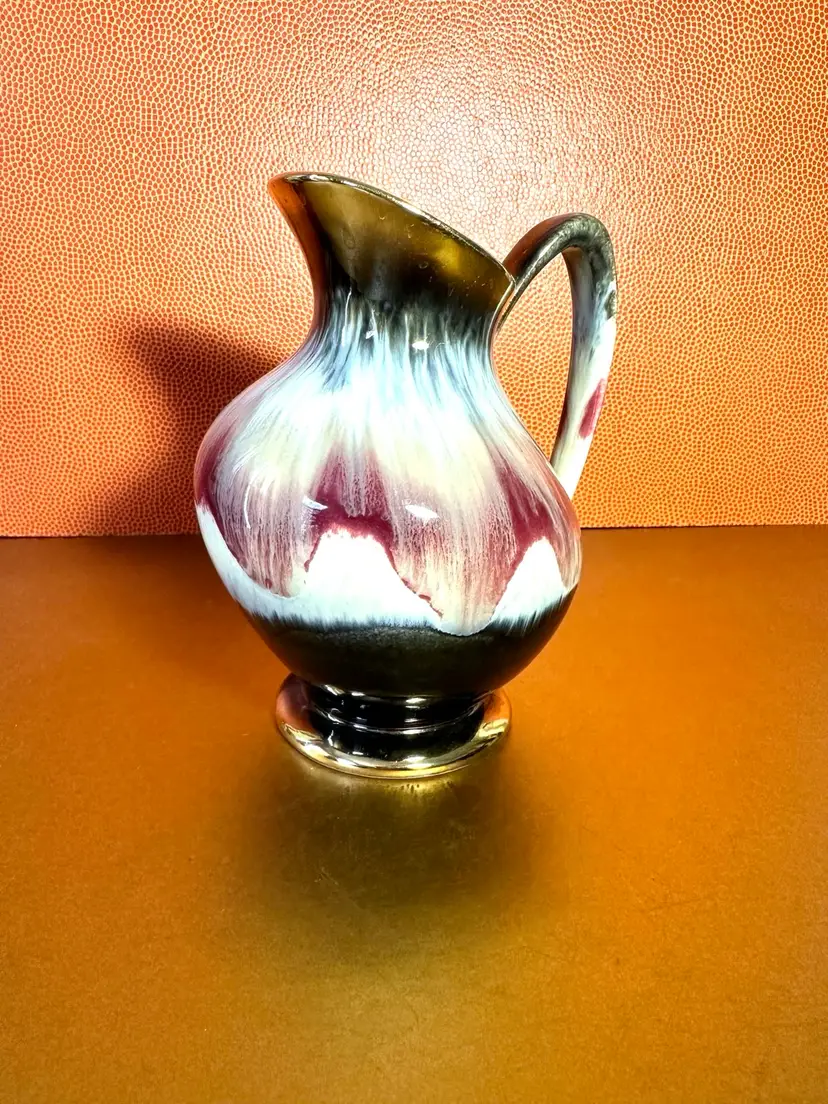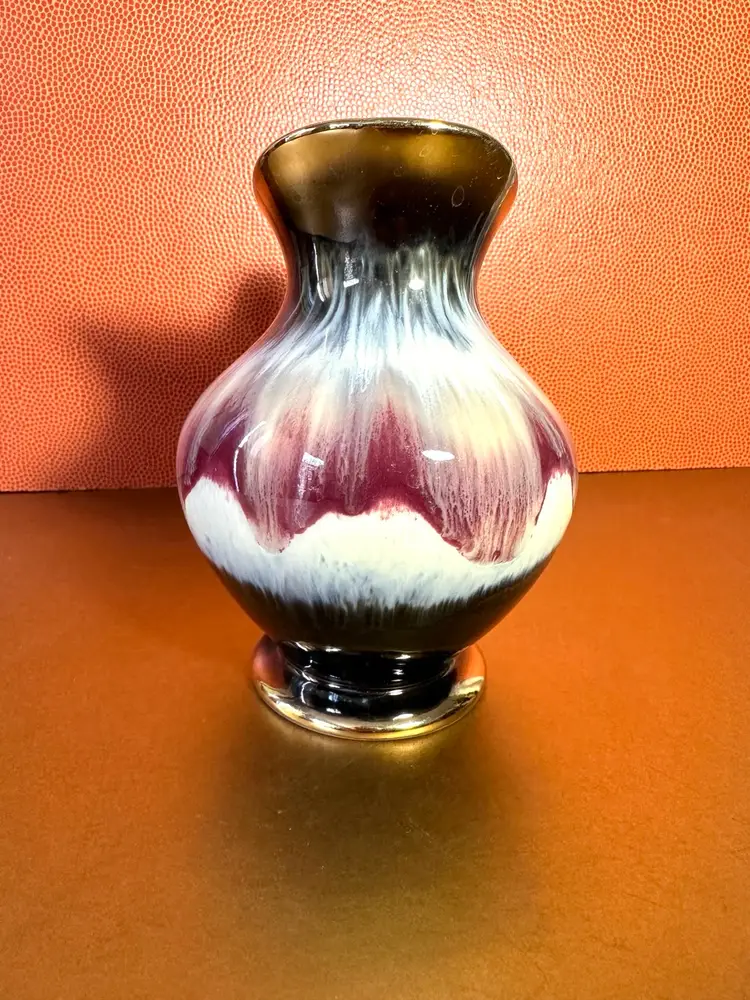 Unique glazing cream with touch of blue into brown with gold rim and bottom edge 6” tall no issues noted ♦️