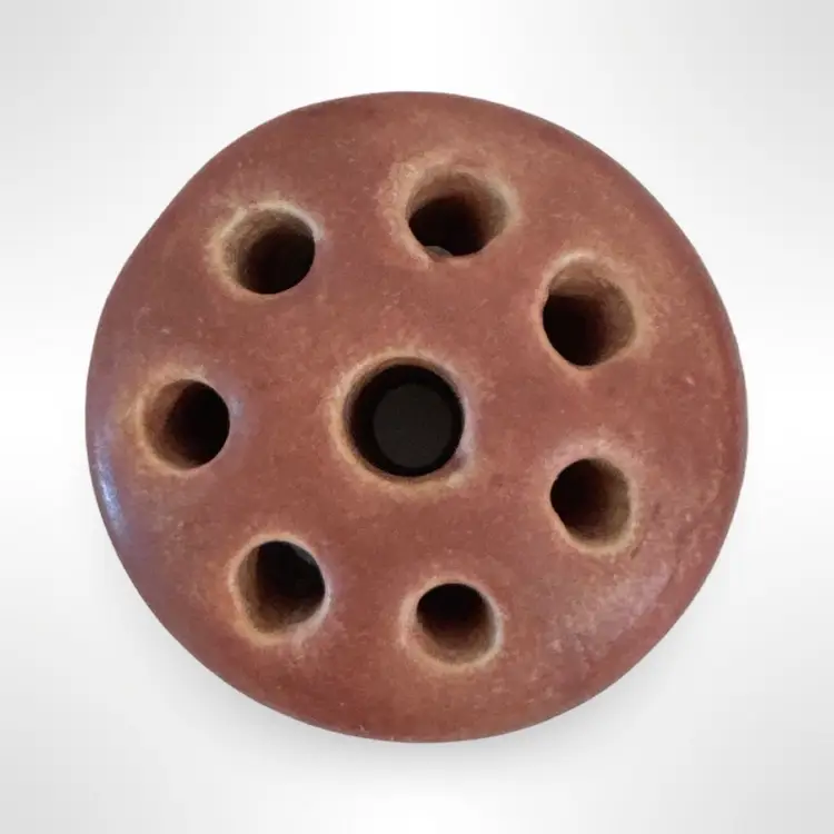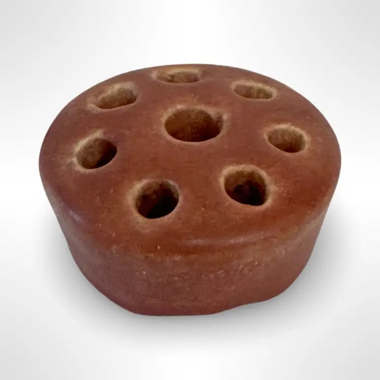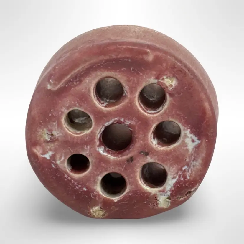 Very nice vintage 8 hole pottery flower frog with a pink/mauve glaze. No chips or cracks. Measures approximately 2.5” in diameter.