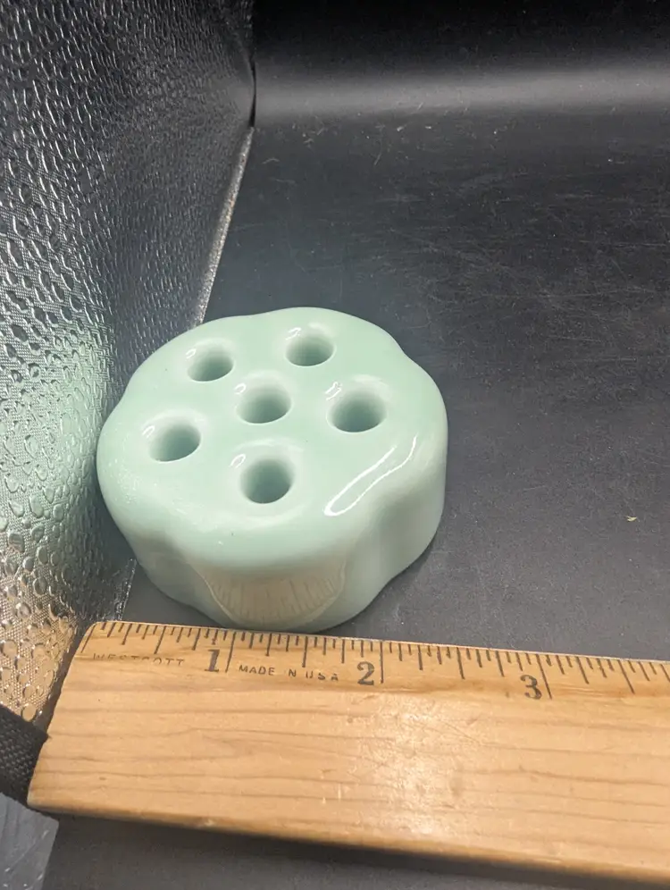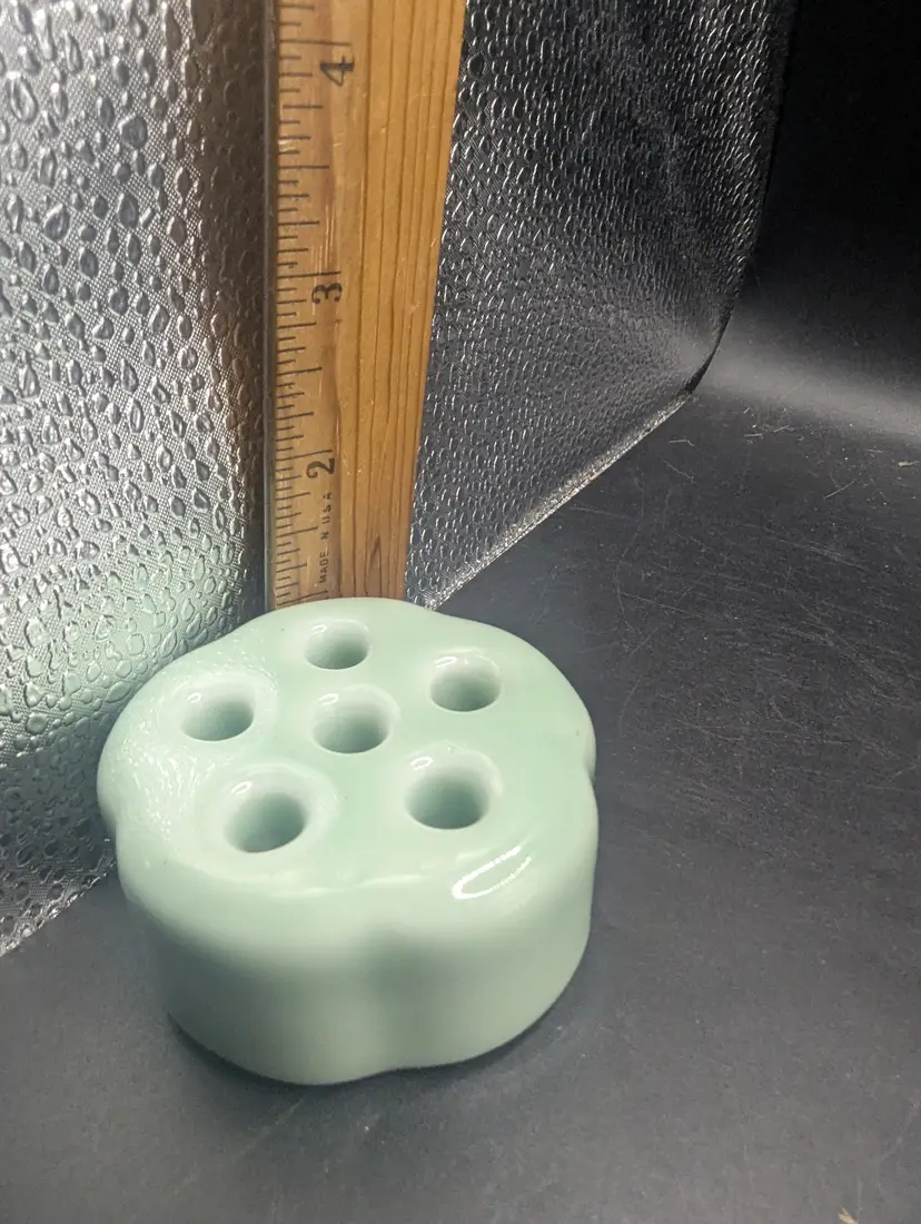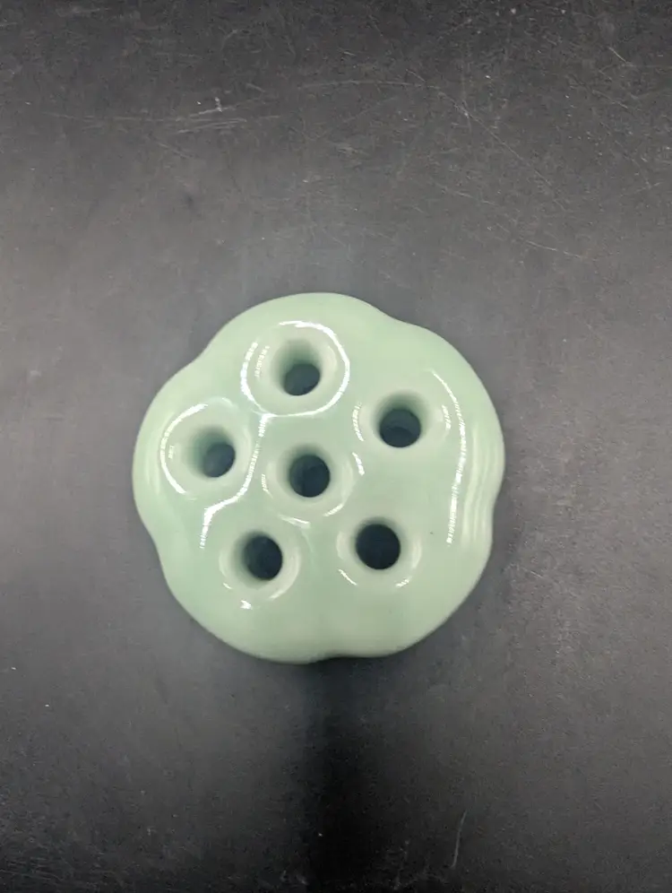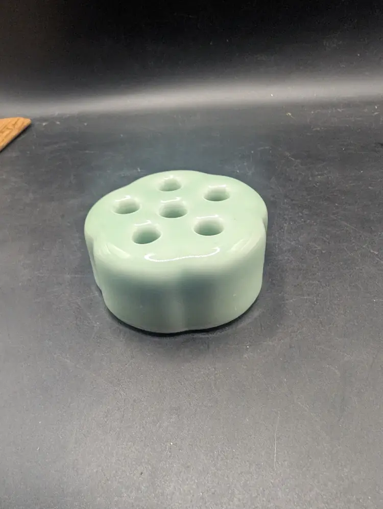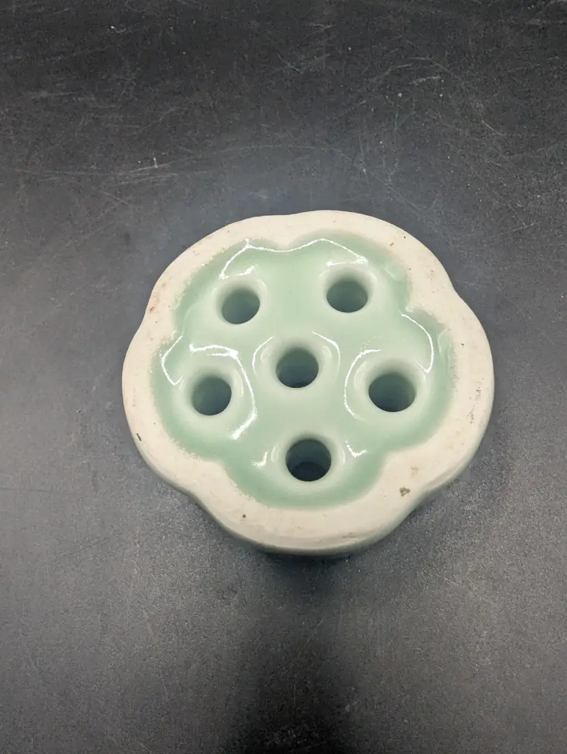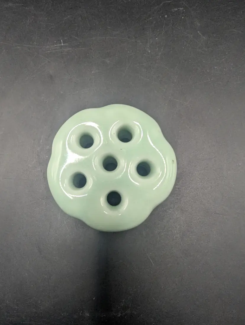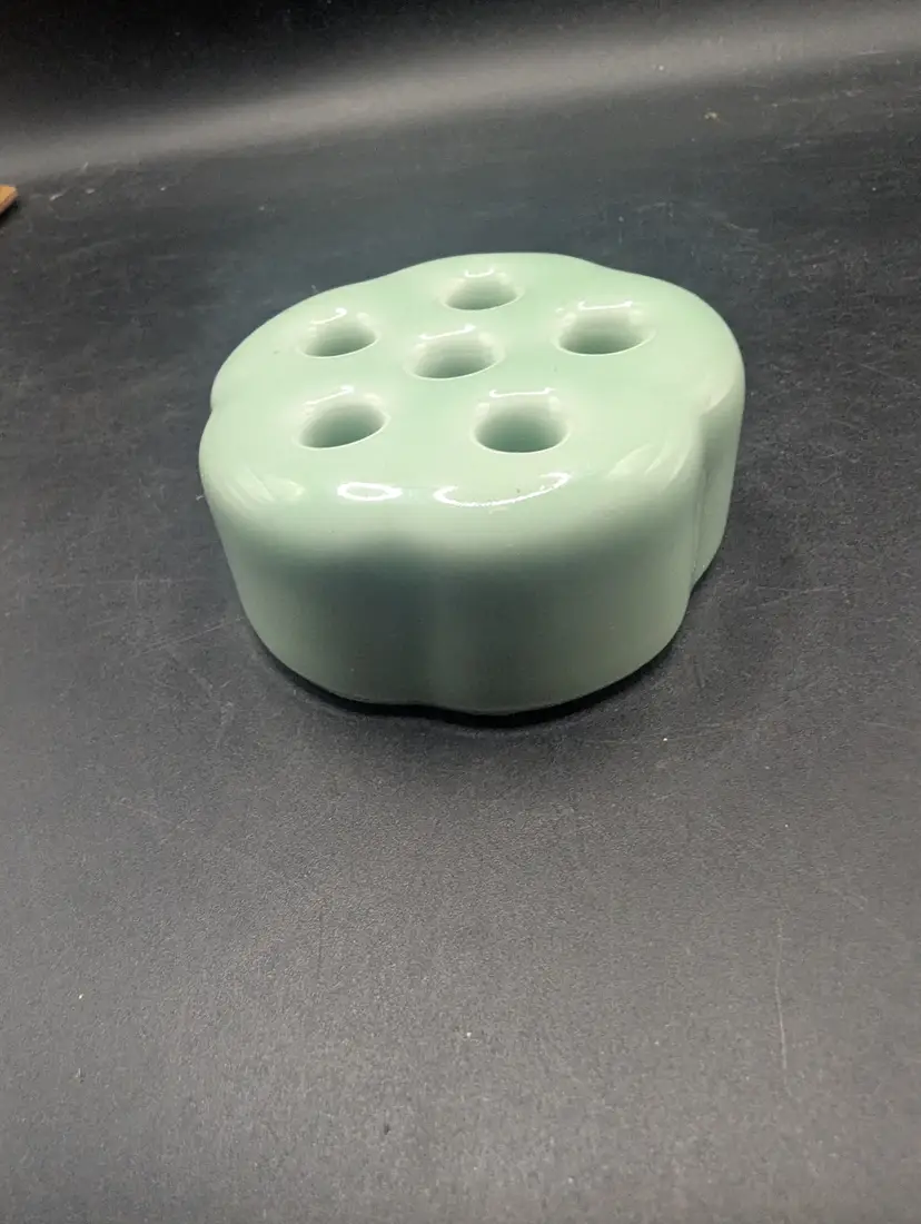 This is a lovely Vintage Pottery Flower Frog With Celadon Glaze Six Hole. No chips or cracks. Maker unknown. Please see all pictures for condition and measurements.