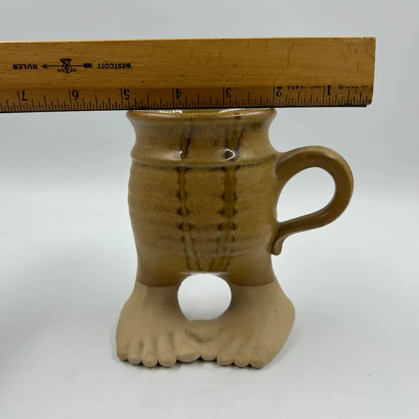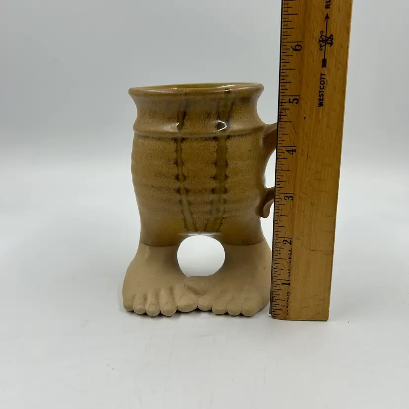 A Vintage Mug Stamped Five Bridges Pottery on the bottom of the Feet base. Tan and muted colors on the outside and inside of the mug Approx. 5.25” T
