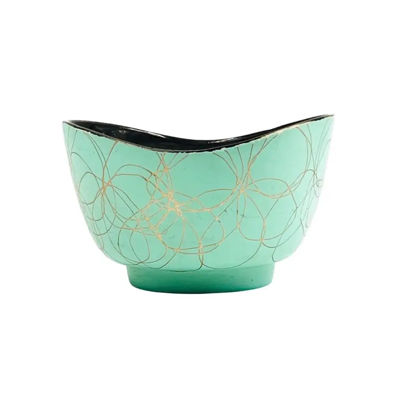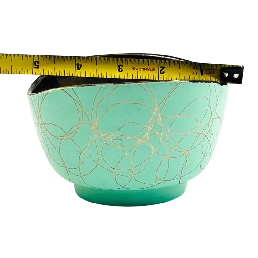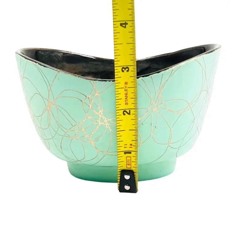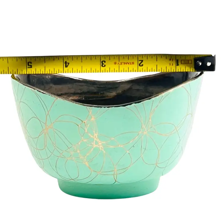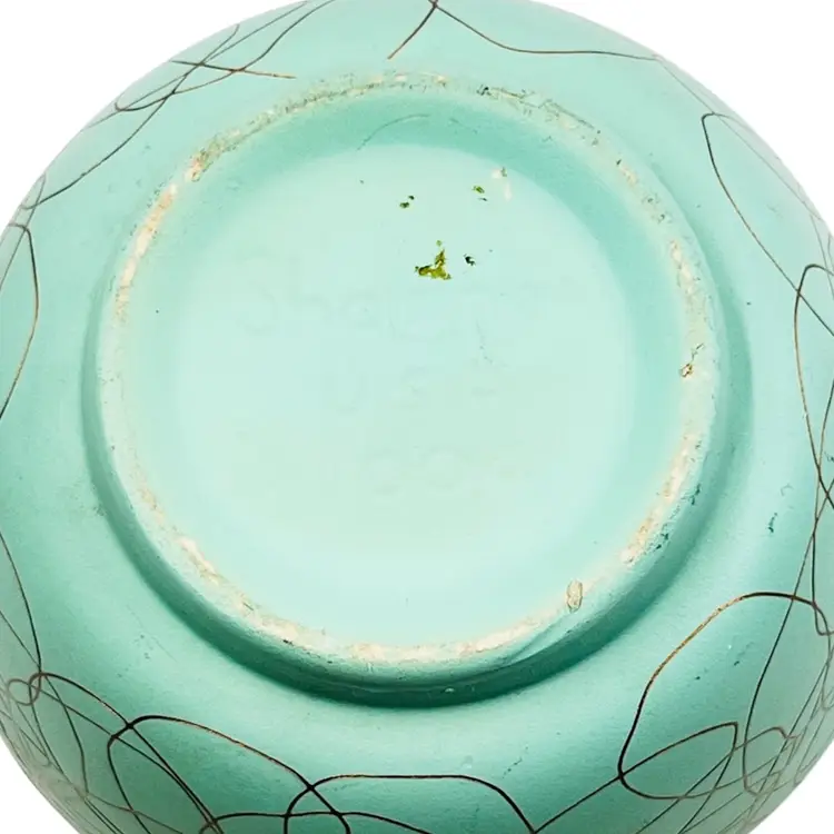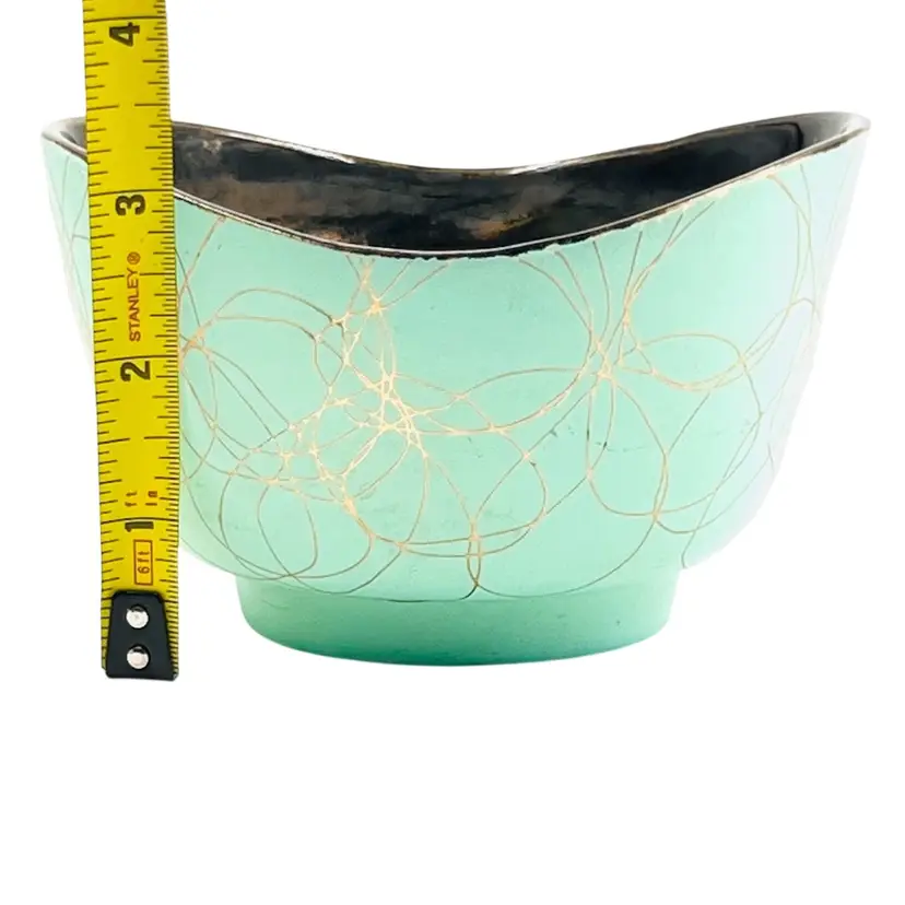 ๐ 5x4.5x3.5โLight Green w/ Gold Tone Swirl ๐ Iridescent Interior Swoop Top Edge ๐ Interior has hard water marks ๐No Chips or Cracks ๐ Review Photos for Best Condition Description ๐Sold as Shown