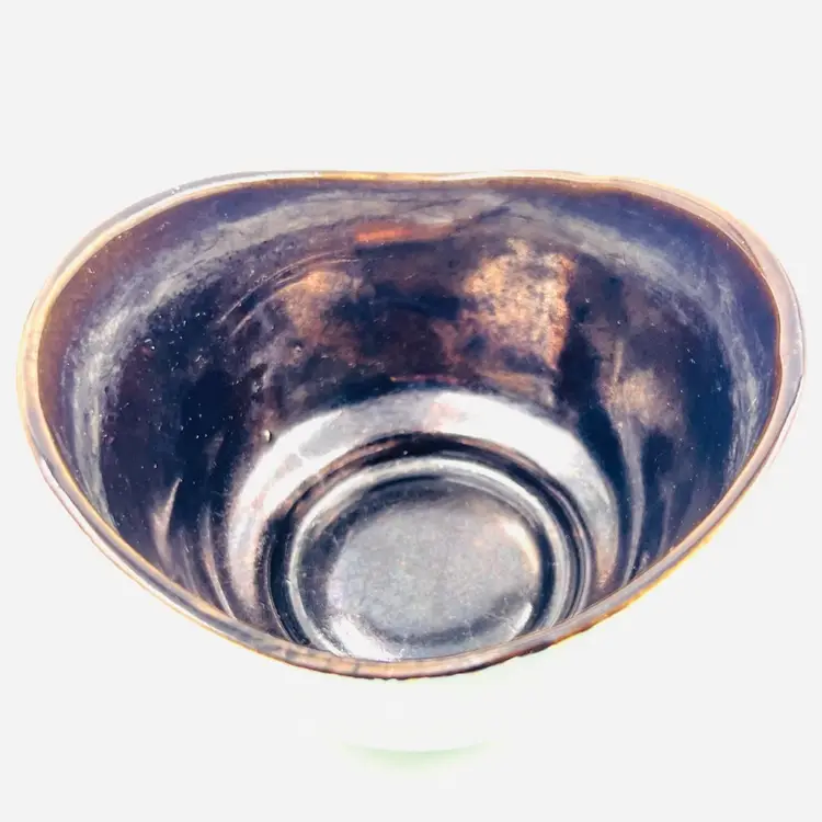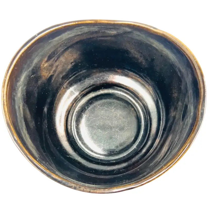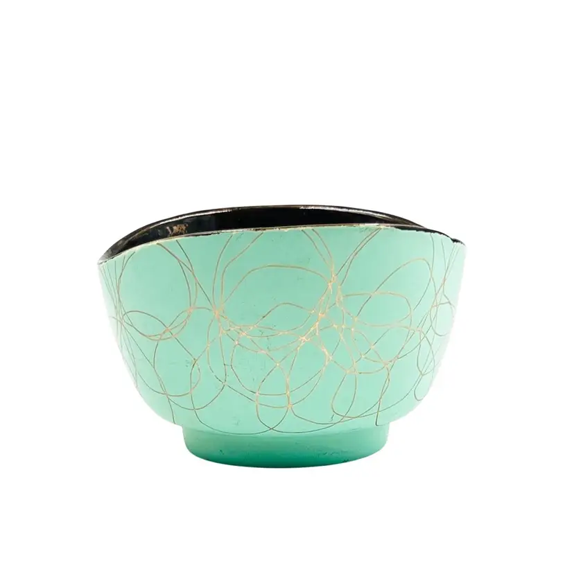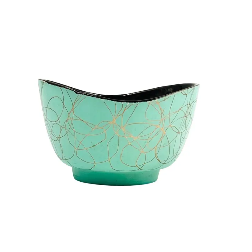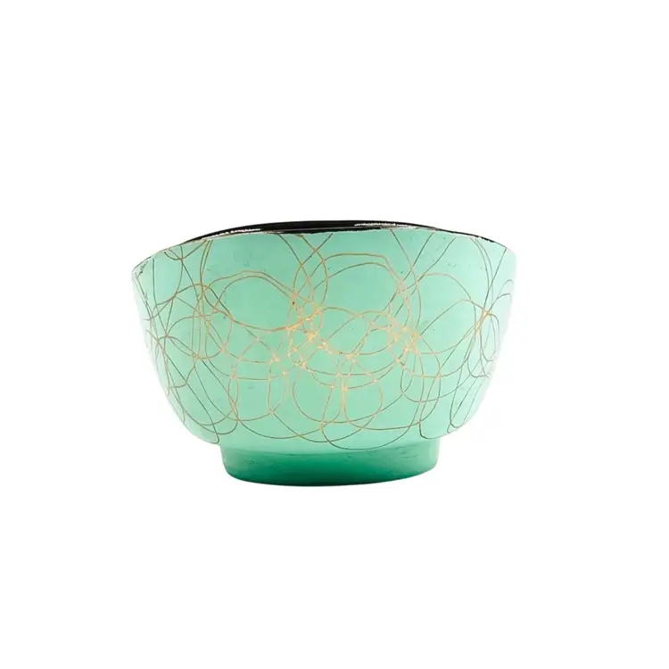 ๐ 5x4.5x3.5โLight Green w/ Gold Tone Swirl ๐ Iridescent Interior Swoop Top Edge ๐ Interior has hard water marks ๐No Chips or Cracks ๐ Review Photos for Best Condition Description ๐Sold as Shown