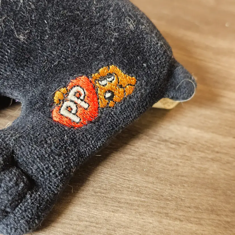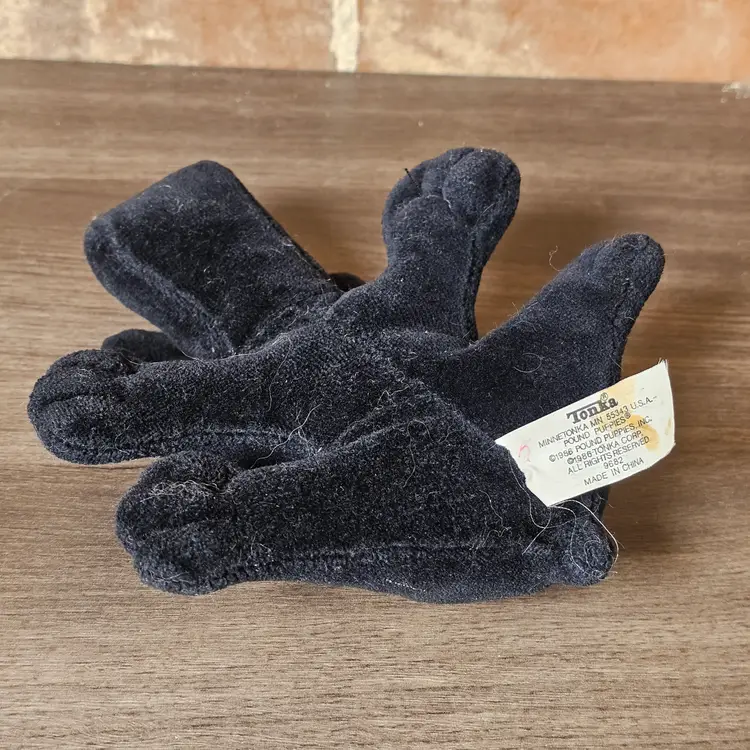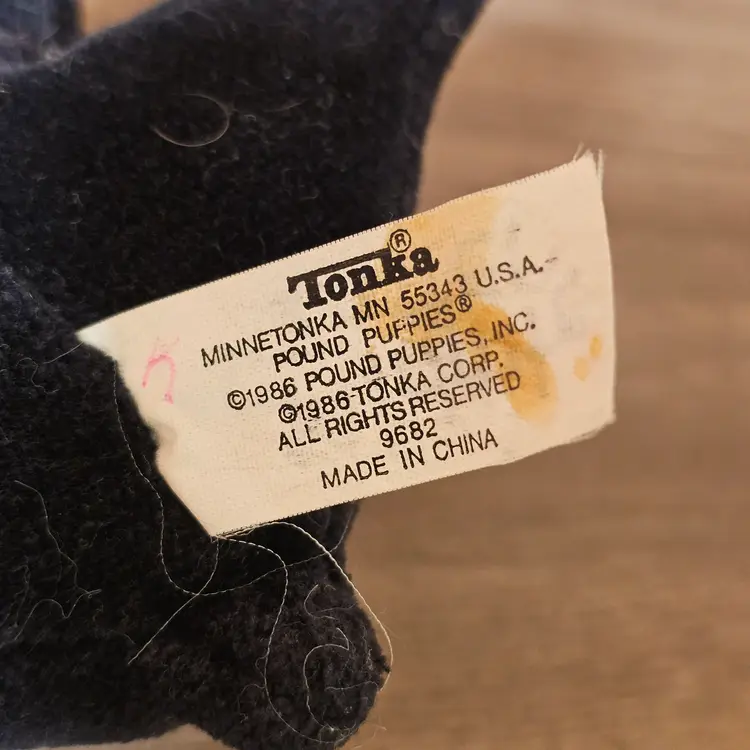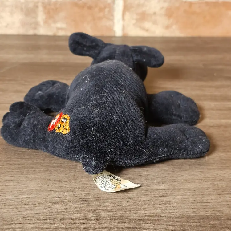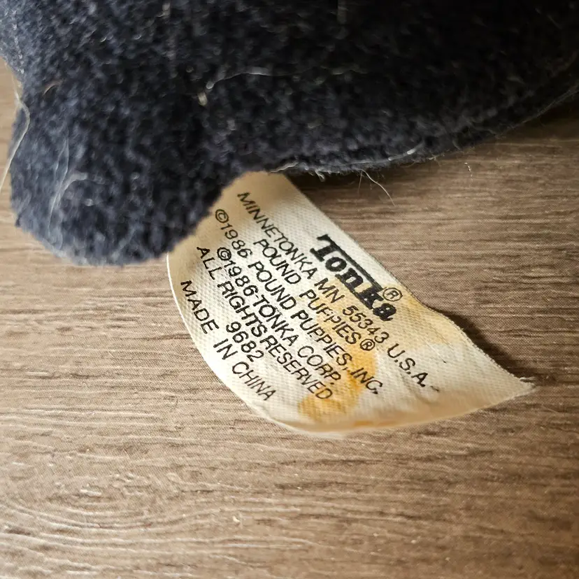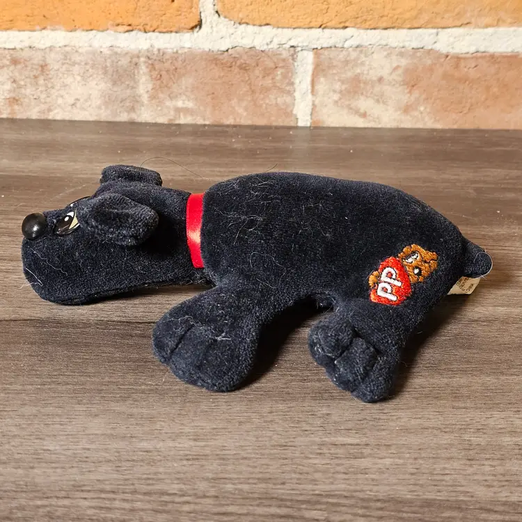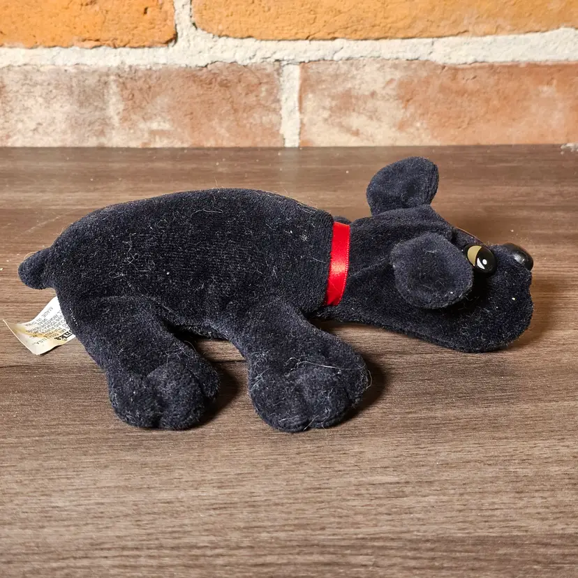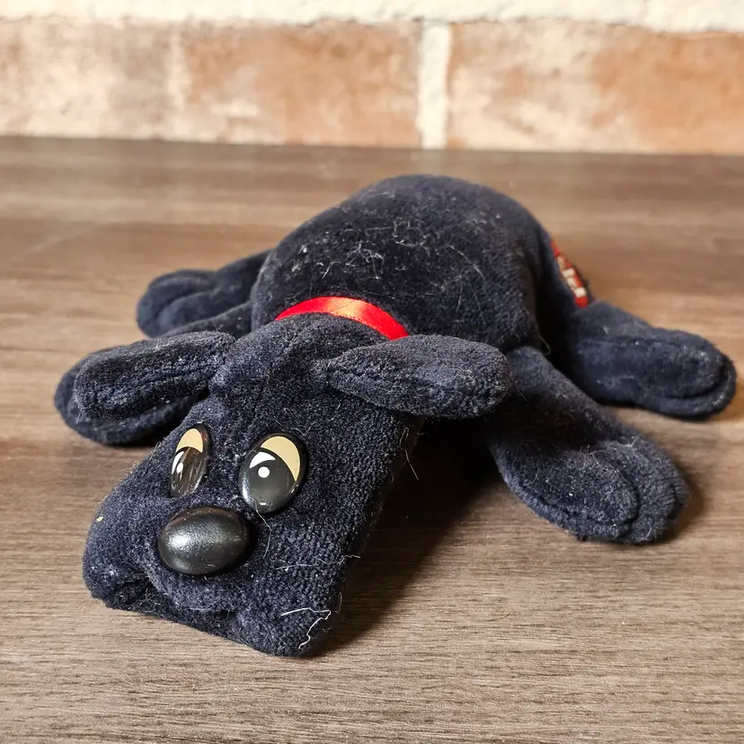 Black Dog (Pound Puppy): A classic floppy-eared pup with a vibrant red ribbon collar and soulful plastic eyes.