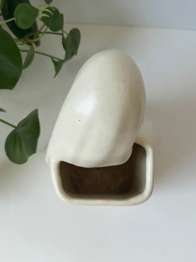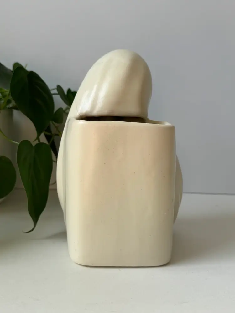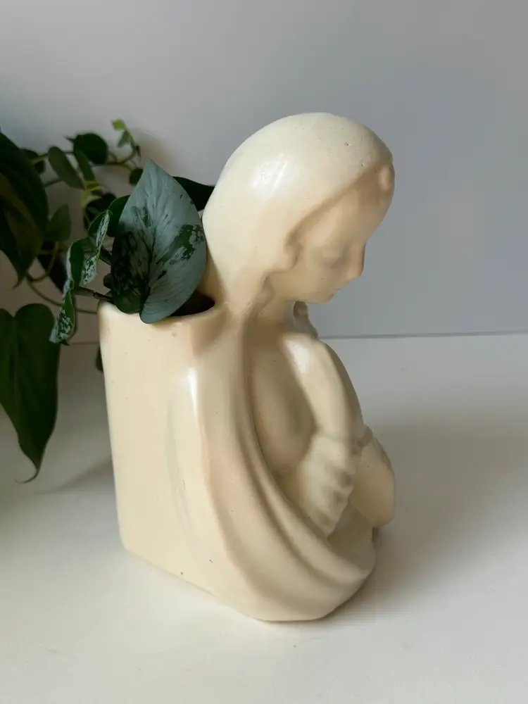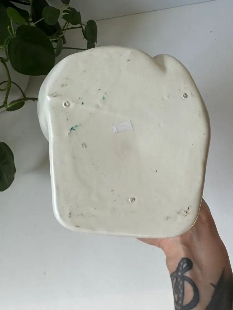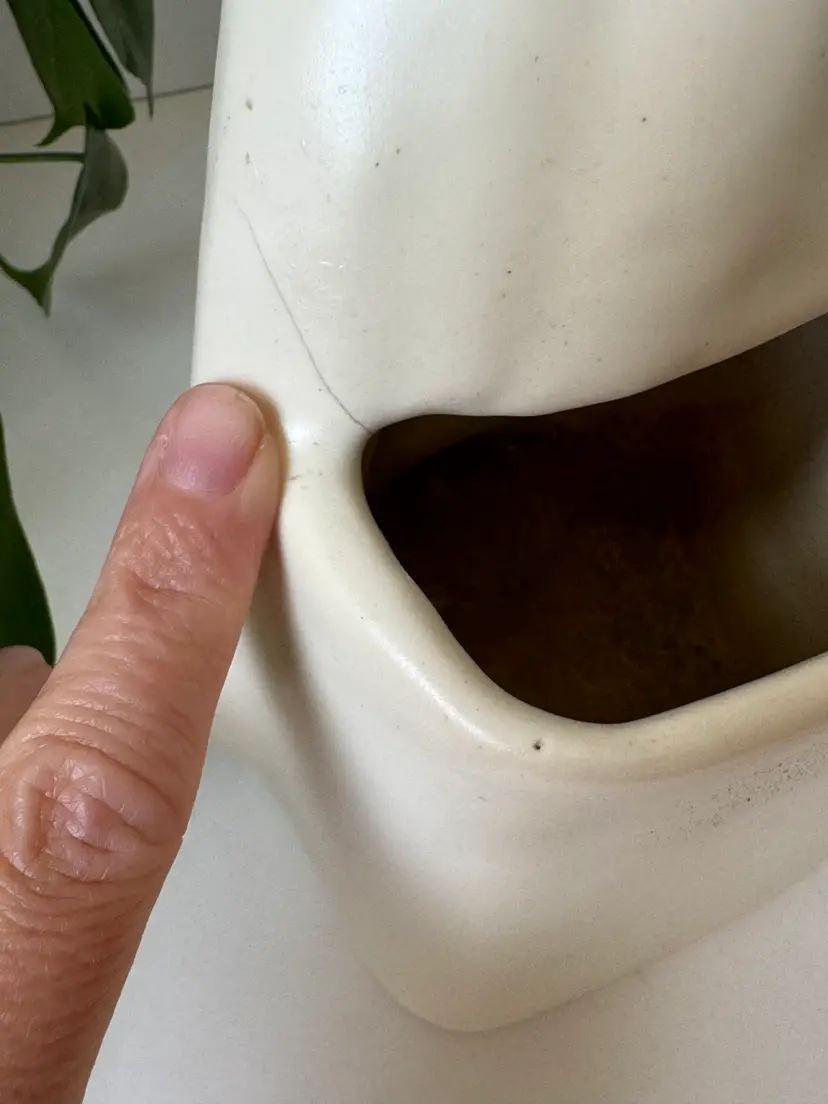 She’s made of ceramic with a satin finish. No chips, only a slight crack on the side. 8” height 5” width Planter portion is 4” x 2.5”
