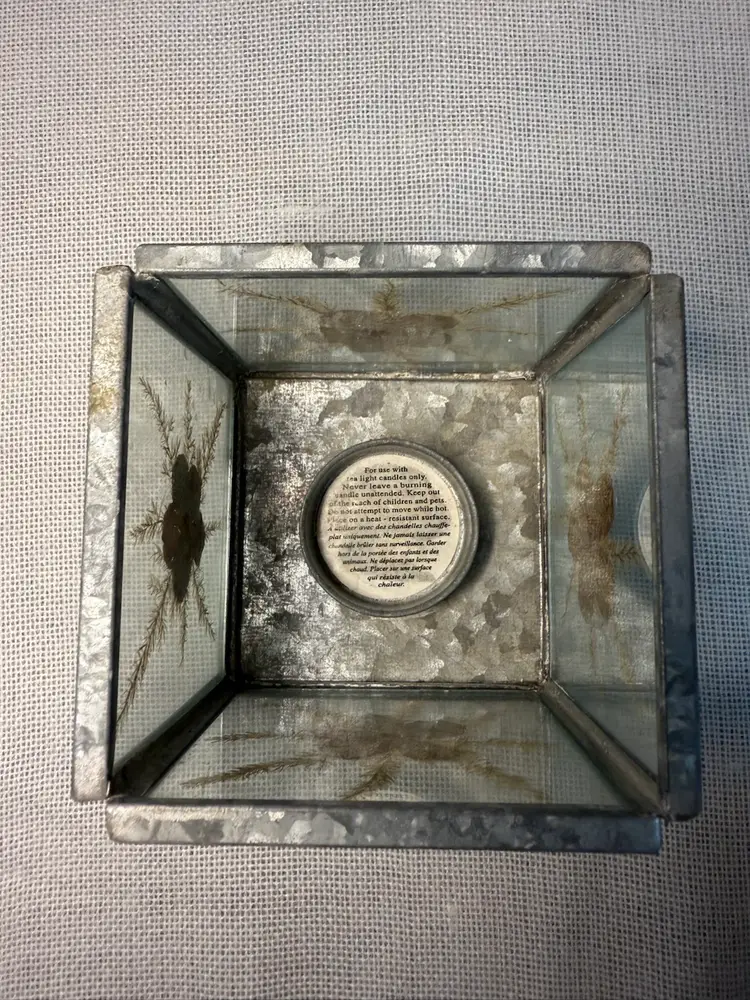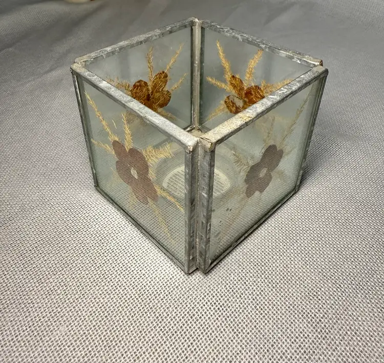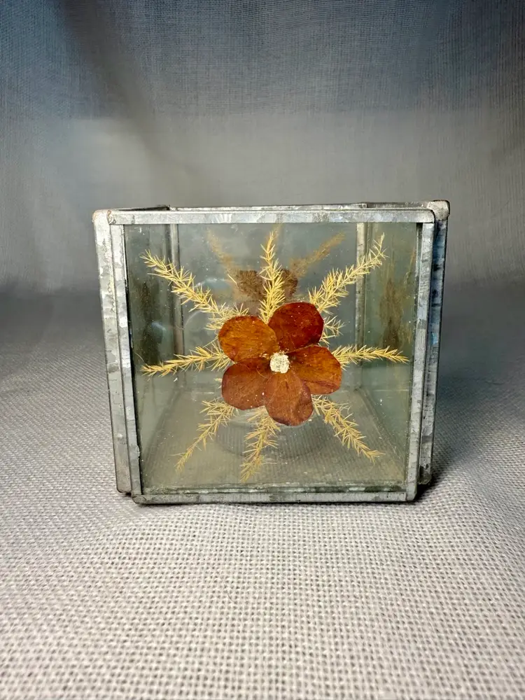 Vintage pressed flower with silver trim tea candle dish Pressed flowers on all 4 sides Use as a candle holder or turn into a planter