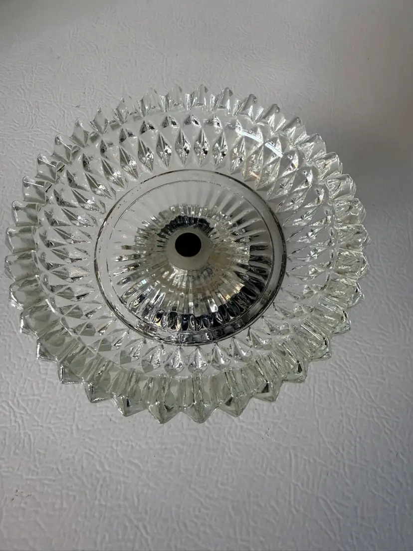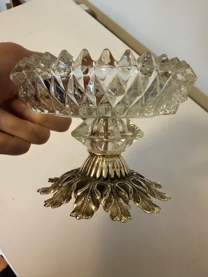 This is a vintage Hollywood Regency style candy dish or compote bowl, featuring a clear, diamond-patterned pressed glass bowl seated on an ornate, silver-plated metal base with a leaf-like design.