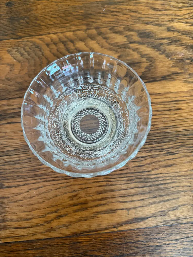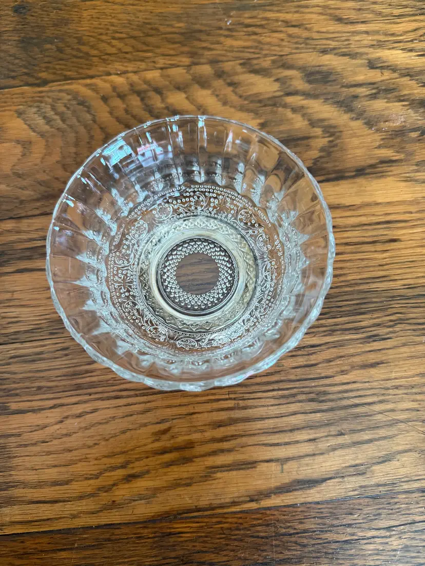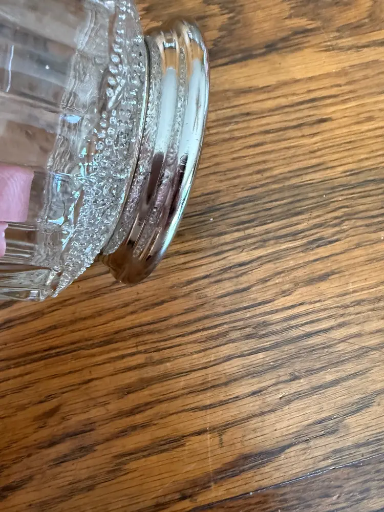 ⭐ Item Details Type: Vintage mid-century pressed glass candy/nut dish Material: Pressed/molded clear glass + silver-plated weighted base Size: 4.5” wide × 2.5” tall Color: Clear glass with silver-tone base Era: 1950s–1970s Use: Candy bowl, nut dish, vanity bowl, small catchall, décor accent