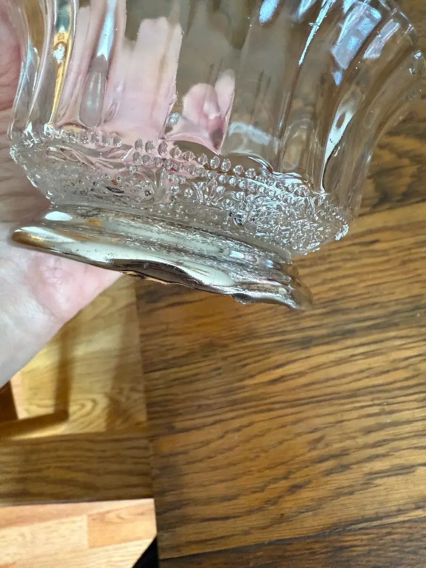 Bring a touch of mid-century charm to your home with this lovely vintage pressed-glass candy or nut dish, complete with a bright silver-plated weighted base. The bowl features scalloped panels and a delicate beaded scroll pattern where the glass meets the base—classic 1950s–1970s style that shines beautifully in any space.