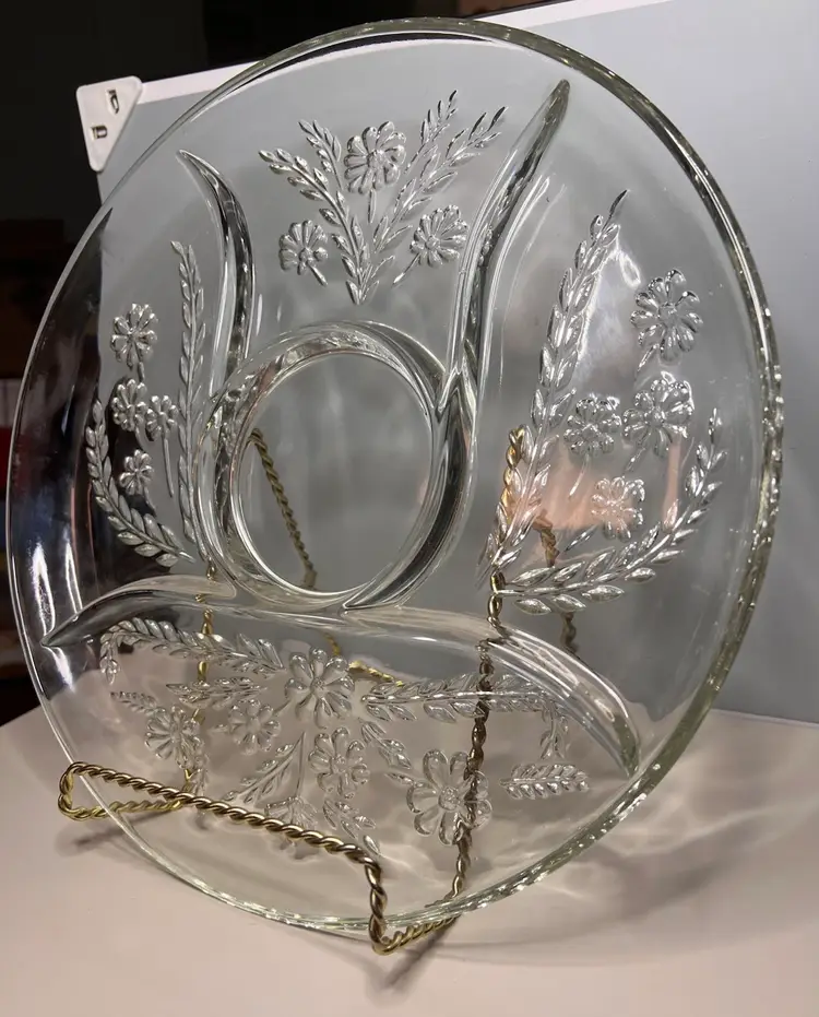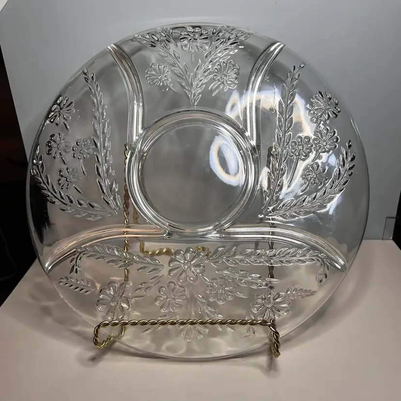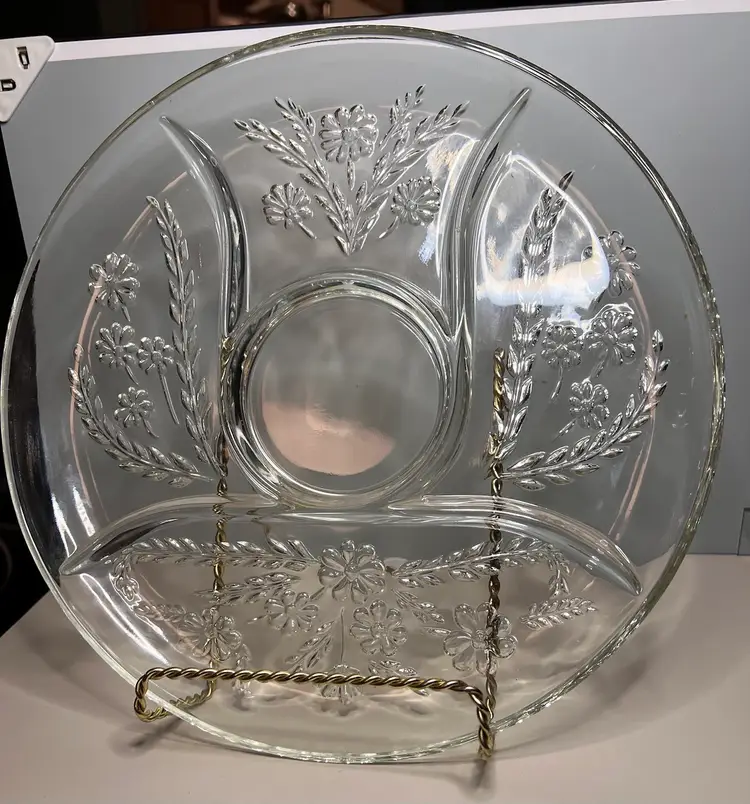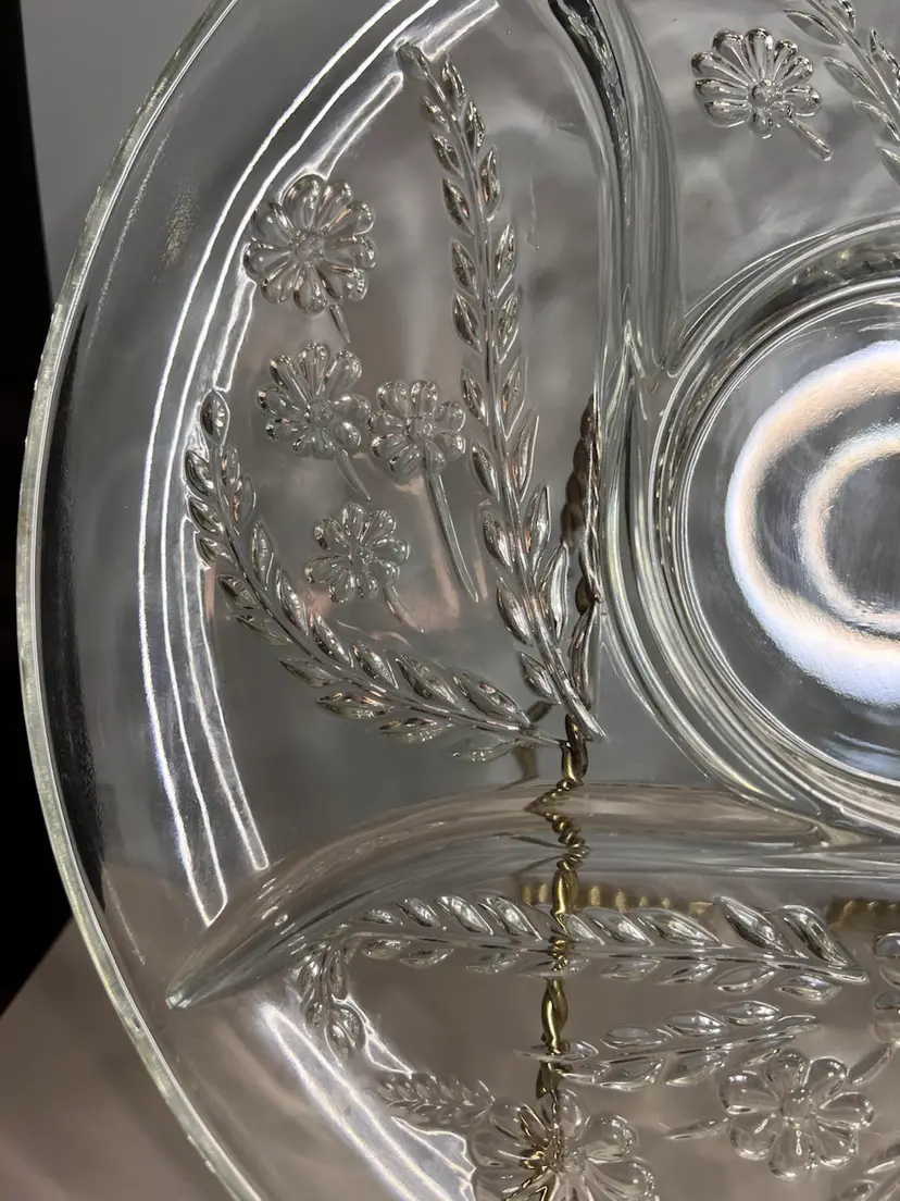 11 1/2” glass divided relish tray. Wheat and wildflower pattern. No chips or cracks.