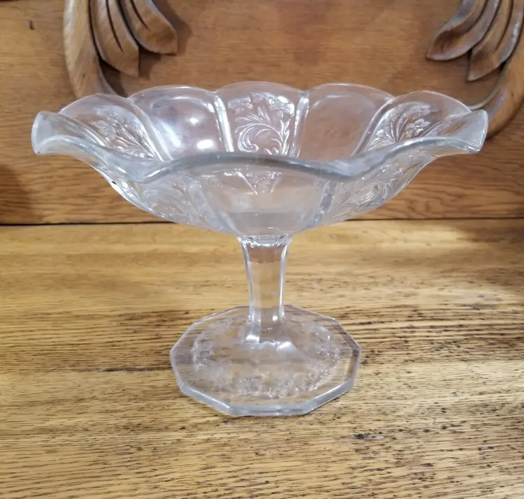 Vintage Pressed Glass Floral Compote Bowl 8β Pedestal Clear Elegant Glass This beautiful vintage pressed glass compote features an elegant raised floral and scroll design radiating from the center, with softly scalloped edges and a classic pedestal base. The form and detailing are characteristic of early to mid-20th century American pressed glass, often associated with makers such as Imperial Glass.