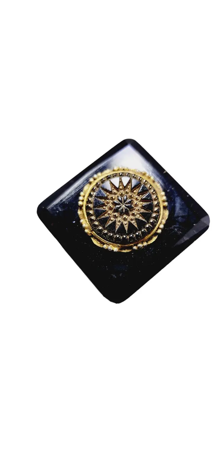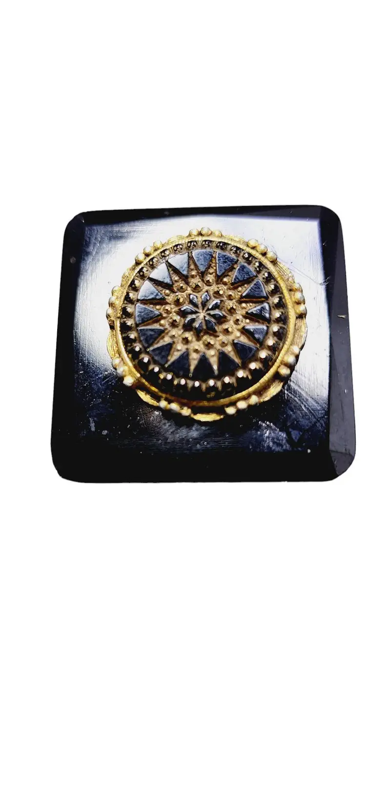 Size: 1.25" sq. Color: Black, gold Condition: Very good vintage; a few marks to glass Signed: Czechoslovakia Details: It has a c-clasp closure.
