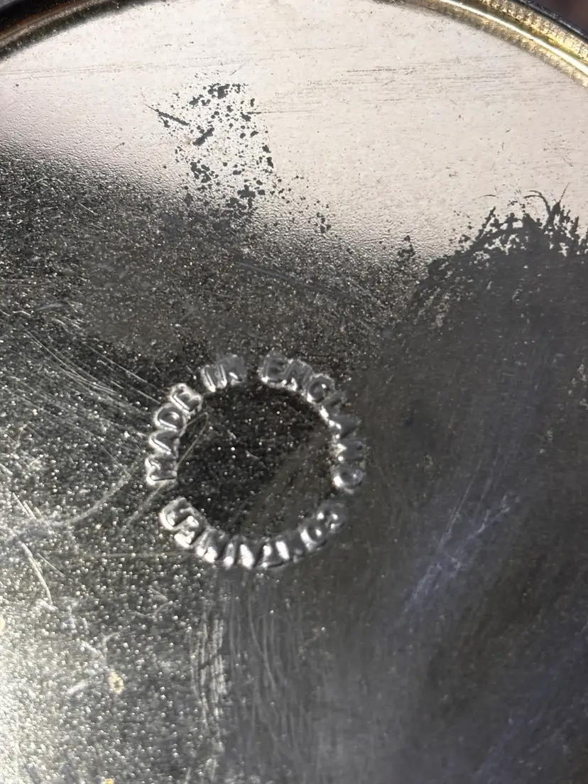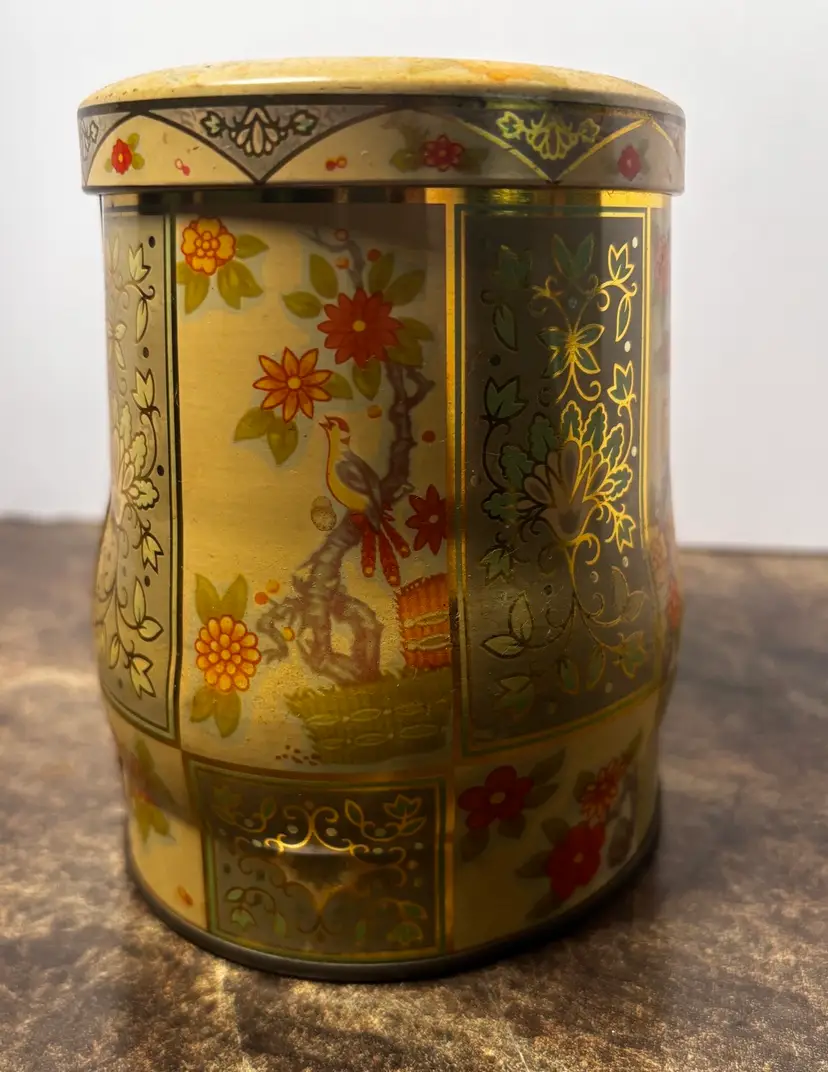 This pretty, well loved tin was made in England. Research suggests that it is a Daher tin. It is an embossed metal container with a lid, featuring intricate Chinoiserie-style patterns and gold accents. It is clean inside with nice fitting lid. Colors of blue, gold, teal, lemon and orange are in an intricate floral design with birds. Great for tea storage, coins, or do dads. Estimate that it is manufactured around 1960s. The tin is an embossed metal container with a lid, featuring intricate Chinoiserie-style patterns and gold accents 4 1/2 x 3 3/4”