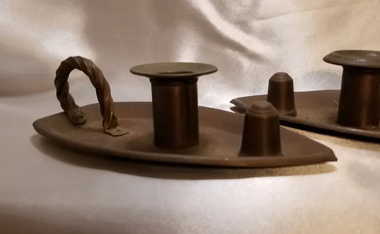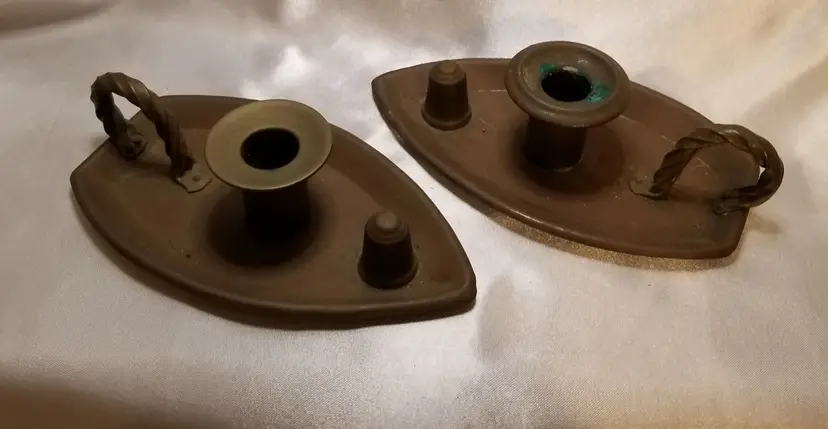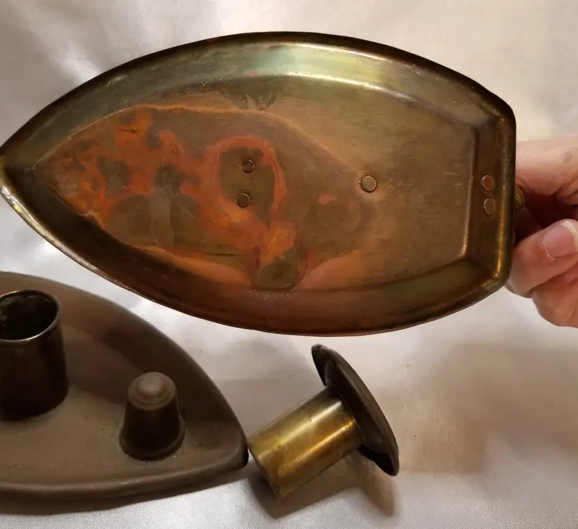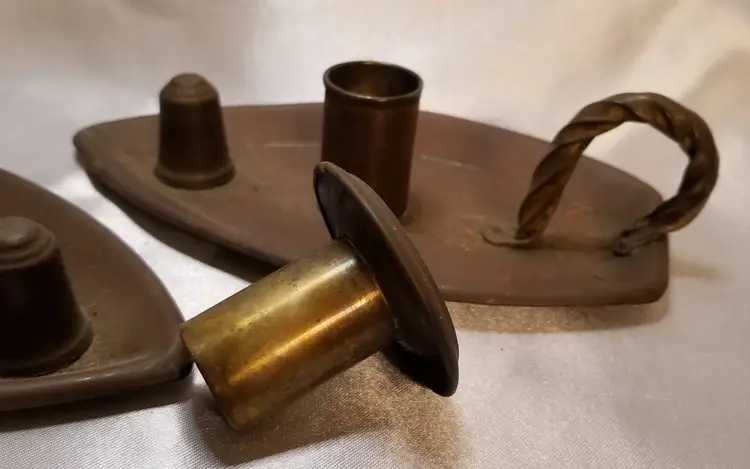 Vintage Primitive Arts & Crafts Copper and Brass Candlestick Holders are each 7 1/2" long x 4 1/8" wide x 2" tall. The one on the right I believe is all original with a copper iron shaped base and candle column with a brass twisted handle and candle insert. The top of the candle insert is also copper. The one on the left I believe has a replacement (albeit old) insert, that is all brass.
