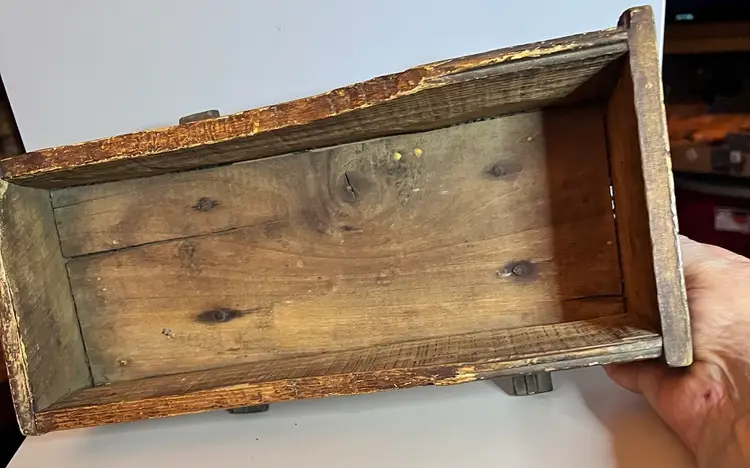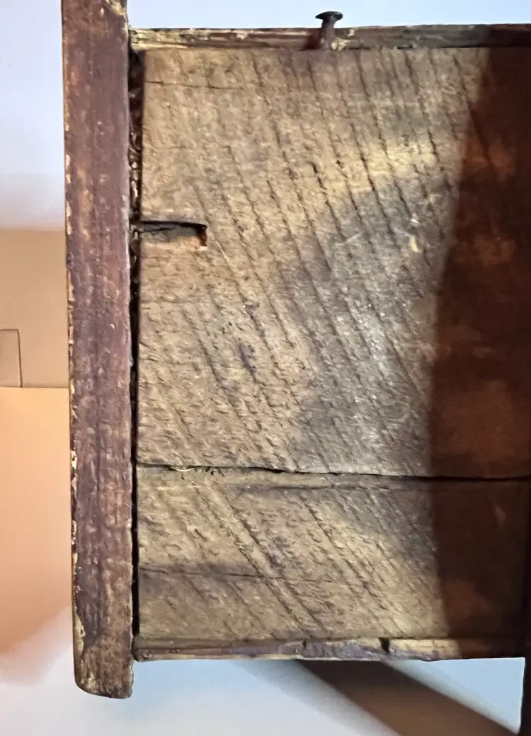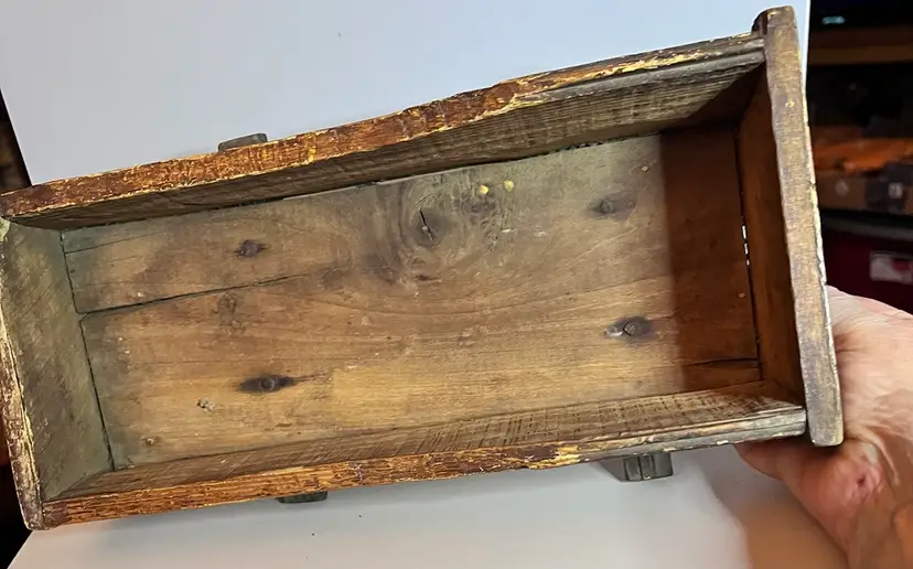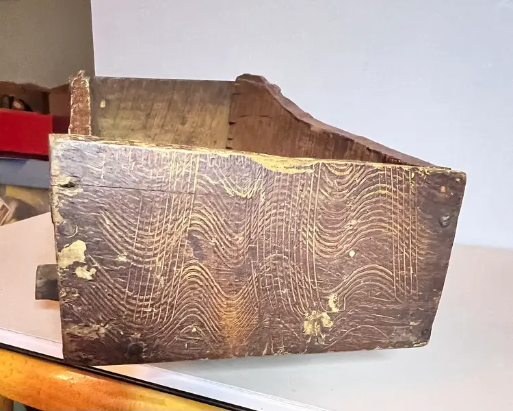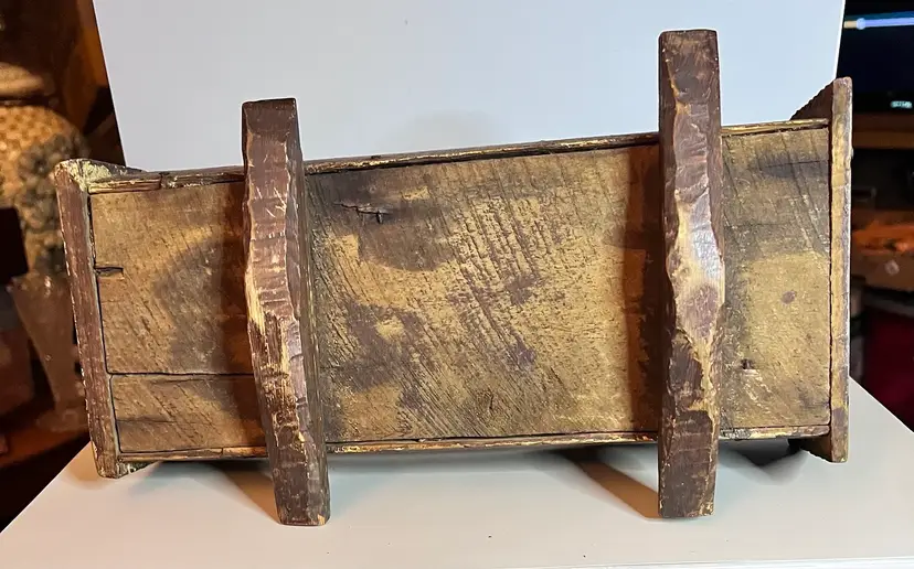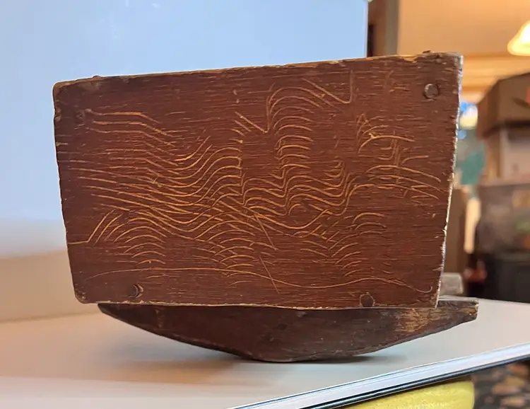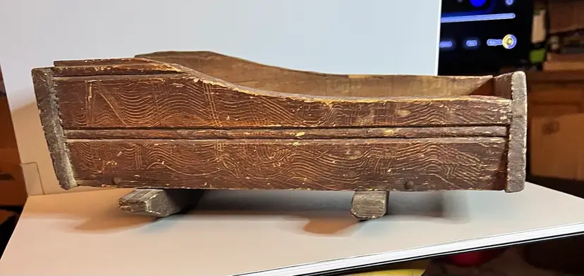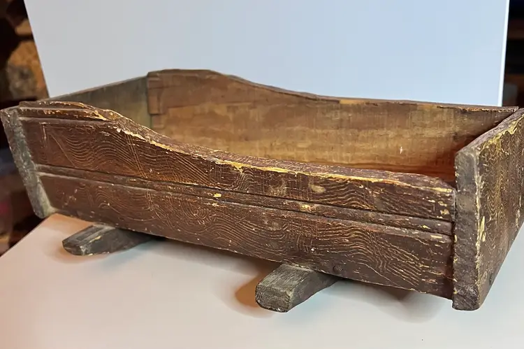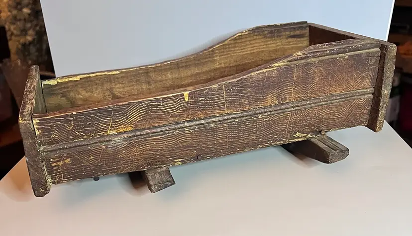 Amazing primitive hand made wooden doll cradle. 12 1/2” long by 5 1/4” wide by 5 “ tall. Small split in wood on bottom of cradle.