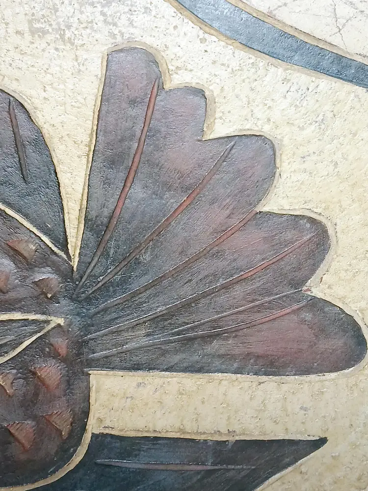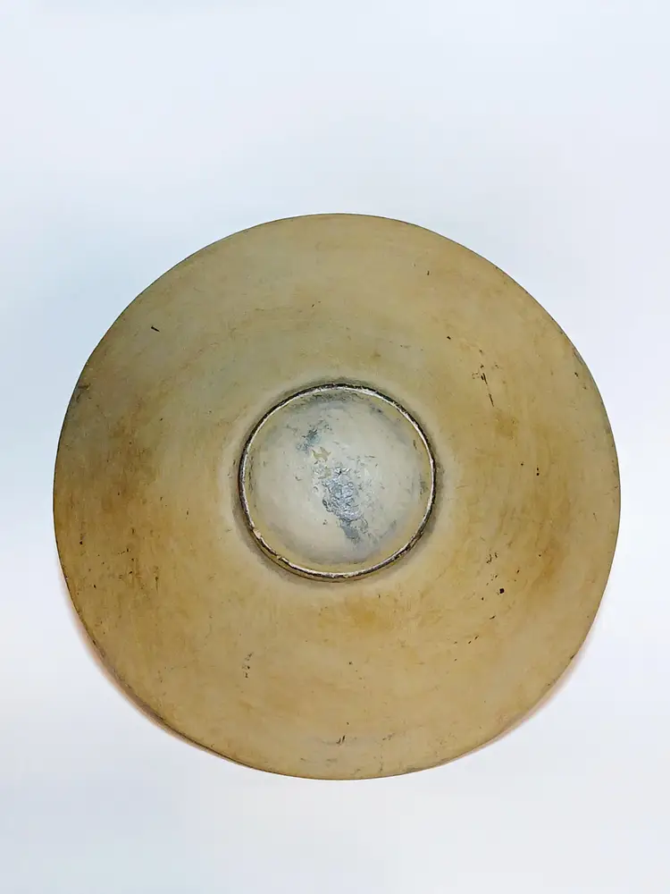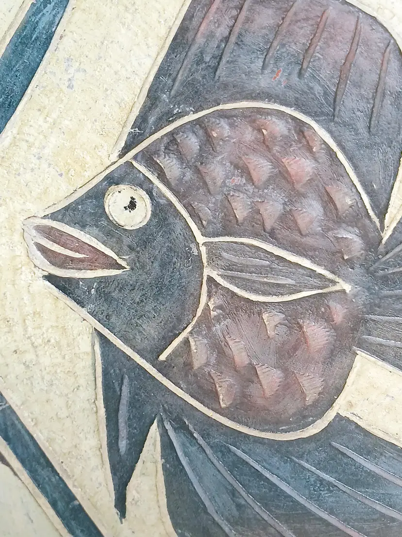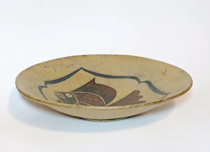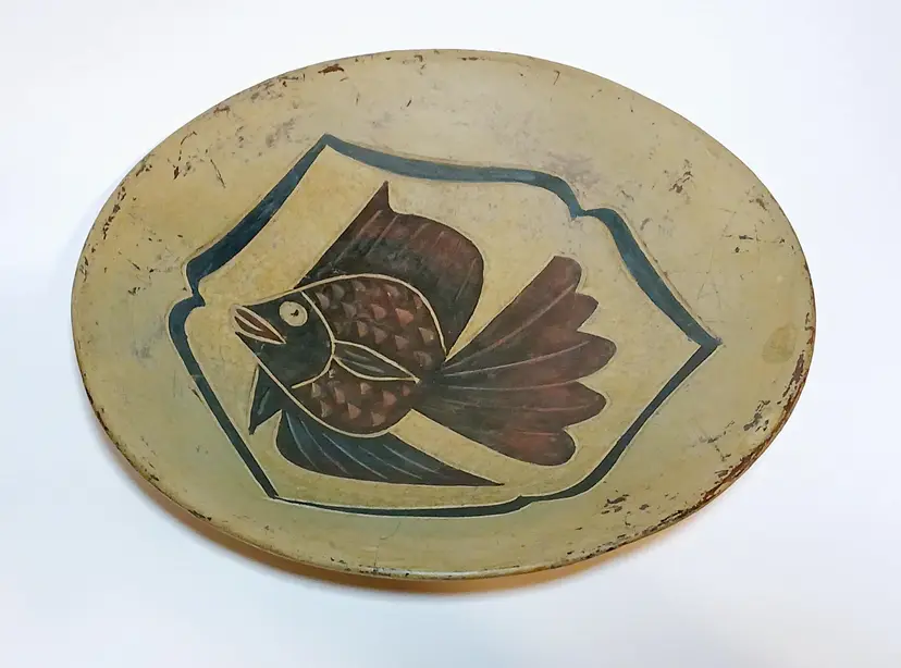 Beautiful primitive stoneware pottery bowl. Featuring an etched tropical fish in the center encompassed in black decorative lines. The origin and maker of this piece is unknown. There is what looks like a crack on one side but it is hard to tell if the crack is in the paint or the pottery. This piece is stable and heavy quality. Please see my photos for details.