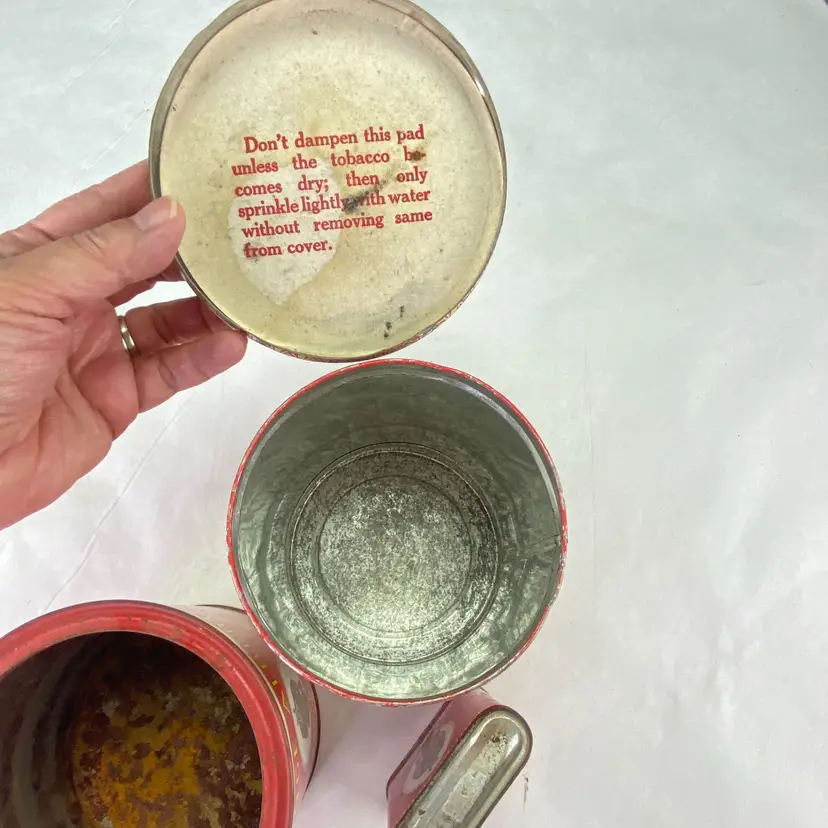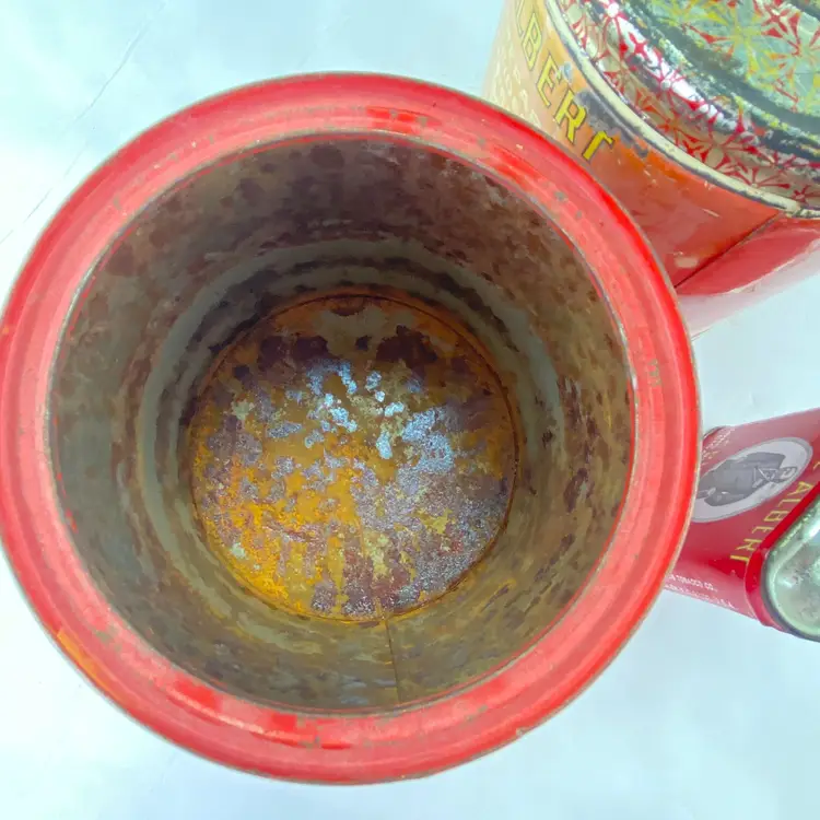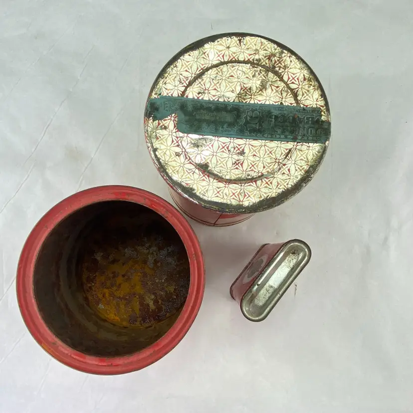 Rust and wear visible on interiors and exteriors, with fading and some paint loss on labels. One tin does not have the lid