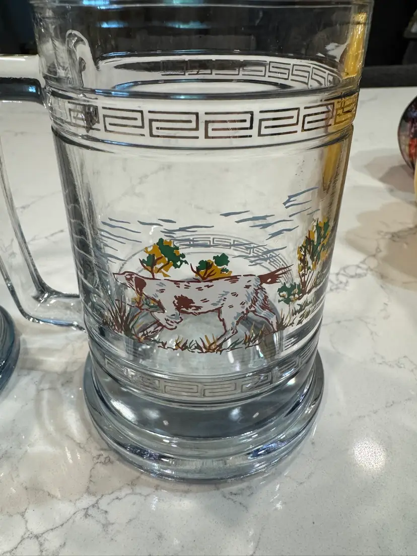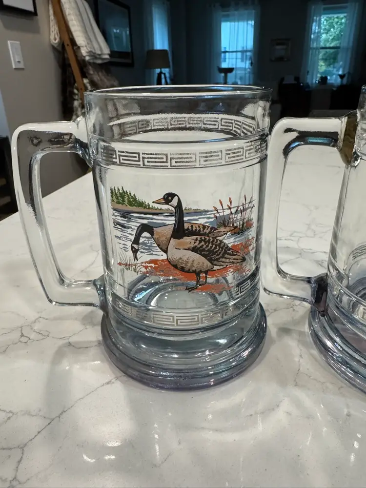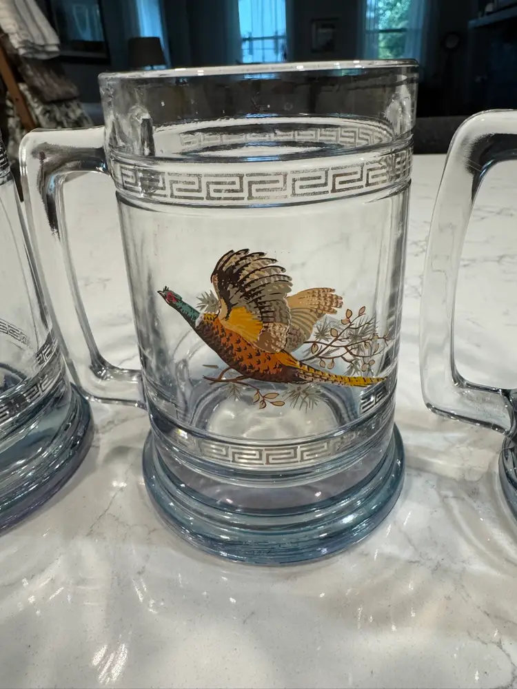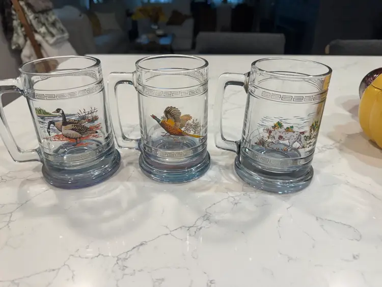 A charming set of three vintage Princess House Colonial Game Bird glass mugs, perfect for collectors or adding a touch of rustic elegance to your kitchen. Each mug in this set features a different detailed game bird illustration - a goose, a pheasant, and a setter, bringing a classic outdoor theme to your drinkware collection. These mugs are made of clear glass with a decorative band at the top and a solid base, showcasing the artistry of Princess House. In excellent pre-owned condition, these mugs show no chips, cracks, or significant wear to the decals. They are ideal for serving beverages, as decorative pieces, or as a thoughtful gift for bird lovers and vintage glass enthusiasts. A unique find that captures the essence of classic Americana and nature-inspired design. decals.
