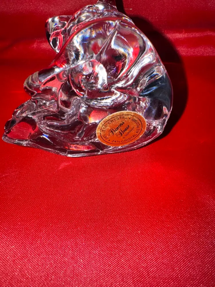 This vintage Princess House Pets Bear Figurine is a collectible made from clear 24% lead crystal. The brand Princess House is known for its quality and elegance in glassware products. This figurine features a charming design of a bear, making it a cute and whimsical addition to any home decor. The clear color adds a touch of sophistication, while the use of crystal material gives it a luxurious feel. Perfect for collectors or those looking to add a special piece to their pottery and glass collection.