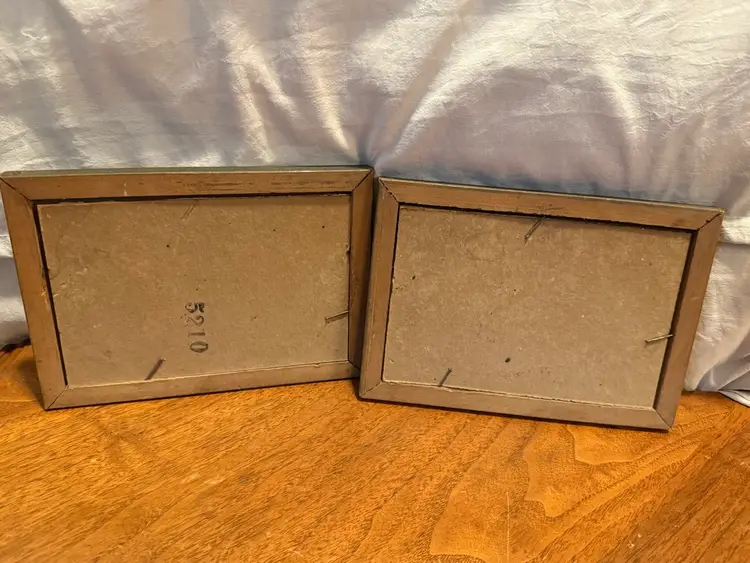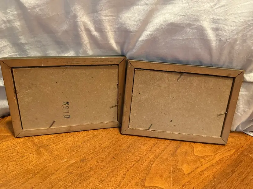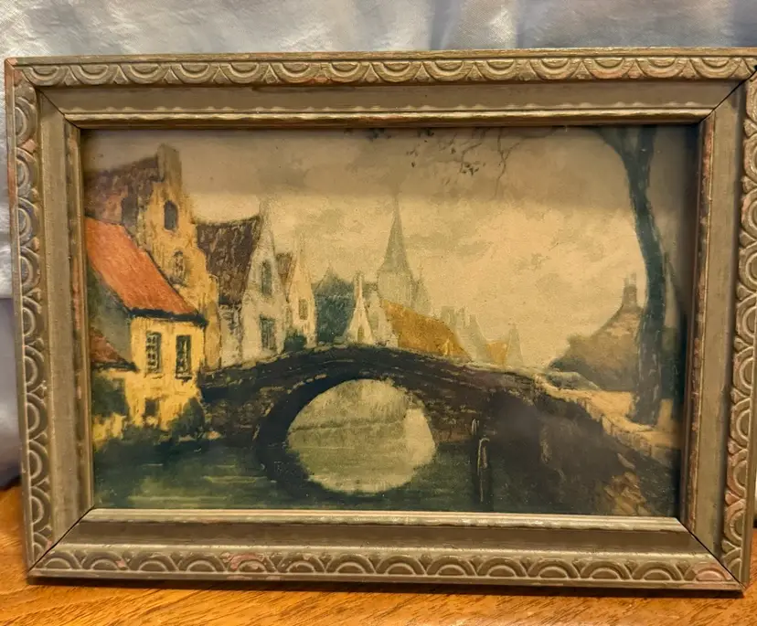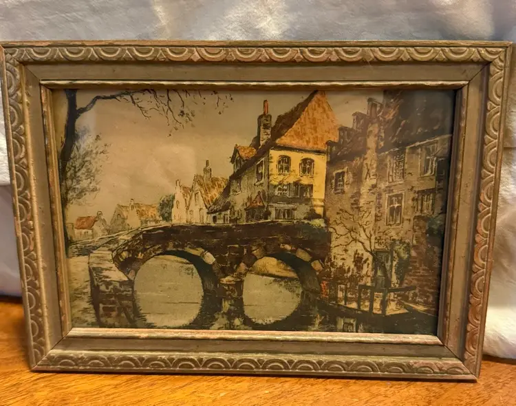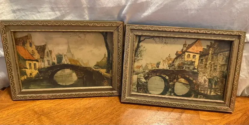 This set of two vintage framed prints, titled "The Old Stone Bridge", features charming landscape scenes. Each print is subtly colored, portraying quaint European village settings with stone bridges spanning waterways. The prints are housed under glass in ornate, distressed wooden frames that complement their antique aesthetic. Perfect for adding a touch of classic charm to any decor. Excellent pre-owned condition with minor wear consistent with age on frames.