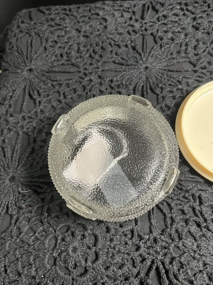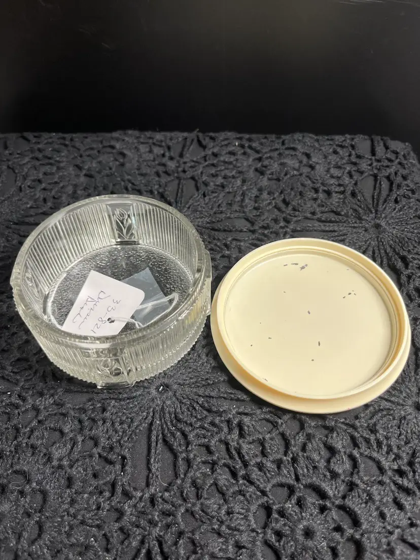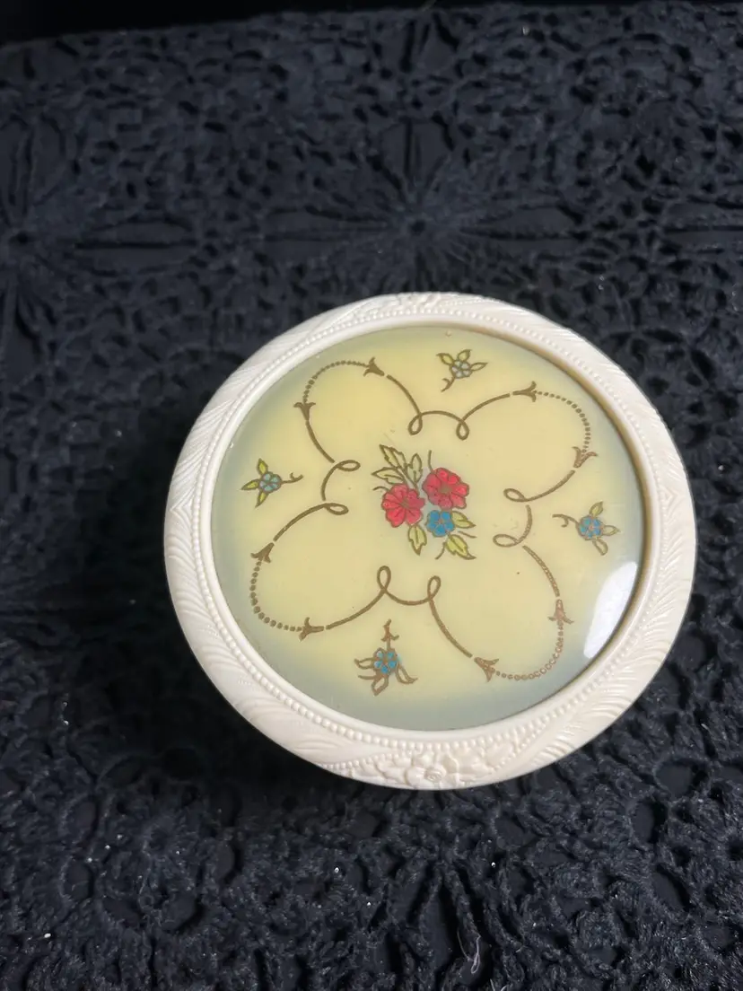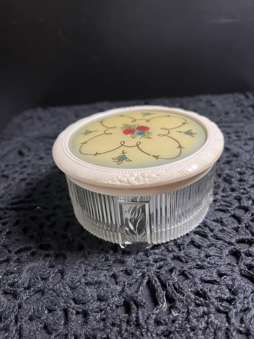 No chips or cracks. In beautiful condition. Small amount of paint wear under cover. 2" H, 4" Diameter, Approx 8.7 Oz