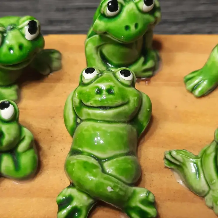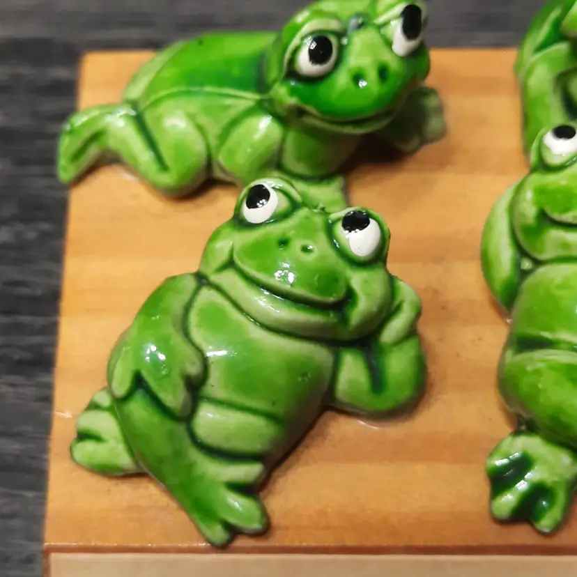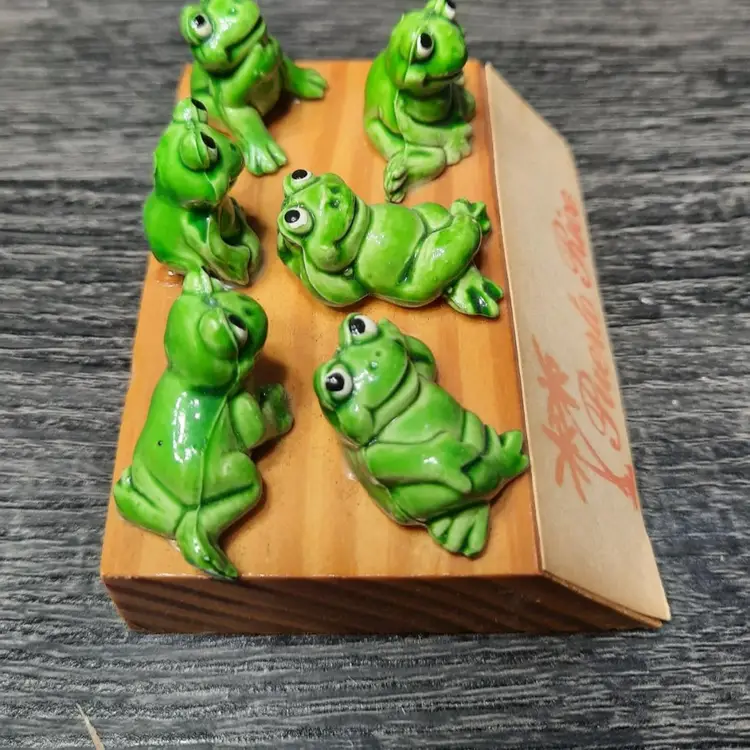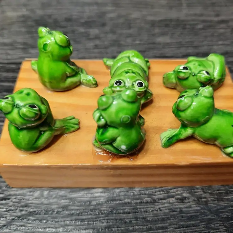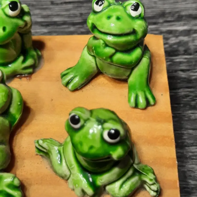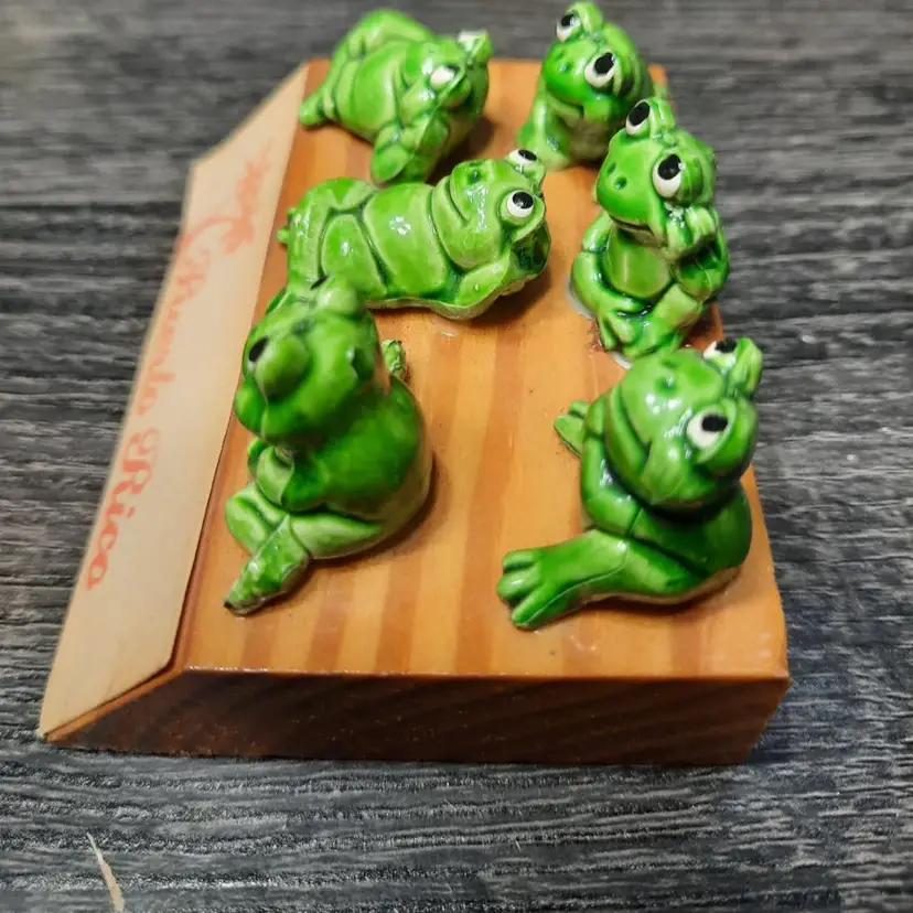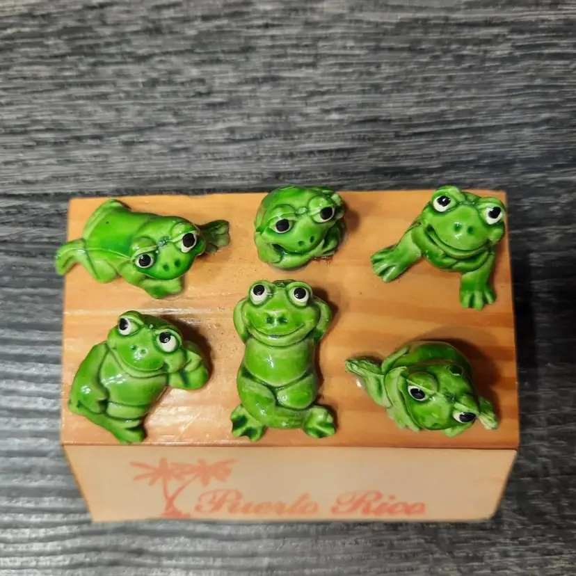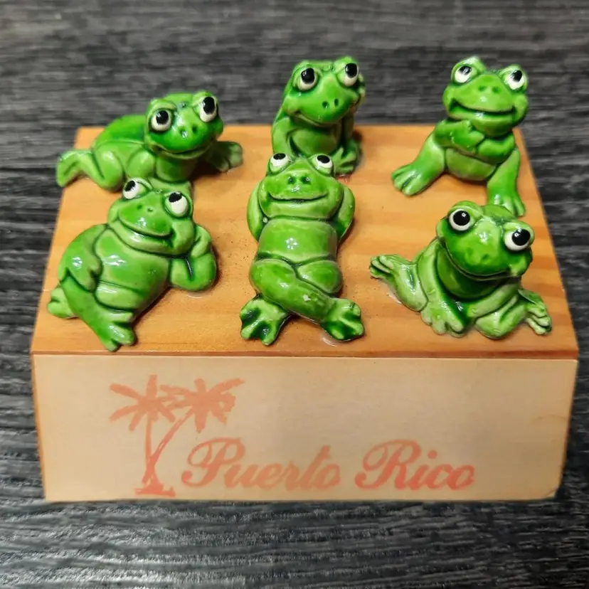Nice vintage souvenir from Puerto Rico. Calling all frog collectors! This adorable decorative piece has 6 frogs mounted on a wood block resembling beach sand. Each frog has a different beach tanning pose. Super cute!