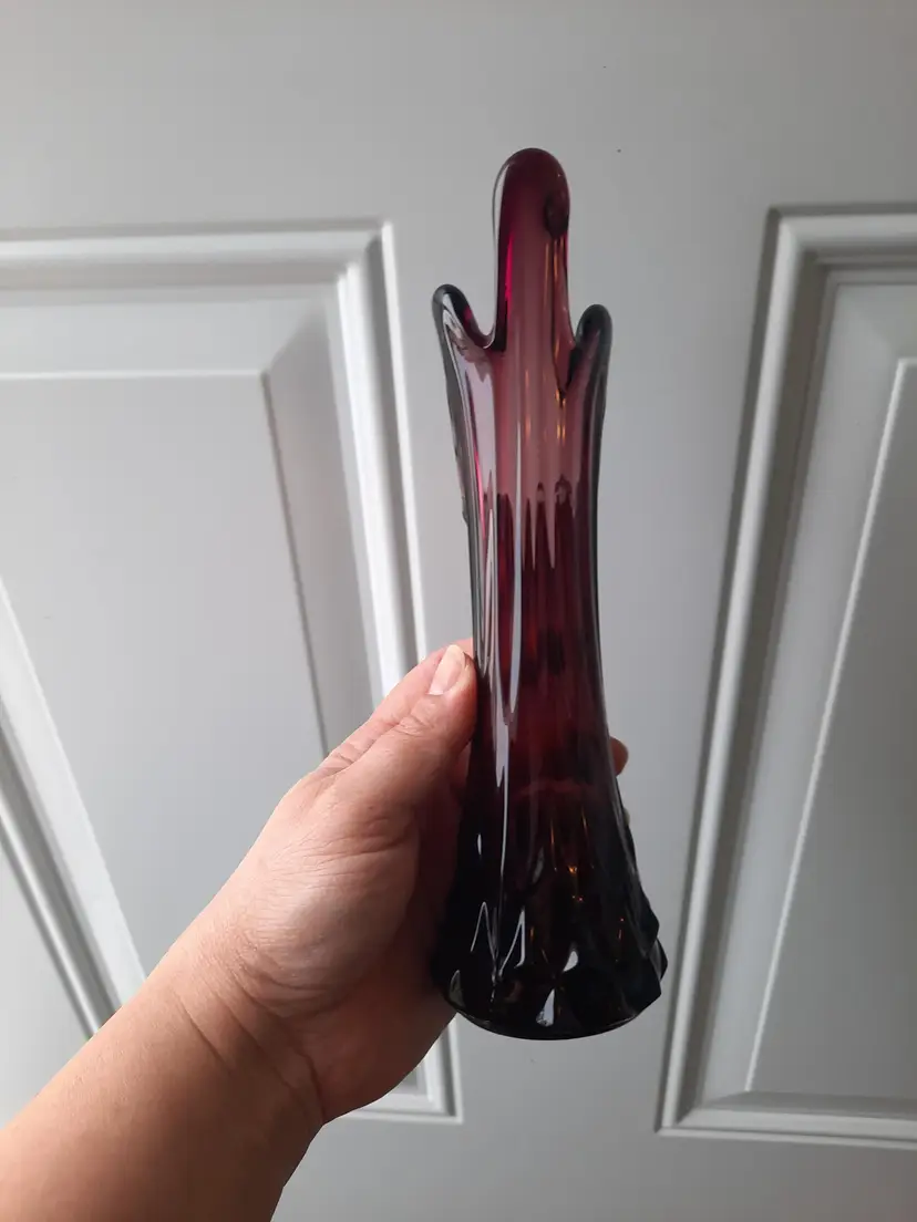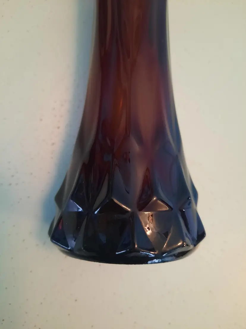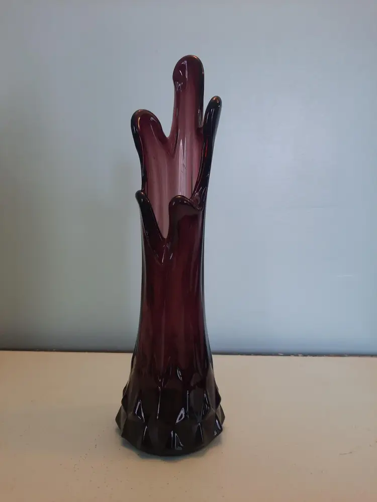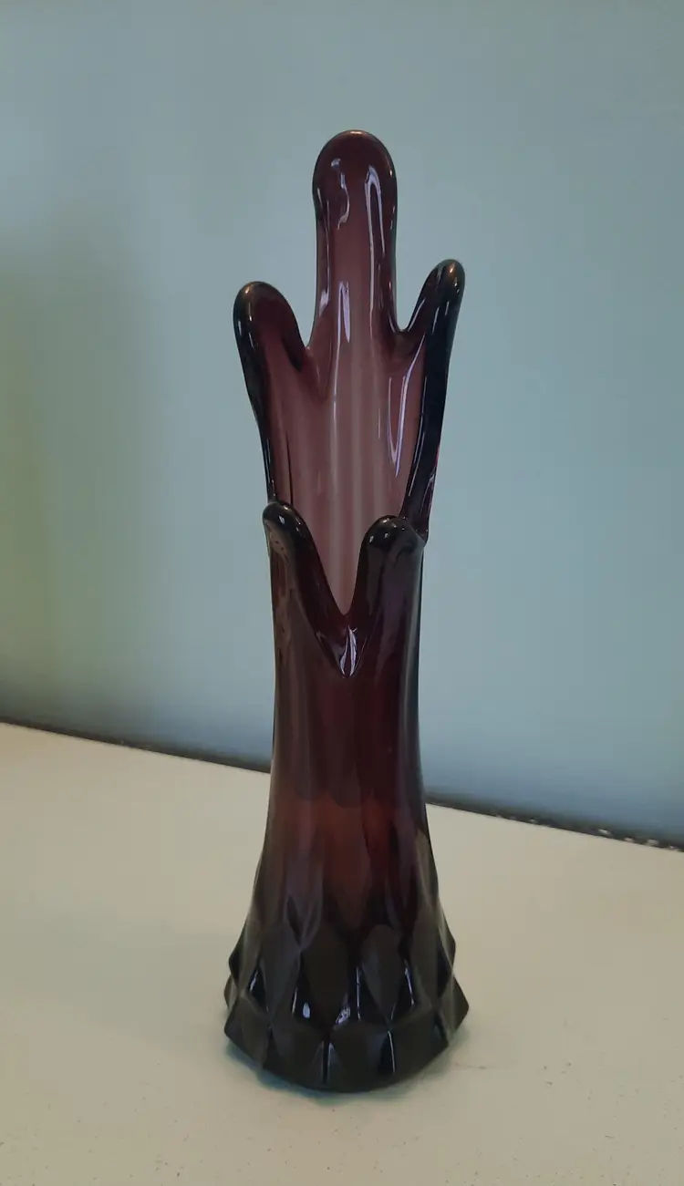 This beautiful vintage five finger swung glass vase is in a stunning shade of amethyst purple. The base of the vase has a hard to find, diamond point pattern, giving it more flare and style. In very good vintage condition, no chips or cracks. Measures approximately 9.5" high with a 2.75” base diameter. Super gorgeous piece!