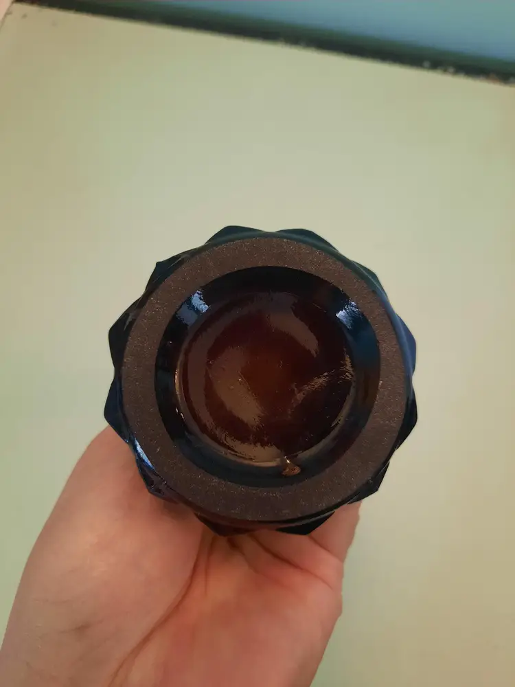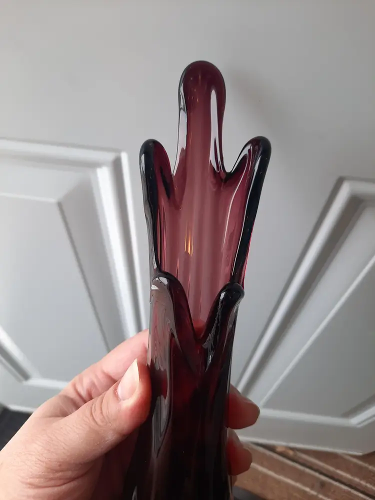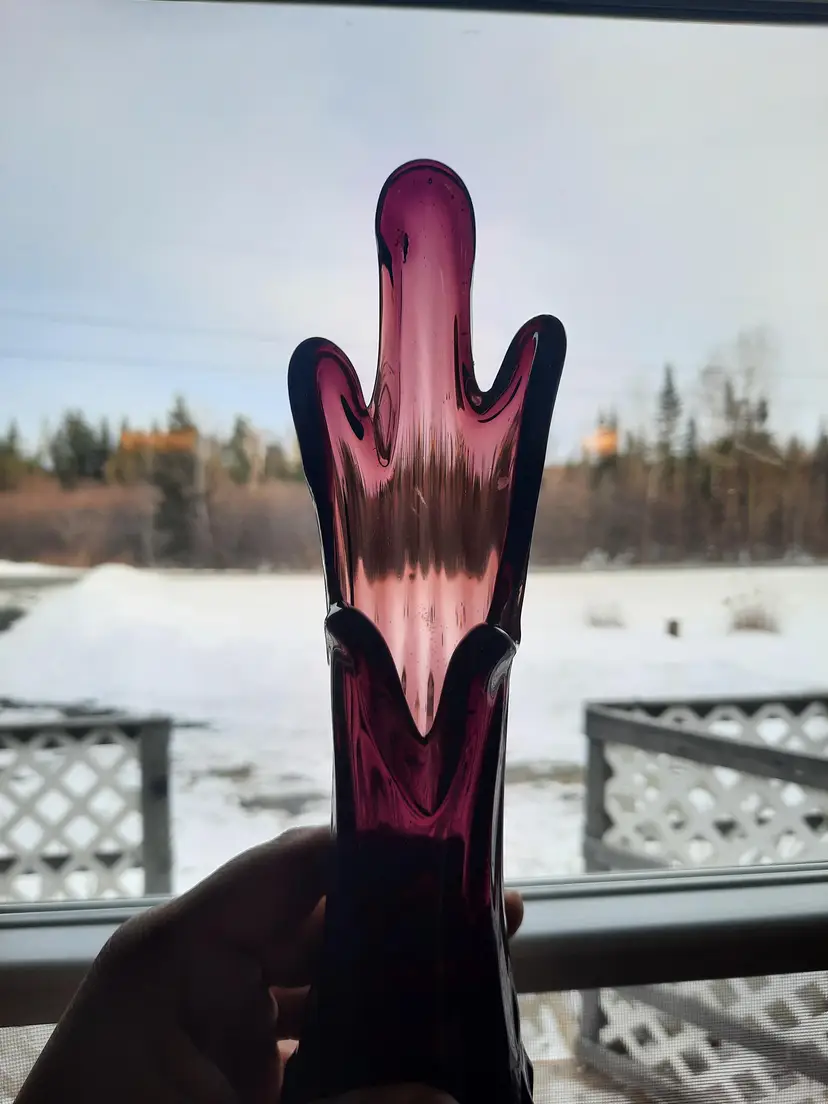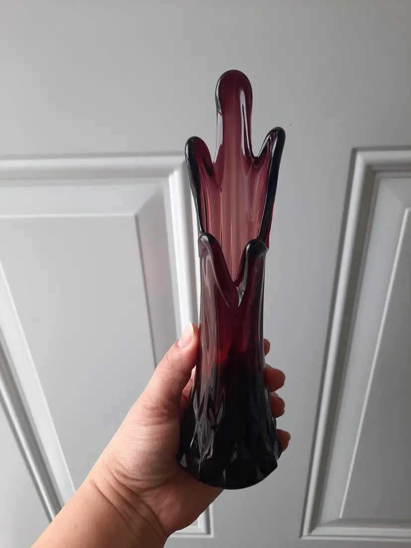 This beautiful vintage five finger swung glass vase is in a stunning shade of amethyst purple. The base of the vase has a hard to find, diamond point pattern, giving it more flare and style. In very good vintage condition, no chips or cracks. Measures approximately 9.5" high with a 2.75” base diameter. Super gorgeous piece!
