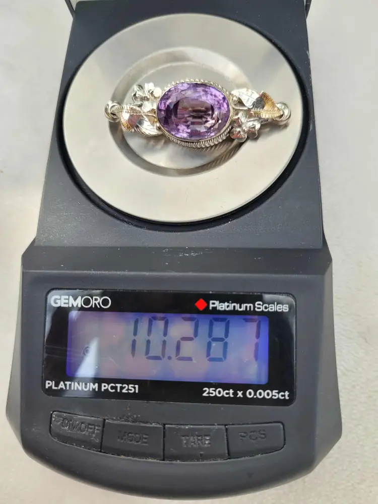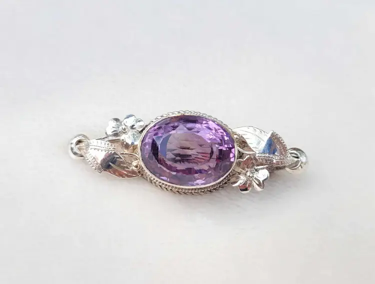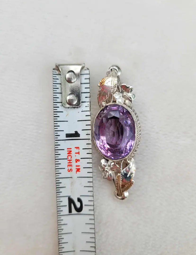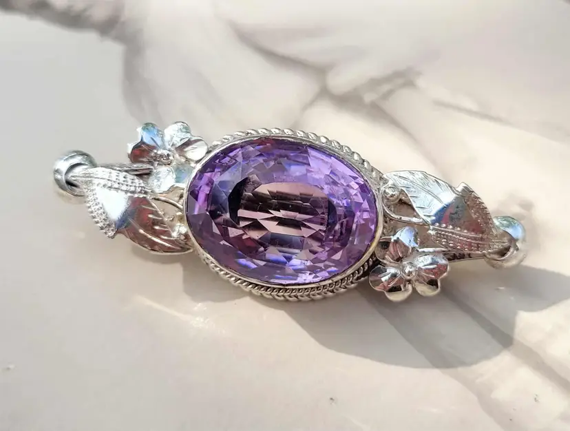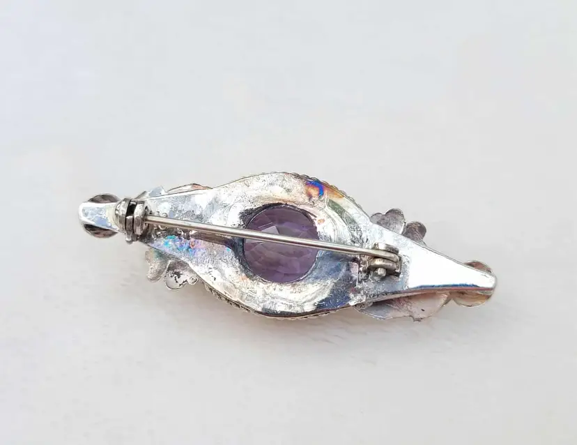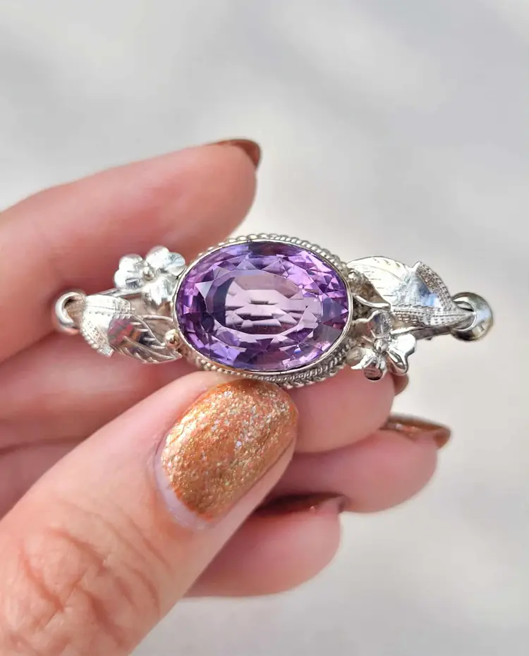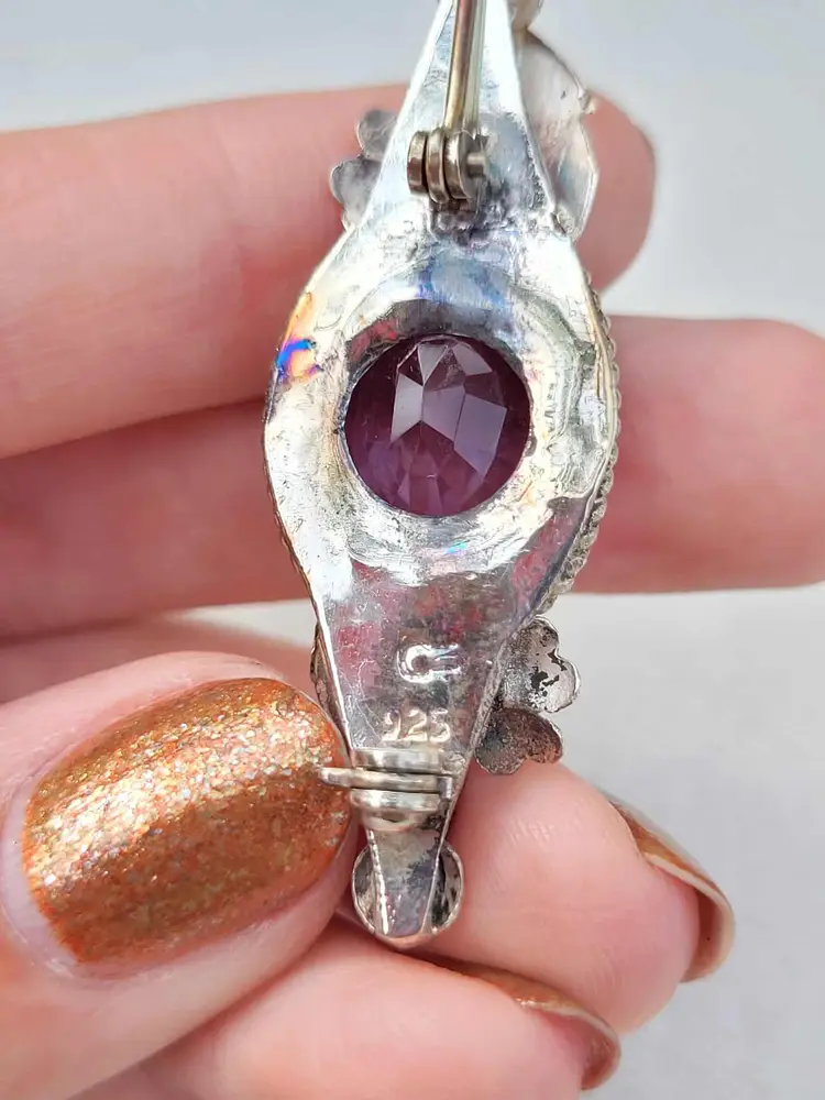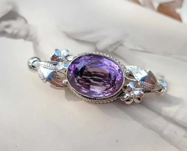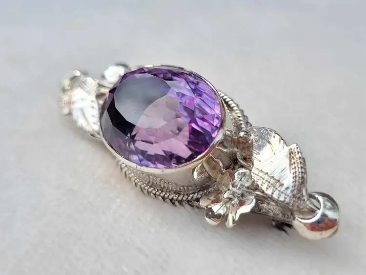 Large rich purple amethyst with exceptional faceting, set in a solid sterling silver brooch with accent flowers that appear to be violets. This is a really outstanding artisan piece that is signed by the maker but I've been unable to identify who it is. It is in good condition with the gemstone verified via Presidium tester, please see pictures for details and measurements.
