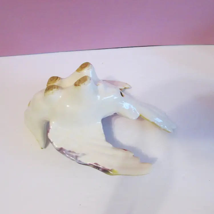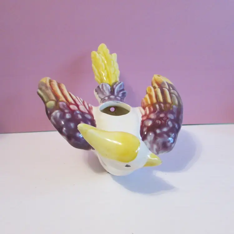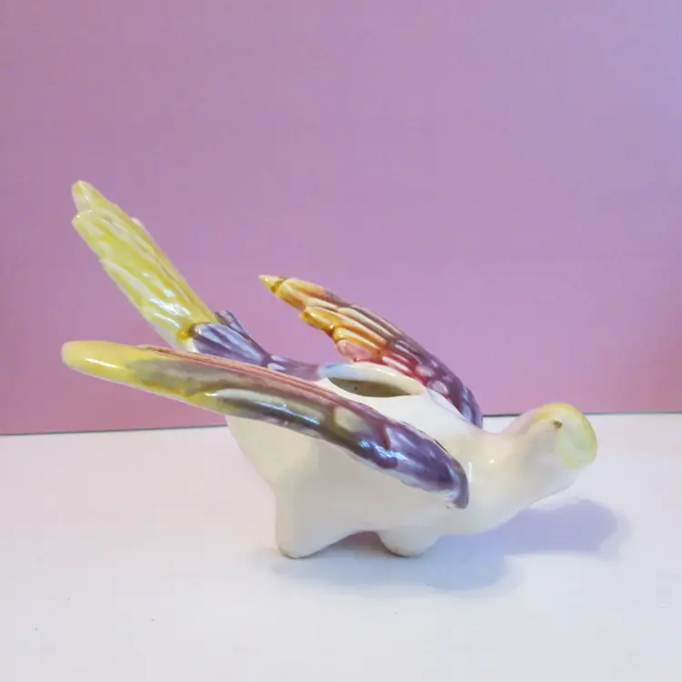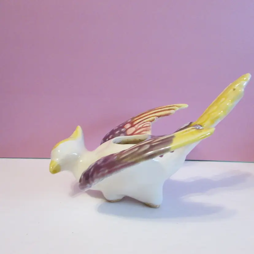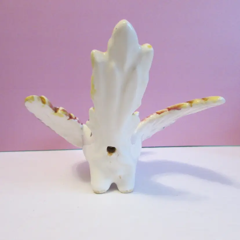This adorable planter has some wear, the paint has rubbed off on one eye, but still a lovely piece. It reminds me of a griffin because of the base, but it could also be a bird. There is a hole under the tail, maybe so it could be hung. It is about 5" x 5 1/2" x 7 1/2".