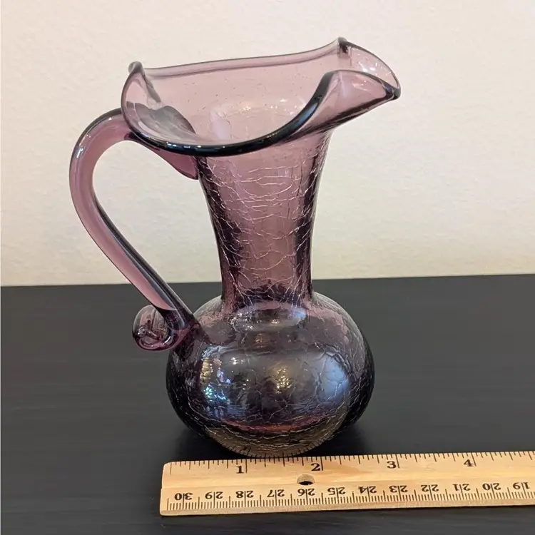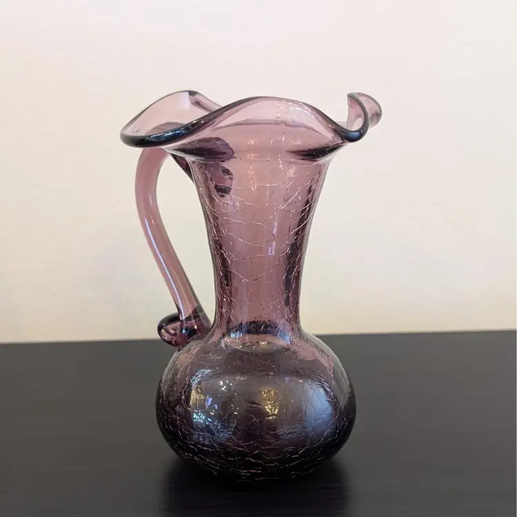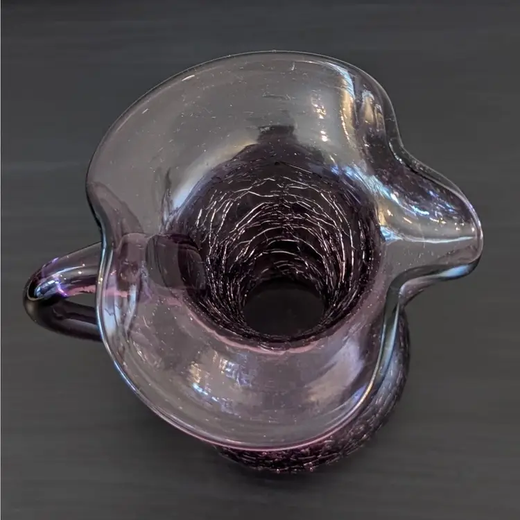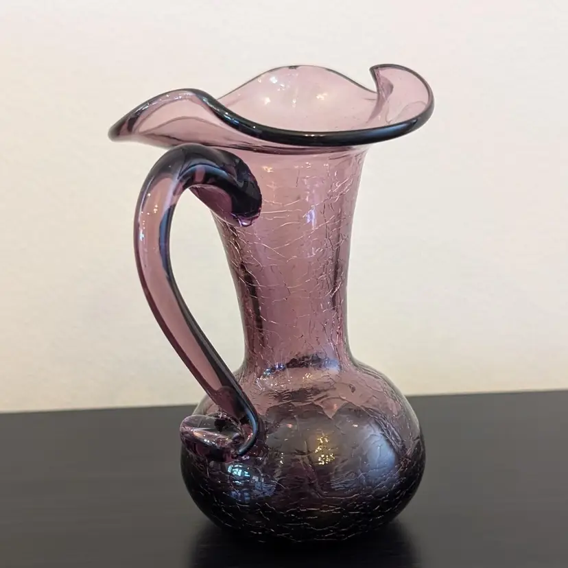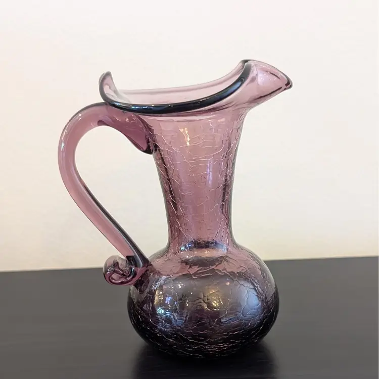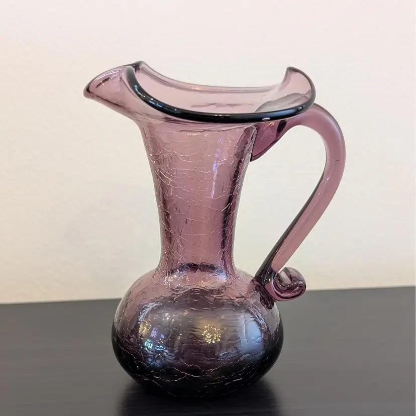 Beautiful, purple crackle glass pitcher. It is hand blown with an applied handle. It is in great, used condition and the color if much prettier than the pictures show. The picture of the bottom has shows the color best.