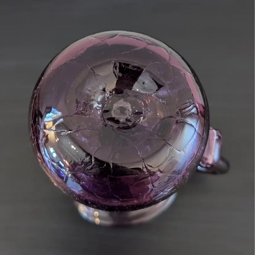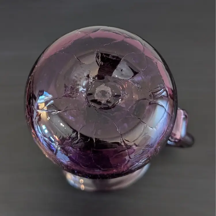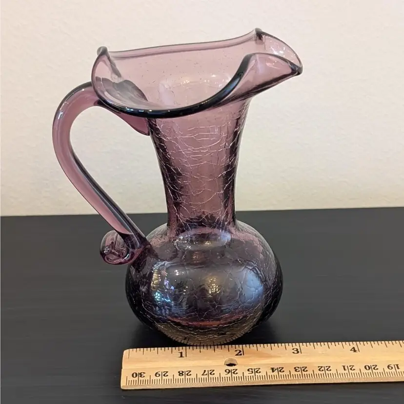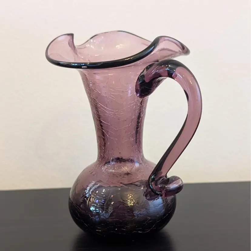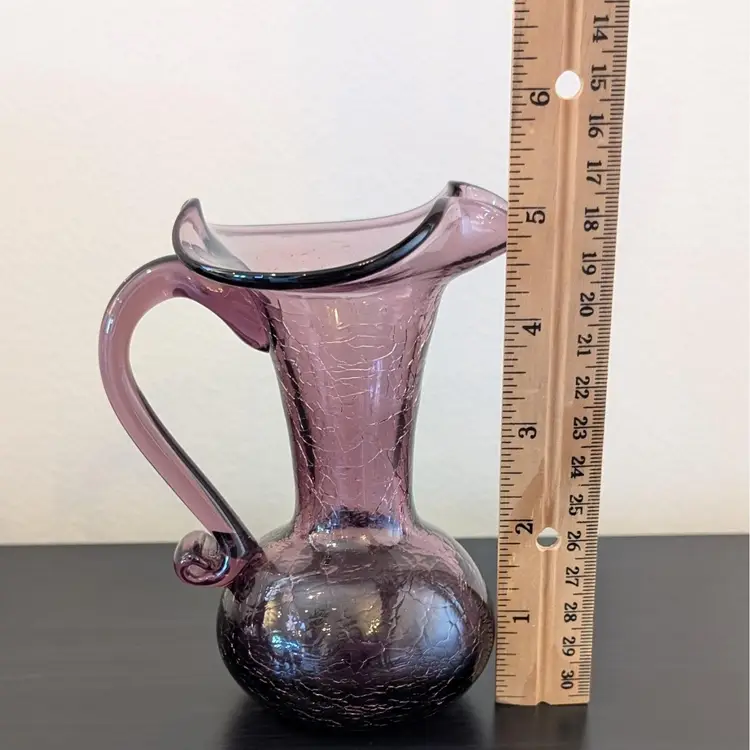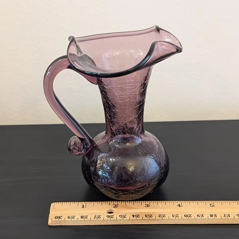 Beautiful, purple crackle glass pitcher. It is hand blown with an applied handle. It is in great, used condition and the color if much prettier than the pictures show. The picture of the bottom has shows the color best.