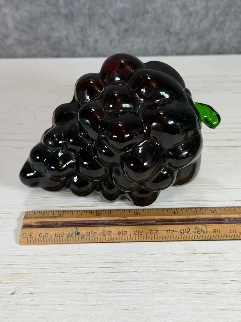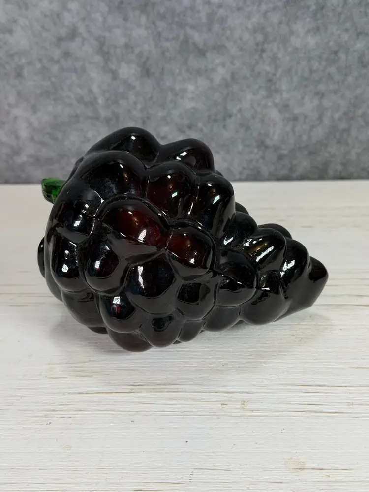 Rich deep purple glass grapes with green leaf detail—beautiful mid-century style piece. Perfect as a paperweight, shelf decor, or kitchen accent.