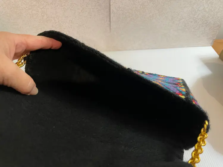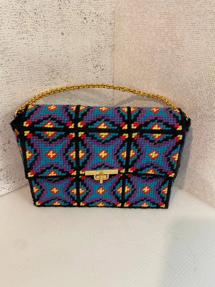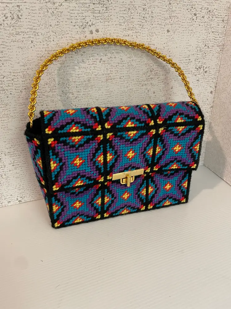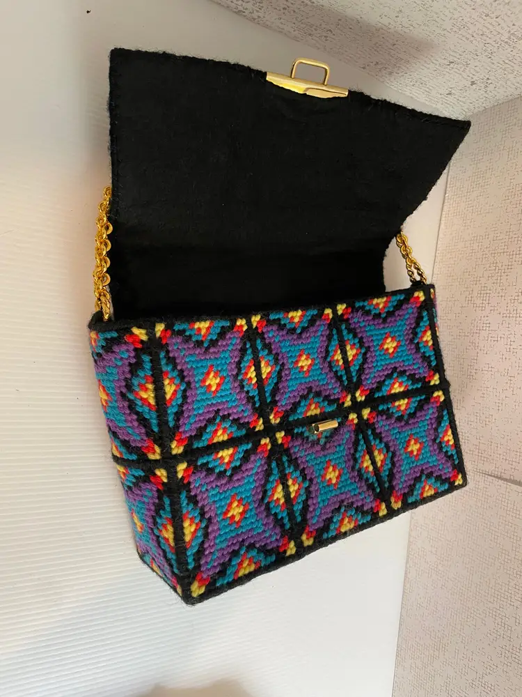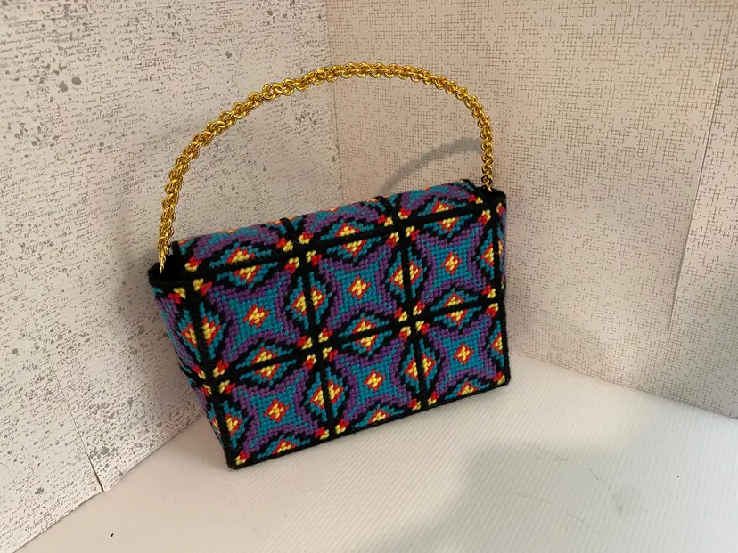 Granny Core all the way! This is a well kept, well made, vintage needlepoint on plastic canvas purse. It was definitely loved and treasured. The inside is lined with black felt. The clasp and handle are gold colored.