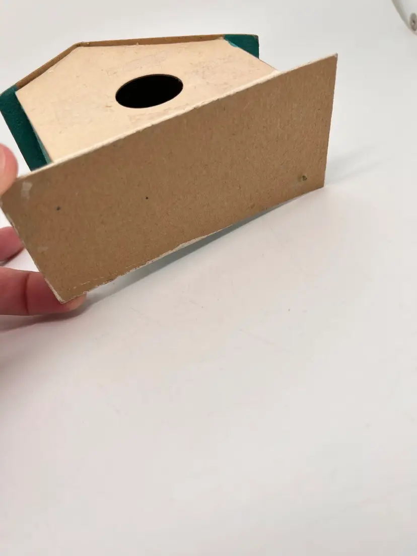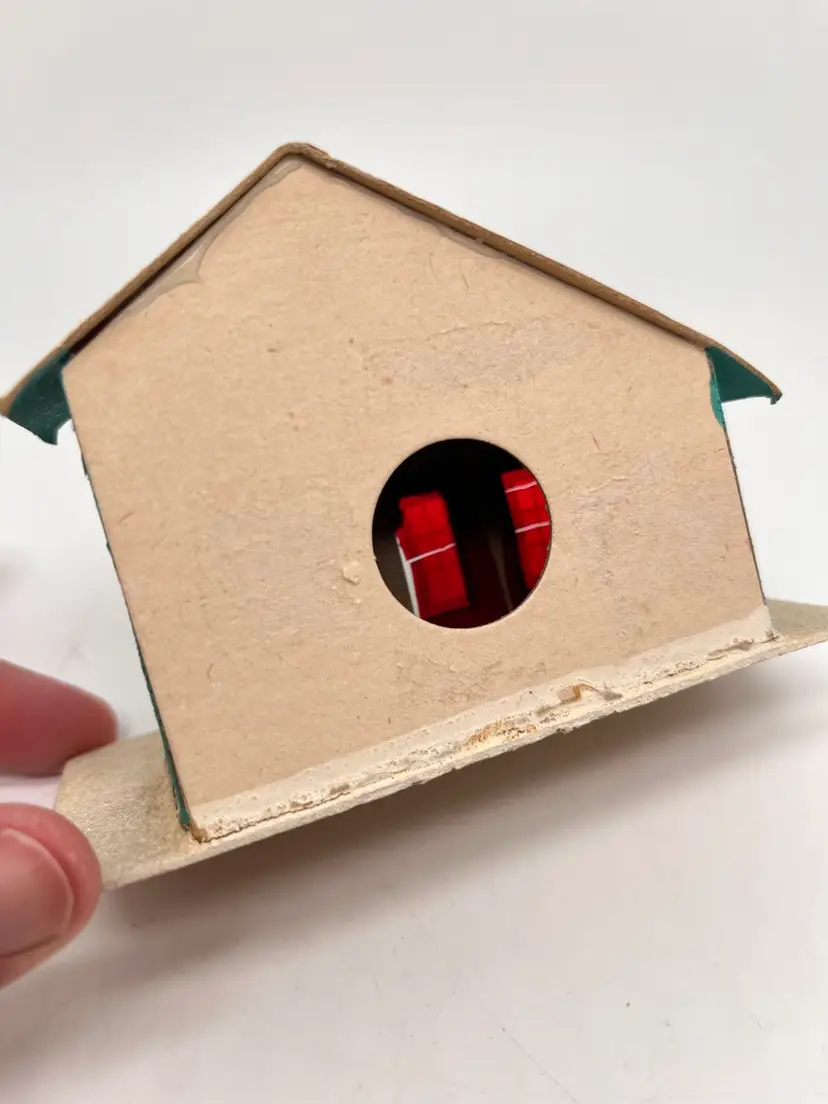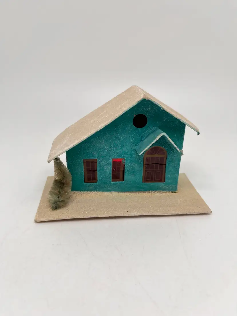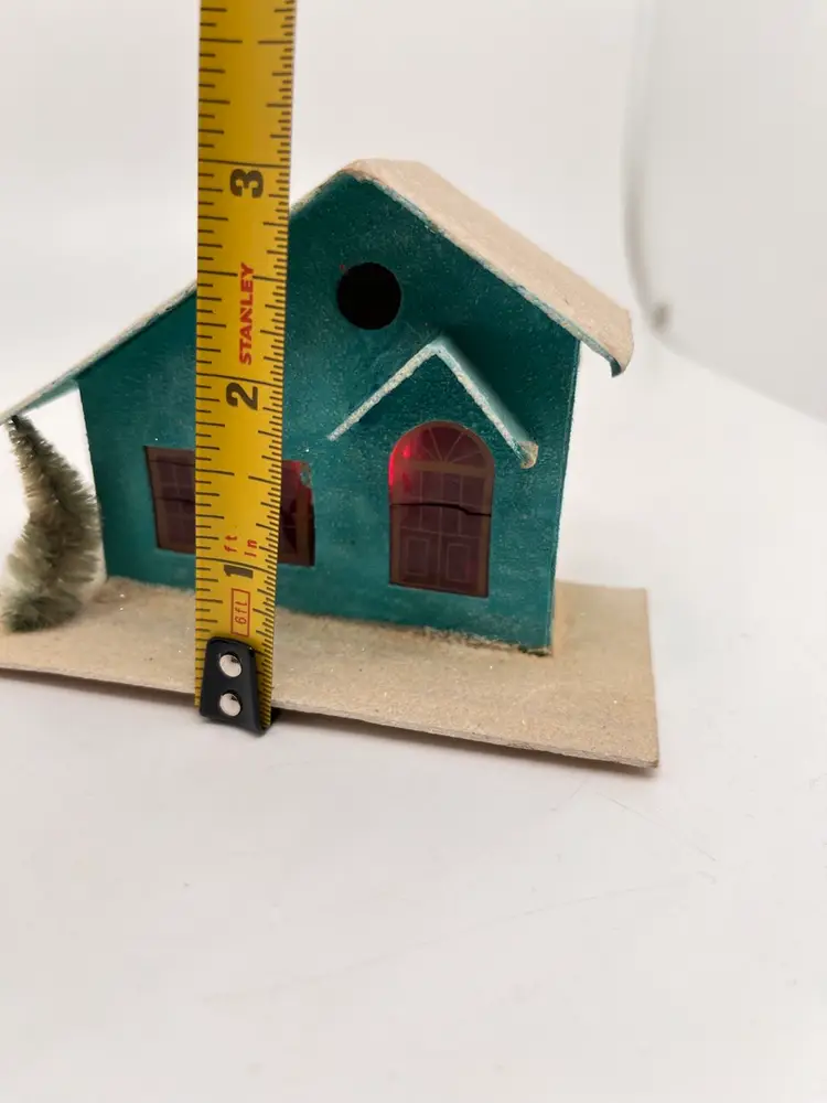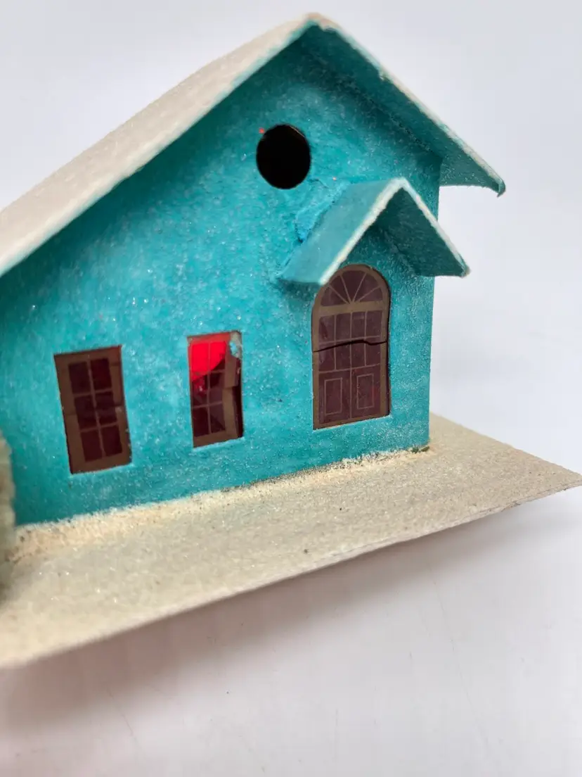 Vintage Putz Christmas teal house. The very thin and delicate foil that are in the windows are torn but still there. See all photos. 1950s-1960s.