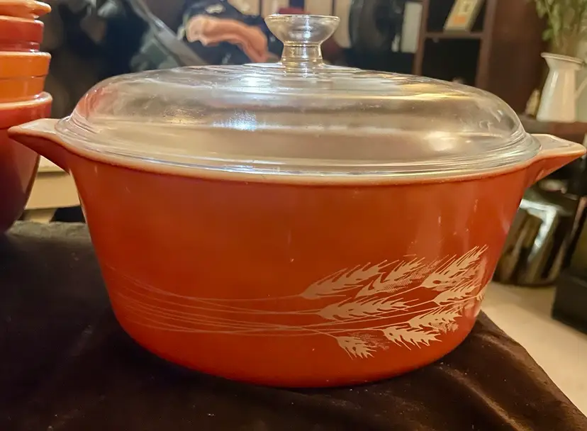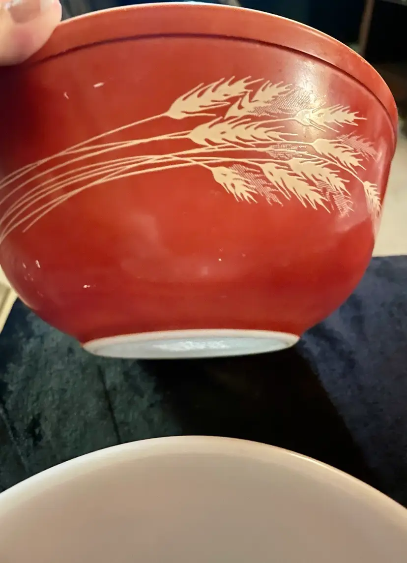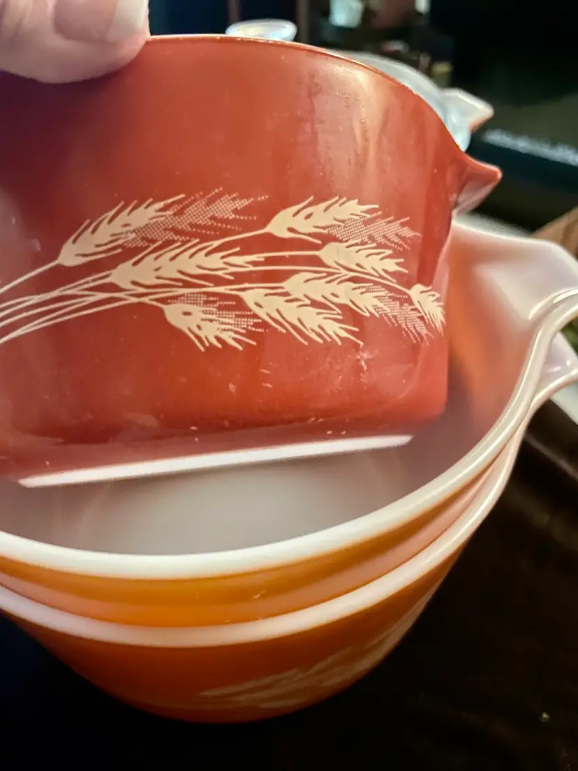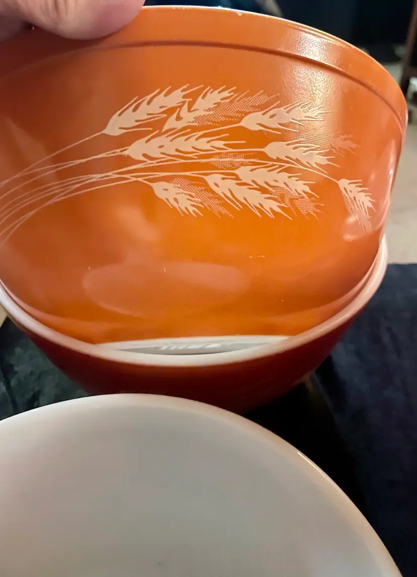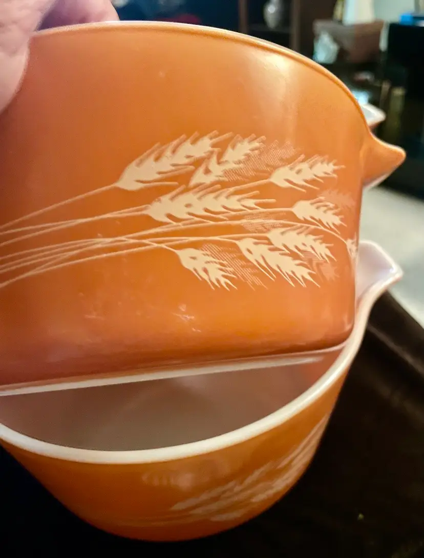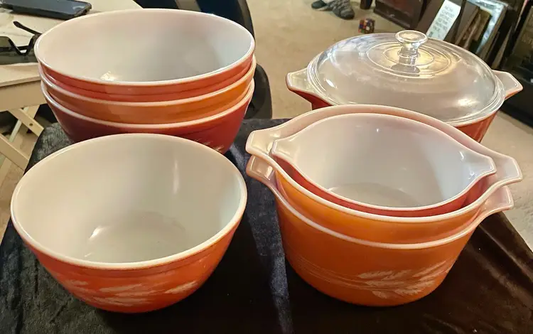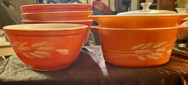 Vintage Pyrex Autumn Harvest Wheat Cinderella Nesting Mixing Bowl Set Of 9 Some areas have discoloration and few scratches. See pics. Condition is Used. Shipped with USPS Mail